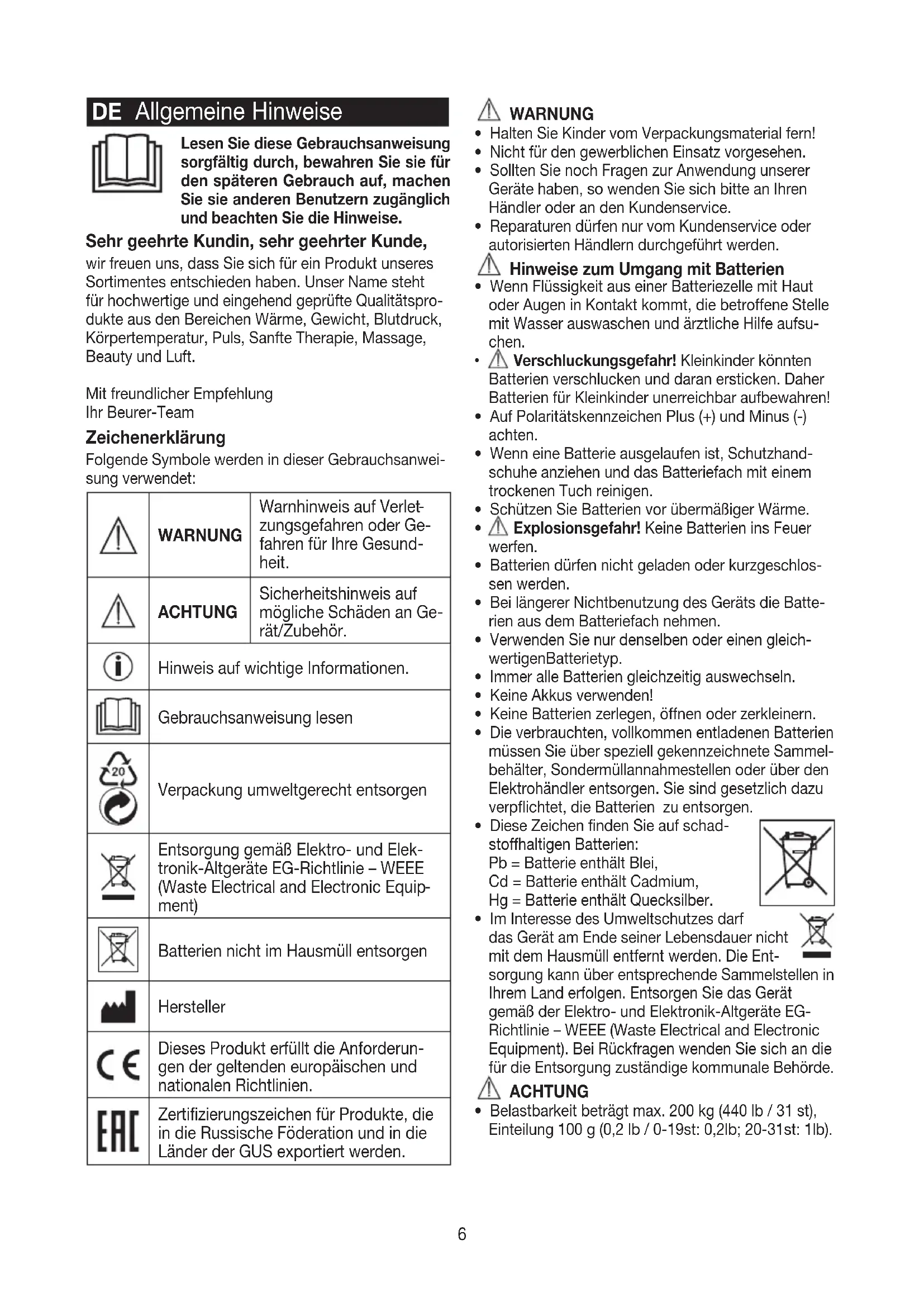 max 200 kg440 lb31 st6 DE Allgemeine Hinweise Lesen Sie diese Gebrauchsanweisung sorgfältig durch, bewahren Sie sie für den späteren Gebrauch auf, machen Sie sie anderen Benutzern zugänglich und beachten Sie die Hinweise. Sehr geehrte Kundin, sehr geehrter Kunde, wir freuen uns, dass Sie sich für ein Produkt unseres Sortimentes entschieden haben. Unser Name steht für hochwertige und eingehend geprüfte Qualitätspro- dukte aus den Bereichen Wärme, Gewicht, Blutdruck, Körpertemperatur, Puls, Sanfte Therapie, Massage, Beauty und Luft. Mit freundlicher Empfehlung Ihr Beurer-Team Zeichenerklärung Folgende Symbole werden in dieser Gebrauchsanwei- sung verwendet: WARNUNG Warnhinweis auf Verlet