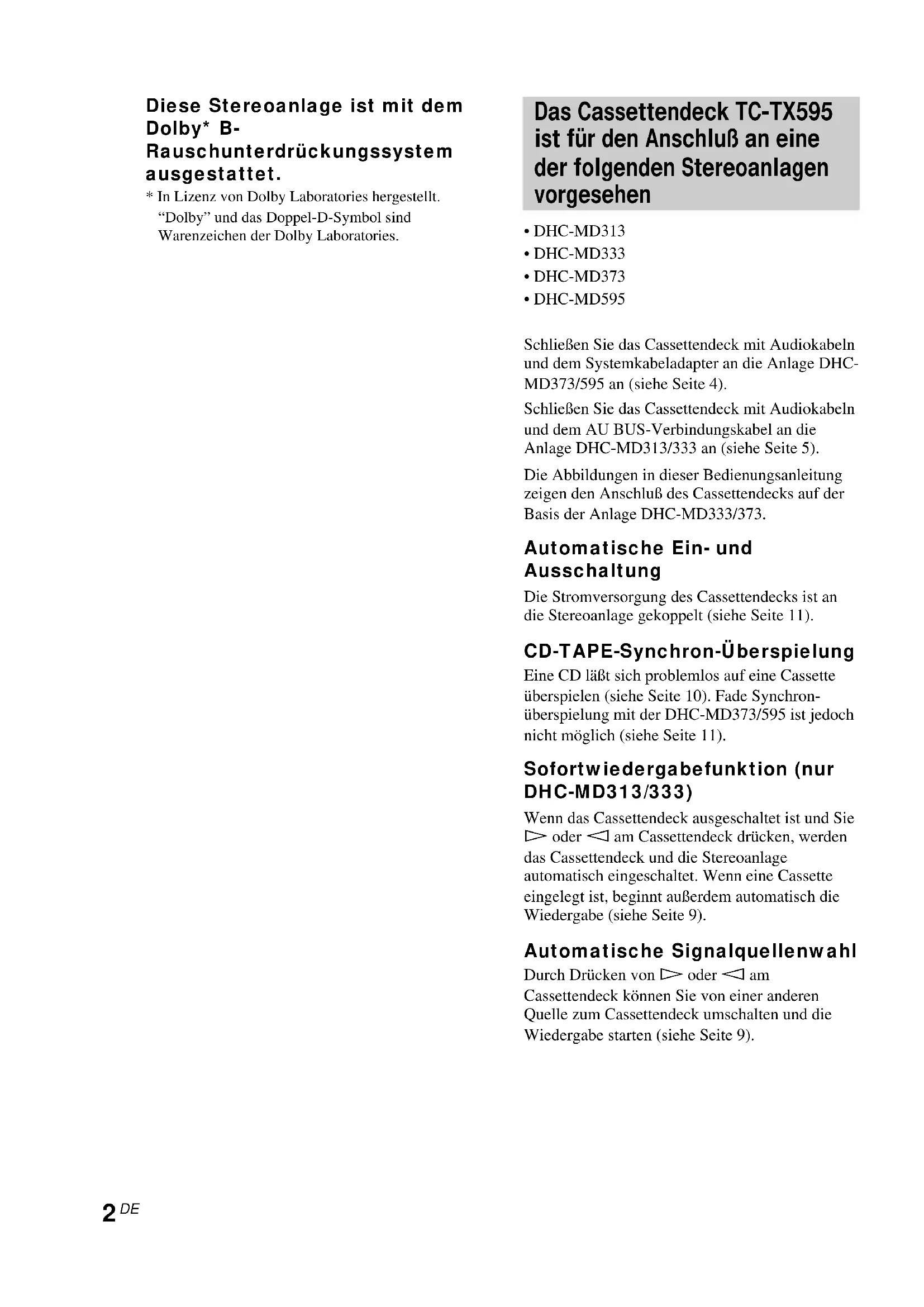 - DHC-MD595 Schließen Sie das Cassettendeck mit Audiokabeln und dem Systemkabeladapter an die Anlage DHC- MD373/595 an (siehe Seite 4). Schließen Sie das Cassettendeck mit Audiokabeln und dem AU BUS-Verbindungskabel an die Anlage DHC-MD313/333 an (siehe Seite 5). Die Abbildungen in dieser Bedienungsanleitung zeigen den Anschluß des Cassettendecks auf der Basis der Anlage DHC-MD333/373. Automatische Ein- und Ausschaltung Die Stromversorgung des Cassettendecks ist an die Stereoanlage gekoppelt (siehe Seite 11). CD-TAPE-Synchron-Überspielung Eine CD läßt sich problemlos auf eine Cassette überspielen (siehe Seite 10). Fade Synchron- überspielung mit der DHC-MD373/595 ist jedoch nicht möglich (siehe Seite 11). Sofortwiedergabefunktion (nur DHC-MD313/333) Wenn das Cassettendeck ausgeschaltet ist und Sie H oder h am Cassettendeck drücken, werden das Cassettendeck und die Stereoanlage automatisch eingeschaltet. Wenn eine Cassette eingelegt ist, beginnt außerdem automatisch die Wiedergabe (siehe Seite 9). Automatische Signalquellenwahl Durch Drücken von H oder h am Cassettendeck können Sie von einer anderen Quelle zum Cassettendeck umschalten und die Wiedergabe starten (siehe Seite 9).3