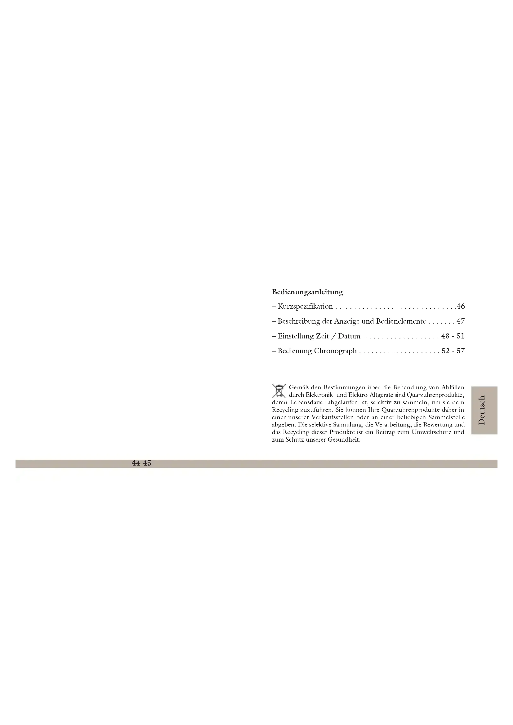 - - 51 – Bedienung Chronograph - 57 Deutsch Gemäß den Bestimmungen über die Behandlung von Abfällen durch Elektronik- und Elektro-Altgeräte sind Quarzuhrenprodukte, deren Lebensdauer abgelaufen ist, selektiv zu sammeln, um sie dem Recycling zuzuführen. Sie können Ihre Quarzuhrenprodukte daher in einer unserer Verkaufsstellen oder an einer beliebigen Sammelstelle abgeben. Die selektive Sammlung, die Verarbeitung, die Bewertung und das Recycling dieser Produkte ist ein Beitrag zum Umweltschutz und zum Schutz unserer Gesundheit.46 Kurzspezifikation Zeit/Datum p. 52