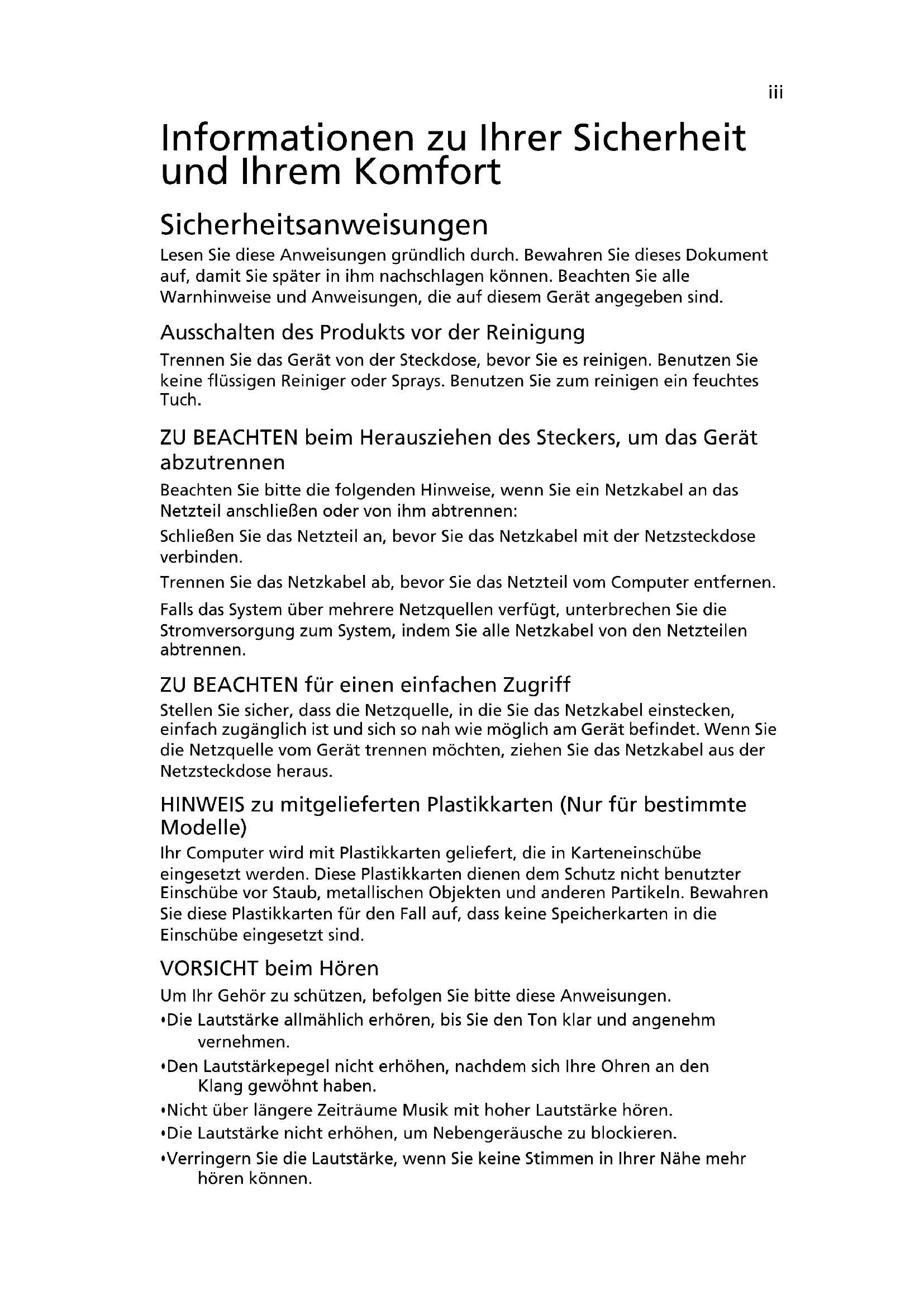 - v'n Pixel fault class Class IITravelMate Serie Allgemeine BedienungsanleitungModellnummer: ___________________________________ Seriennummer: ____________________________________ Kaufdatum: _______________________________________ Kaufort: __________________________________________ © 2011 Alle Rechte vorbehalten. Allgemeine Bedienungsanleitung für TravelMate Serie Originalausgabe: 02/2011iii Informationen zu Ihrer Sicherheit und Ihrem Komfort Sicherheitsanweisungen Lesen Sie diese Anweisungen gründlich durch. Bewahren Sie dieses Dokument auf, damit Sie später in ihm nachschlagen können. Beachten Sie alle Warnhinweise und Anweisungen, die auf diesem Gerät angegeben sind. Ausschalten des Produkts vor der Reinigung Trennen Sie das Gerät von der Steckdose, bevor Sie es reinigen. Benutzen Sie keine flüssigen Reiniger oder Sprays. Benutzen Sie zum reinigen ein feuchtes Tuch. ZU BEACHTEN beim Herausziehen des Steckers, um das Gerät abzutrennen Beachten Sie bitte die folgenden Hinweise, wenn Sie ein Netzkabel an das Netzteil anschließen oder von ihm abtrennen: Schließen Sie das Netzteil an, bevor Sie das Netzkabel mit der Netzsteckdose verbinden. Trennen Sie das Netzkabel ab, bevor Sie das Netzteil vom Computer entfernen. Falls das System über mehrere Netzquellen verfügt, unterbrechen Sie die Stromversorgung zum System, indem Sie alle Netzkabel von den Netzteilen abtrennen. ZU BEACHTEN für einen einfachen Zugriff Stellen Sie sicher, dass die Netzquelle, in die Sie das Netzkabel einstecken, einfach zugänglich ist und sich so nah wie möglich am Gerät befindet. Wenn Sie die Netzquelle vom Gerät trennen möchten, ziehen Sie das Netzkabel aus der Netzsteckdose heraus. HINWEIS zu mitgelieferten Plastikkarten (Nur für bestimmte Modelle) Ihr Computer wird mit Plastikkarten geliefert, die in Karteneinschübe eingesetzt werden. Diese Plastikkarten dienen dem Schutz nicht benutzter Einschübe vor Staub, metallischen Objekten und anderen Partikeln. Bewahren Sie diese Plastikkarten für den Fall auf, dass keine Speicherkarten in die Einschübe eingesetzt sind. VORSICHT beim Hören Um Ihr Gehör zu schützen, befolgen Sie bitte diese Anweisungen.