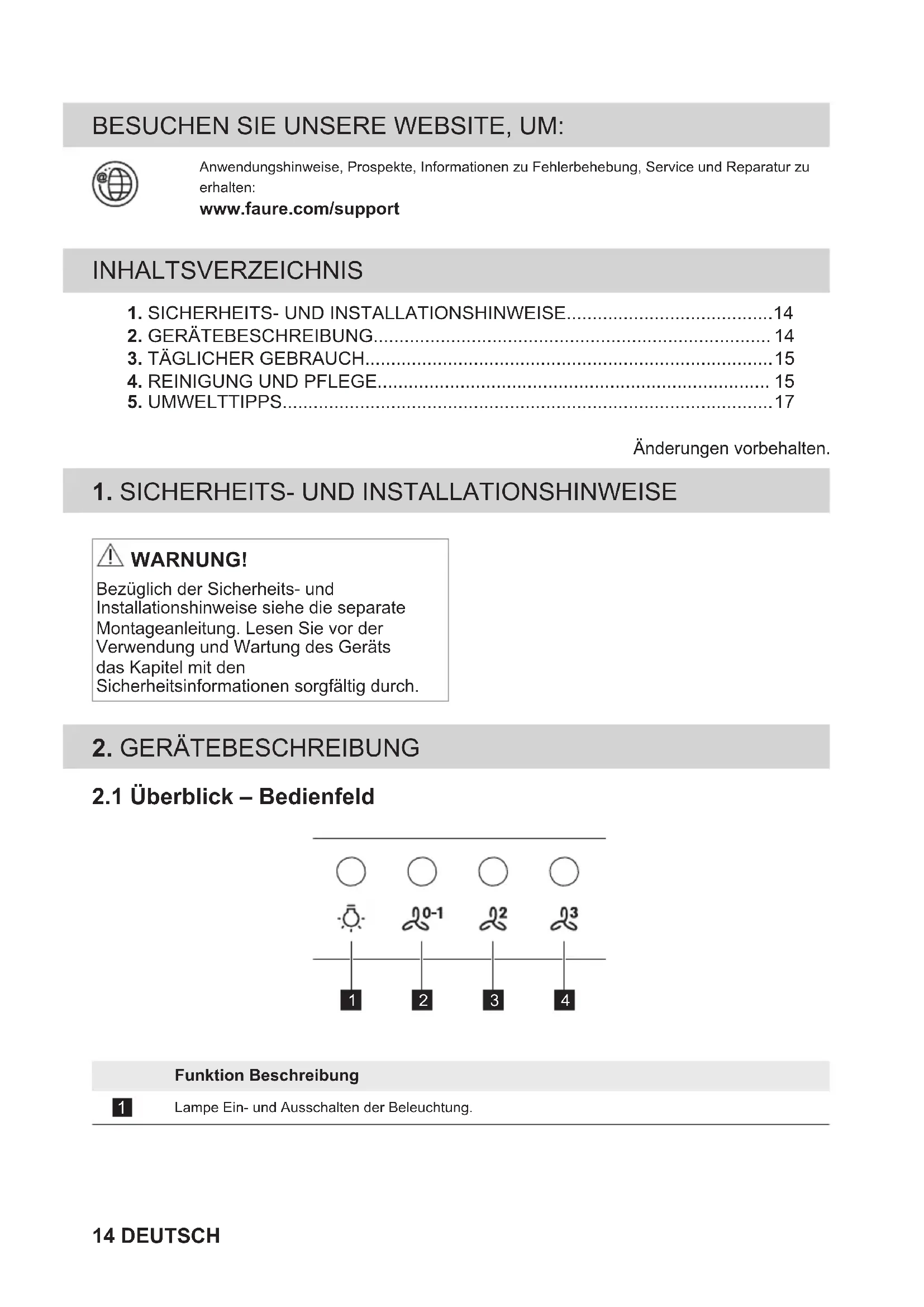 Funktion Beschreibung Lampe Ein- und Ausschalten der Beleuchtung. 14 DEUTSCHFunktion Beschreibung