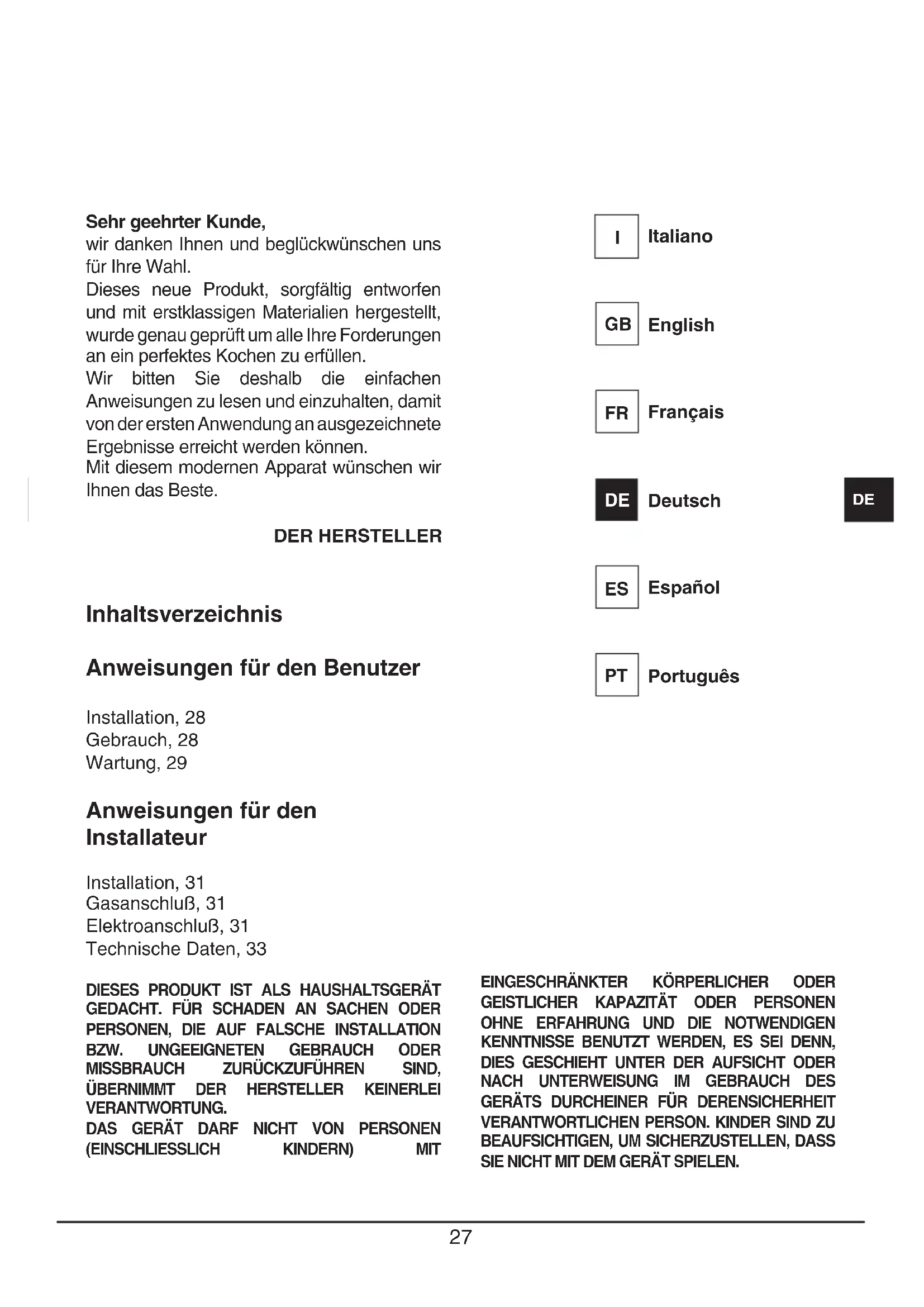 Inhaltsverzeichnis Anweisungen für den Benutzer Installation, 28 Gebrauch, 28 Wartung, 29 Anweisungen für den Installateur Installation, 31 Gasanschluß, 31 Elektroanschluß, 31 Technische Daten, 33 DIESES PRODUKT IST ALS HAUSHALTSGERÄT GEDACHT. FÜR SCHADEN AN SACHEN ODER PERSONEN, DIE AUF FALSCHE INSTALLATION BZW. UNGEEIGNETEN GEBRAUCH ODER MISSBRAUCH ZURÜCKZUFÜHREN SIND, ÜBERNIMMT DER HERSTELLER KEINERLEI VERANTWORTUNG. DAS GERÄT DARF NICHT VON PERSONEN (EINSCHLIESSLICH KINDERN) MIT EINGESCHRÄNKTER KÖRPERLICHER ODER GEISTLICHER KAPAZITÄT ODER PERSONEN OHNE ERFAHRUNG UND DIE NOTWENDIGEN KENNTNISSE BENUTZT WERDEN, ES SEI DENN, DIES GESCHIEHT UNTER DER AUFSICHT ODER NACH UNTERWEISUNG IM GEBRAUCH DES GERÄTS DURCHEINER FÜR DERENSICHERHEIT VERANTWORTLICHEN PERSON. KINDER SIND ZU BEAUFSICHTIGEN, UM SICHERZUSTELLEN, DASS SIE NICHT MIT DEM GERÄT SPIELEN. Sehr geehrter Kunde, wir danken Ihnen und beglückwünschen uns für Ihre Wahl. Dieses neue Produkt, sorgfältig entworfen und mit erstklassigen Materialien hergestellt, wurde genau geprüft um alle Ihre Forderungen an ein perfektes Kochen zu erfüllen. Wir bitten Sie deshalb die einfachen Anweisungen zu lesen und einzuhalten, damit von der ersten Anwendung an ausgezeichnete Ergebnisse erreicht werden können. Mit diesem modernen Apparat wünschen wir Ihnen das Beste. DER HERSTELLER Italiano