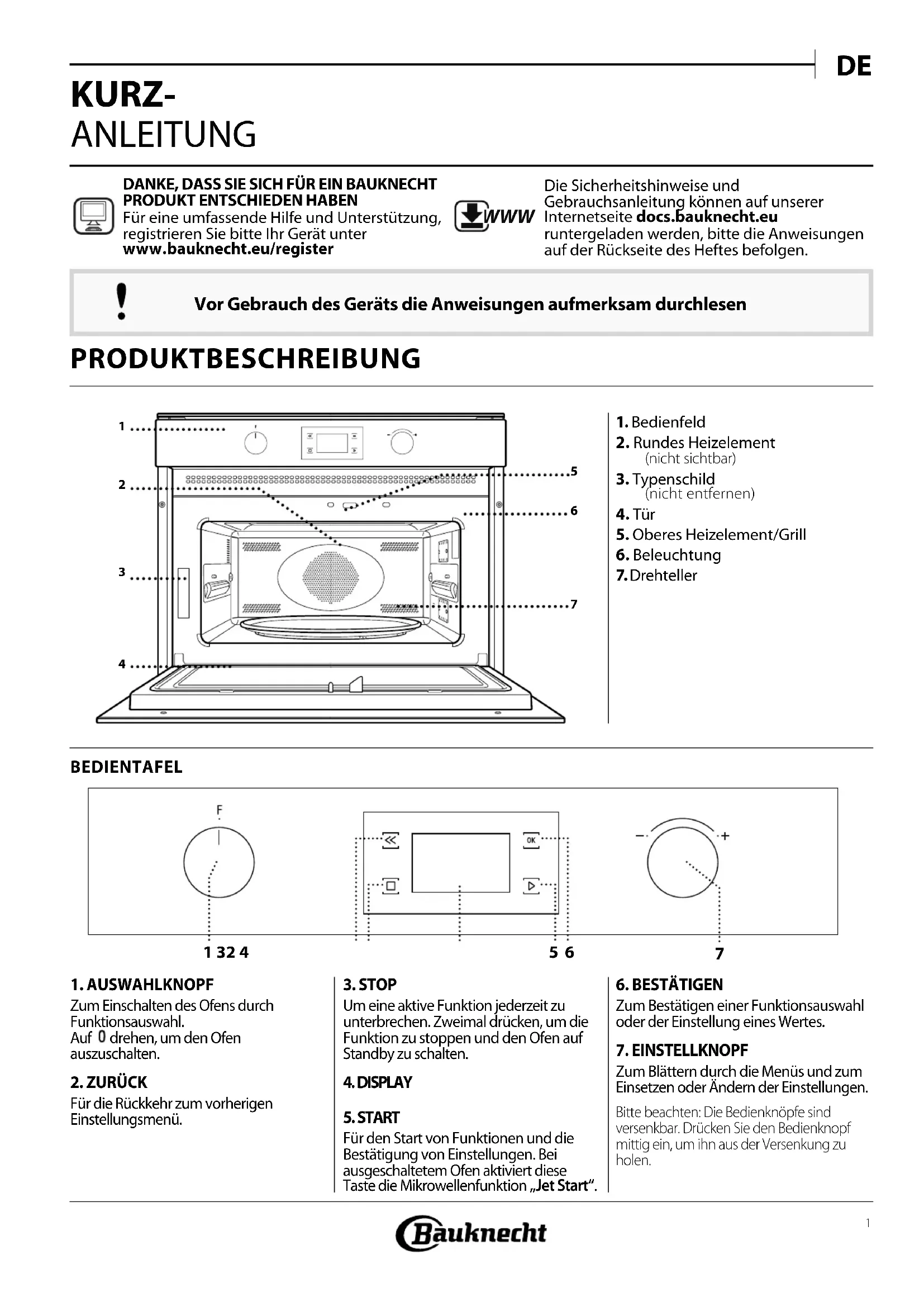 Zum Blättern durch die Menüs und zum Einsetzen oder Ändern der Einstellungen.Bitte beachten: Die Bedienknöpfe sind versenkbar. Drücken Sie den Bedienknopf mittig ein, um ihn aus der Versenkung zu holen.DANKE, DASS SIE SICH FÜR EIN BAUKNECHT PRODUKT ENTSCHIEDEN HABENFür eine umfassende Hilfe und Unterstützung, registrieren Sie bitte Ihr Gerät unter www.bauknecht.eu/register WWW Die Sicherheitshinweise und Gebrauchsanleitung können auf unserer Internetseite docs.bauknecht.euruntergeladen werden, bitte die Anweisungen auf der Rückseite des Heftes befolgen.