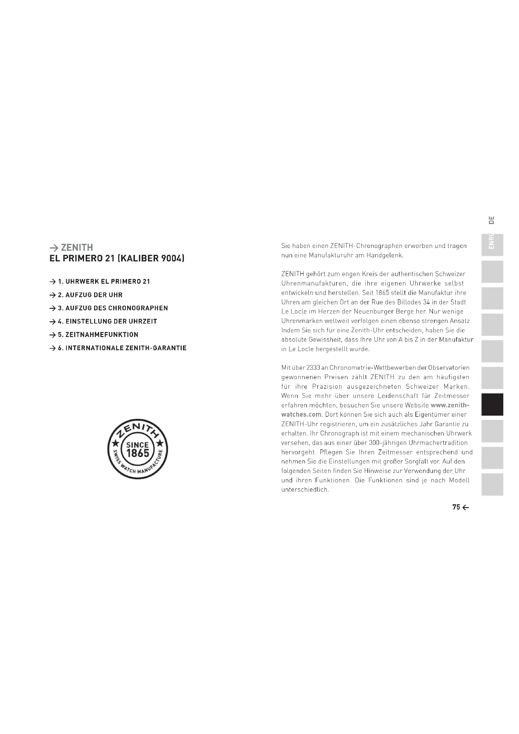 > 5. ZEITNAHMEFUNKTION > 6. INTERNATIONALE ZENITH-GARANTIE > ZENITH EL PRIMERO 21 (KALIBER 9004) Sie haben einen ZENITH-Chronographen erworben und tragen nun eine Manufakturuhr am Handgelenk. ZENITH gehört zum engen Kreis der authentischen Schweizer Uhrenmanufakturen, die ihre eigenen Uhrwerke selbst entwickeln und herstellen. Seit 1865 stellt die Manufaktur ihre Uhren am gleichen Ort an der Rue des Billodes 34 in der Stadt Le Locle im Herzen der Neuenburger Berge her. Nur wenige Uhrenmarken weltweit verfolgen einen ebenso strengen Ansatz. Indem Sie sich für eine Zenith-Uhr entscheiden, haben Sie die absolute Gewissheit, dass Ihre Uhr von A bis Z in der Manufaktur in Le Locle hergestellt wurde. Mit über 2333 an Chronometrie-Wettbewerben der Observatorien gewonnenen Preisen zählt ZENITH zu den am häufigsten für ihre Präzision ausgezeichneten Schweizer Marken. Wenn Sie mehr über unsere Leidenschaft für Zeitmesser erfahren möchten, besuchen Sie unsere Website www.zenith- watches.com. Dort können Sie sich auch als Eigentümer einer ZENITH-Uhr registrieren, um ein zusätzliches Jahr Garantie zu erhalten. Ihr Chronograph ist mit einem mechanischen Uhrwerk versehen, das aus einer über 300-jährigen Uhrmachertradition hervorgeht. Pflegen Sie Ihren Zeitmesser entsprechend und nehmen Sie die Einstellungen mit großer Sorgfalt vor. Auf den folgenden Seiten finden Sie Hinweise zur Verwendung der Uhr und ihren Funktionen. Die Funktionen sind je nach Modell unterschiedlich.77 <