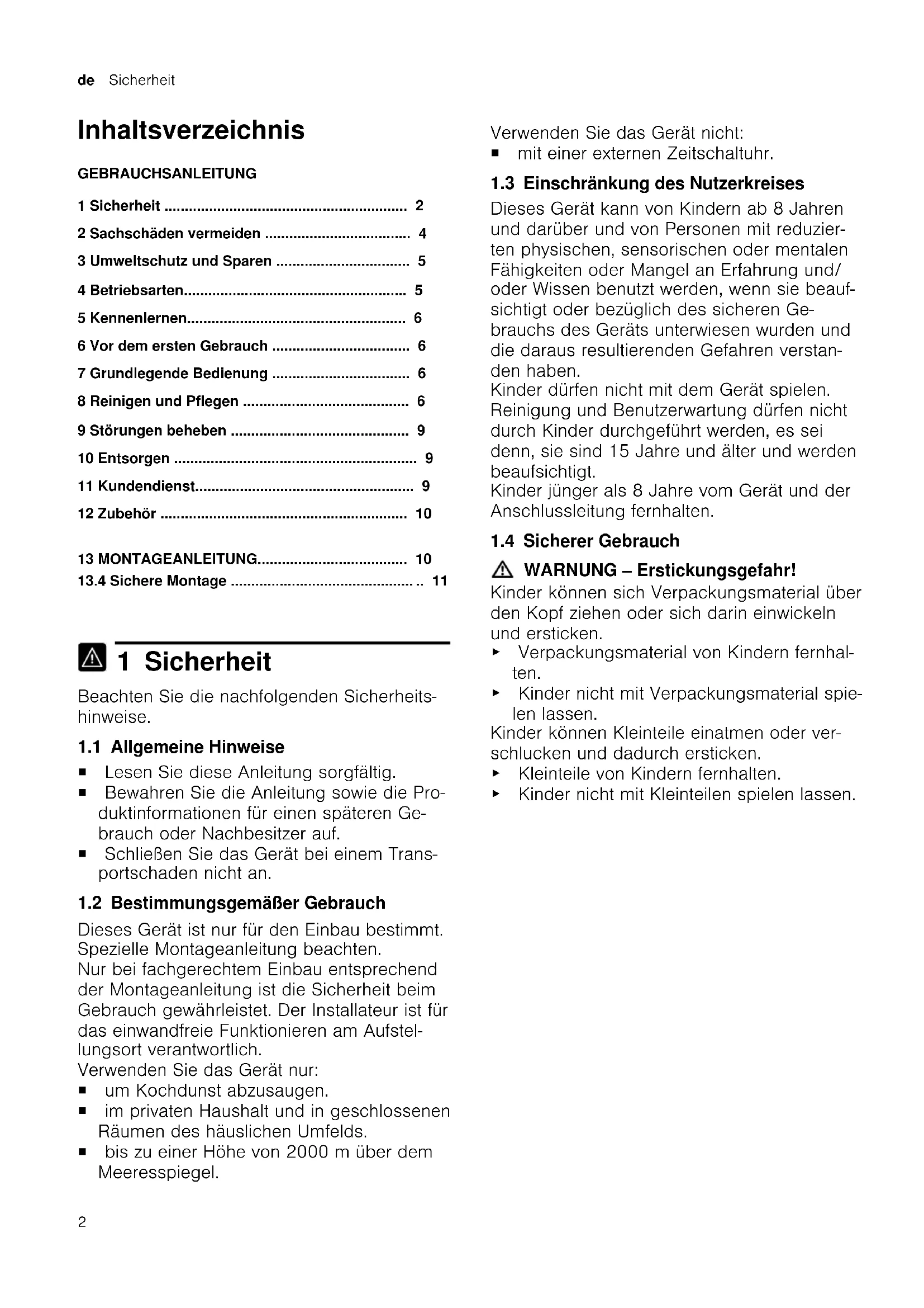1 Sicherheit Beachten Sie die nachfolgenden Sicherheits- hinweise. 1.1 Allgemeine Hinweise ¡ Lesen Sie diese Anleitung sorgfältig. ¡ Bewahren Sie die Anleitung sowie die Pro- duktinformationen für einen späteren Ge- brauch oder Nachbesitzer auf. ¡ Schließen Sie das Gerät bei einem Trans- portschaden nicht an. 1.2 Bestimmungsgemäßer Gebrauch Dieses Gerät ist nur für den Einbau bestimmt. Spezielle Montageanleitung beachten. Nur bei fachgerechtem Einbau entsprechend der Montageanleitung ist die Sicherheit beim Gebrauch gewährleistet. Der Installateur ist für das einwandfreie Funktionieren am Aufstel- lungsort verantwortlich. Verwenden Sie das Gerät nur: ¡ um Kochdunst abzusaugen. ¡ im privaten Haushalt und in geschlossenen Räumen des häuslichen Umfelds. ¡ bis zu einer Höhe von 2000m über dem Meeresspiegel. Verwenden Sie das Gerät nicht: ¡ mit einer externen Zeitschaltuhr. 1.3 Einschränkung des Nutzerkreises Dieses Gerät kann von Kindern ab 8 Jahren und darüber und von Personen mit reduzier- ten physischen, sensorischen oder mentalen Fähigkeiten oder Mangel an Erfahrung und/ oder Wissen benutzt werden, wenn sie beauf- sichtigt oder bezüglich des sicheren Ge- brauchs des Geräts unterwiesen wurden und die daraus resultierenden Gefahren verstan- den haben. Kinder dürfen nicht mit dem Gerät spielen. Reinigung und Benutzerwartung dürfen nicht durch Kinder durchgeführt werden, es sei denn, sie sind 15 Jahre und älter und werden beaufsichtigt. Kinder jünger als 8 Jahre vom Gerät und der Anschlussleitung fernhalten. 1.4 Sicherer Gebrauch WARNUNG‒Erstickungsgefahr! Kinder können sich Verpackungsmaterial über den Kopf ziehen oder sich darin einwickeln und ersticken. ▶ Verpackungsmaterial von Kindern fernhal- ten. ▶ Kinder nicht mit Verpackungsmaterial spie- len lassen. Kinder können Kleinteile einatmen oder ver- schlucken und dadurch ersticken. ▶ Kleinteile von Kindern fernhalten. ▶ Kinder nicht mit Kleinteilen spielen lassen.Sicherheit de