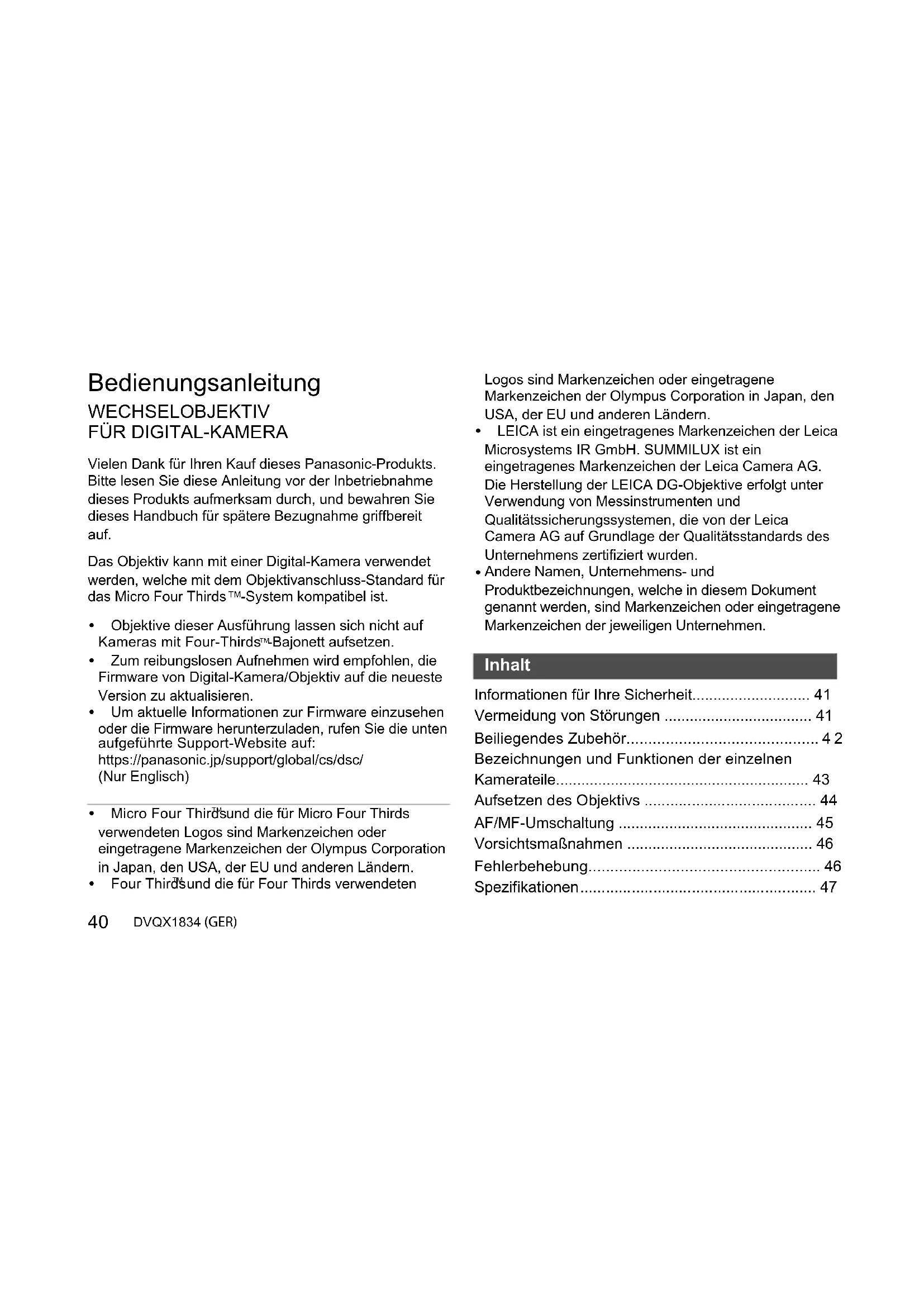 Vielen Dank für Ihren Kauf dieses Panasonic-Produkts.Bitte lesen Sie diese Anleitung vor der Inbetriebnahme dieses Produkts aufmerksam durch, und bewahren Sie dieses Handbuch für spätere Bezugnahme griffbereit auf. Das Objektiv kann mit einer Digital-Kamera verwendet werden, welche mit dem Objektivanschluss-Standard für das Micro Four Thirds -System kompatibel ist. 0 Objektive dieser Ausführung lassen sich nicht auf Kameras mit Four-Thirds -Bajonett aufsetzen. 0 Zum reibungslosen Aufnehmen wird empfohlen, die Firmware von Digital-Kamera/Objektiv auf die neueste Version zu aktualisieren. 0 Um aktuelle Informationen zur Firmware einzusehen oder die Firmware herunterzuladen, rufen Sie die unten aufgeführte Support-Website auf:https://panasonic.jp/support/global/cs/dsc/(Nur Englisch) 0 Micro Four Thirds