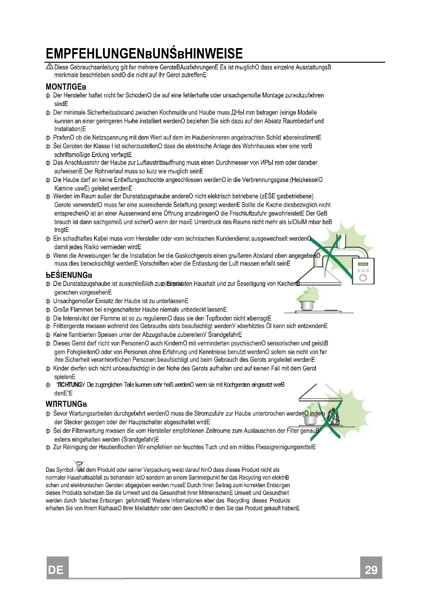- Zur Reinigung der Haubenflächen Wir empfehlen ein feuchtes Tuch und ein mildes Flüssigreinigungsmittel. Das Symbol auf dem Produkt oder seiner Verpackung weist darauf hin, dass dieses Produkt nicht als normaler Haushaltsabfall zu behandeln ist, sondern an einem Sammelpunkt für das Recycling von elektri-schen und elektronischen Geräten abgegeben werden muss. Durch Ihren Beitrag zum korrekten Entsorgen dieses Produkts schützen Sie die Umwelt und die Gesundheit Ihrer Mitmenschen. Umwelt und Gesundheit werden durch falsches Entsorgen gefährdet. Weitere Informationen über das Recycling dieses Produkts erhalten Sie von Ihrem Rathaus, Ihrer Müllabfuhr oder dem Geschäft, in dem Sie das Produkt gekauft haben.DE