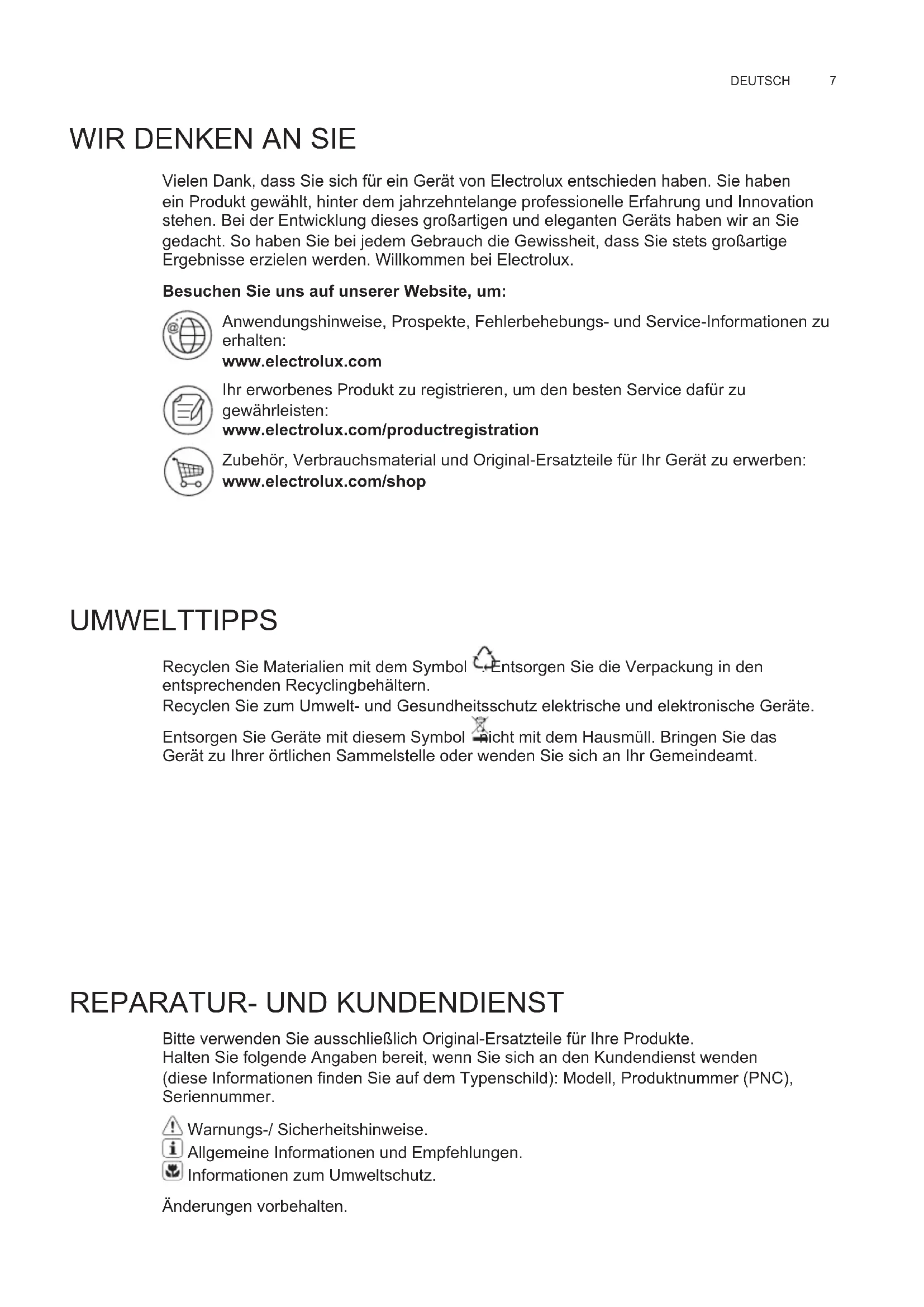 Bitte verwenden Sie ausschließlich Original-Ersatzteile für Ihre Produkte. Halten Sie folgende Angaben bereit, wenn Sie sich an den Kundendienst wenden (diese Informationen finden Sie auf dem Typenschild): Modell, Produktnummer (PNC), Seriennummer. Warnungs-/ Sicherheitshinweise. Allgemeine Informationen und Empfehlungen. Informationen zum Umweltschutz. Änderungen vorbehalten. DE GEBRAUCHSANLEITUNGwww.electrolux.com