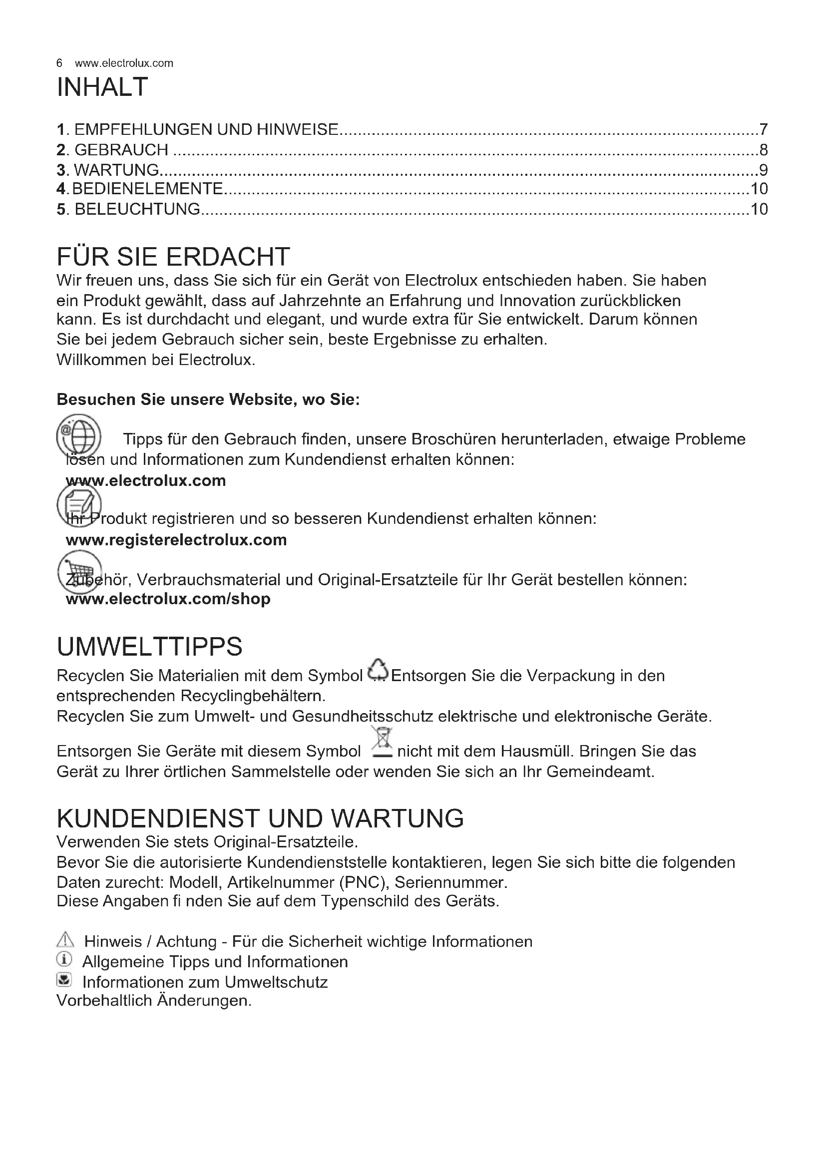 Wir freuen uns, dass Sie sich für ein Gerät von Electrolux entschieden haben. Sie haben ein Produkt gewählt, dass auf Jahrzehnte an Erfahrung und Innovation zurückblicken kann. Es ist durchdacht und elegant, und wurde extra für Sie entwickelt. Darum können Sie bei jedem Gebrauch sicher sein, beste Ergebnisse zu erhalten. Willkommen bei Electrolux. Besuchen Sie unsere Website, wo Sie: Tipps für den Gebrauch fi nden, unsere Broschüren herunterladen, etwaige Probleme lösen und Informationen zum Kundendienst erhalten können: www.electrolux.com Ihr Produkt registrieren und so besseren Kundendienst erhalten können: www.registerelectrolux.com Zubehör, Verbrauchsmaterial und Original-Ersatzteile für Ihr Gerät bestellen können: www.electrolux.com/shop UMWELTTIPPS Recyclen Sie Materialien mit dem Symbol . . Entsorgen Sie die Verpackung in den entsprechenden Recyclingbehältern. Recyclen Sie zum Umwelt- und Gesundheitsschutz elektrische und elektronische Geräte. Entsorgen Sie Geräte mit diesem Symbol nicht mit dem Hausmüll. Bringen Sie das Gerät zu Ihrer örtlichen Sammelstelle oder wenden Sie sich an Ihr Gemeindeamt.