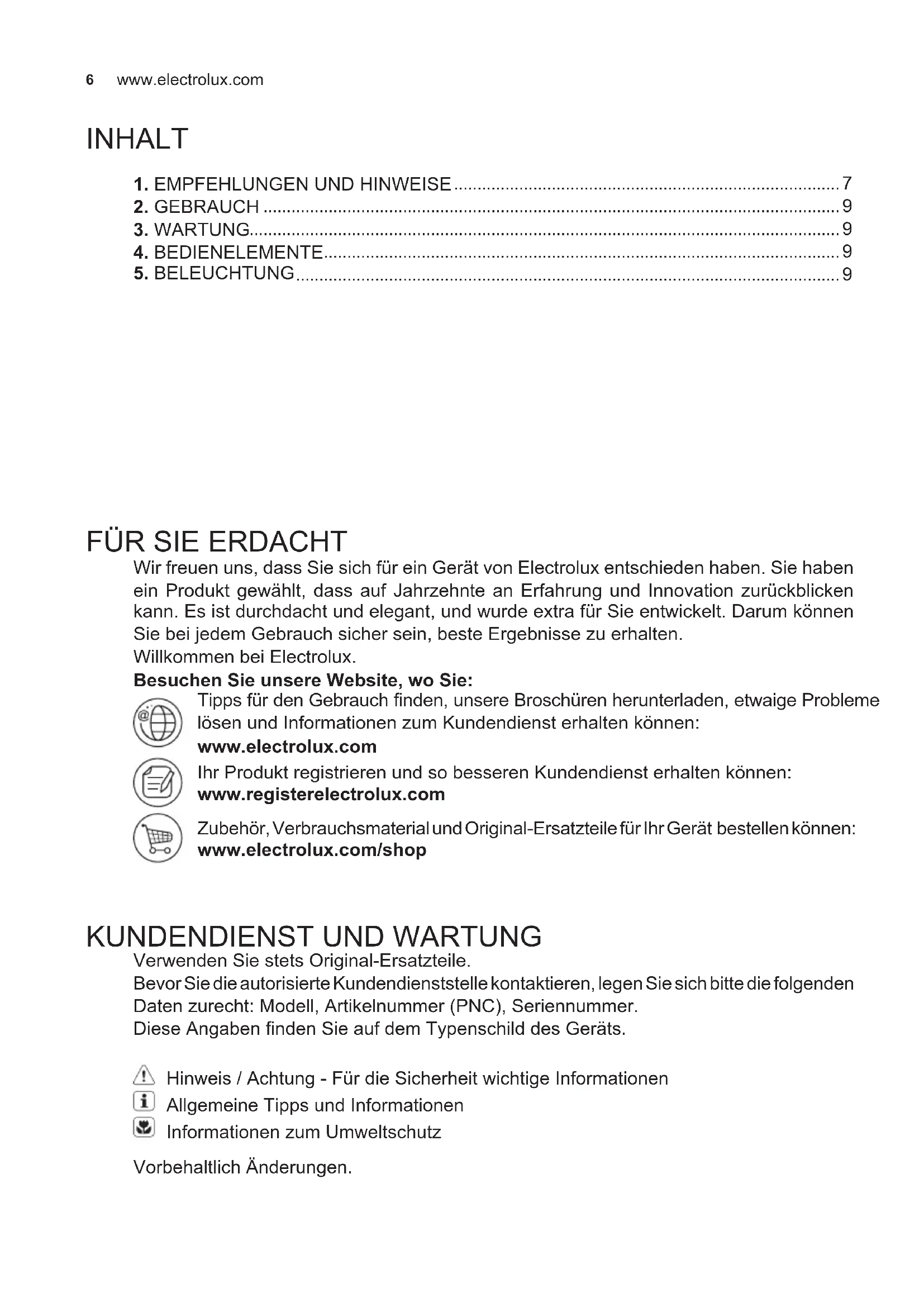 Wir freuen uns, dass Sie sich für ein Gerät von Electrolux entschieden haben. Sie haben ein Produkt gewählt, dass auf Jahrzehnte an Erfahrung und Innovation zurückblicken kann. Es ist durchdacht und elegant, und wurde extra für Sie entwickelt. Darum können Sie bei jedem Gebrauch sicher sein, beste Ergebnisse zu erhalten. Willkommen bei Electrolux. Besuchen Sie unsere Website, wo Sie: Tipps für den Gebrauch nden, unsere Broschüren herunterladen, etwaige Probleme lösen und Informationen zum Kundendienst erhalten können: www.electrolux.com Ihr Produkt registrieren und so besseren Kundendienst erhalten können: www.registerelectrolux.com Zubehör, Verbrauchsmaterial und Original-Ersatzteile für Ihr Gerät bestellen können: www.electrolux.com/shop