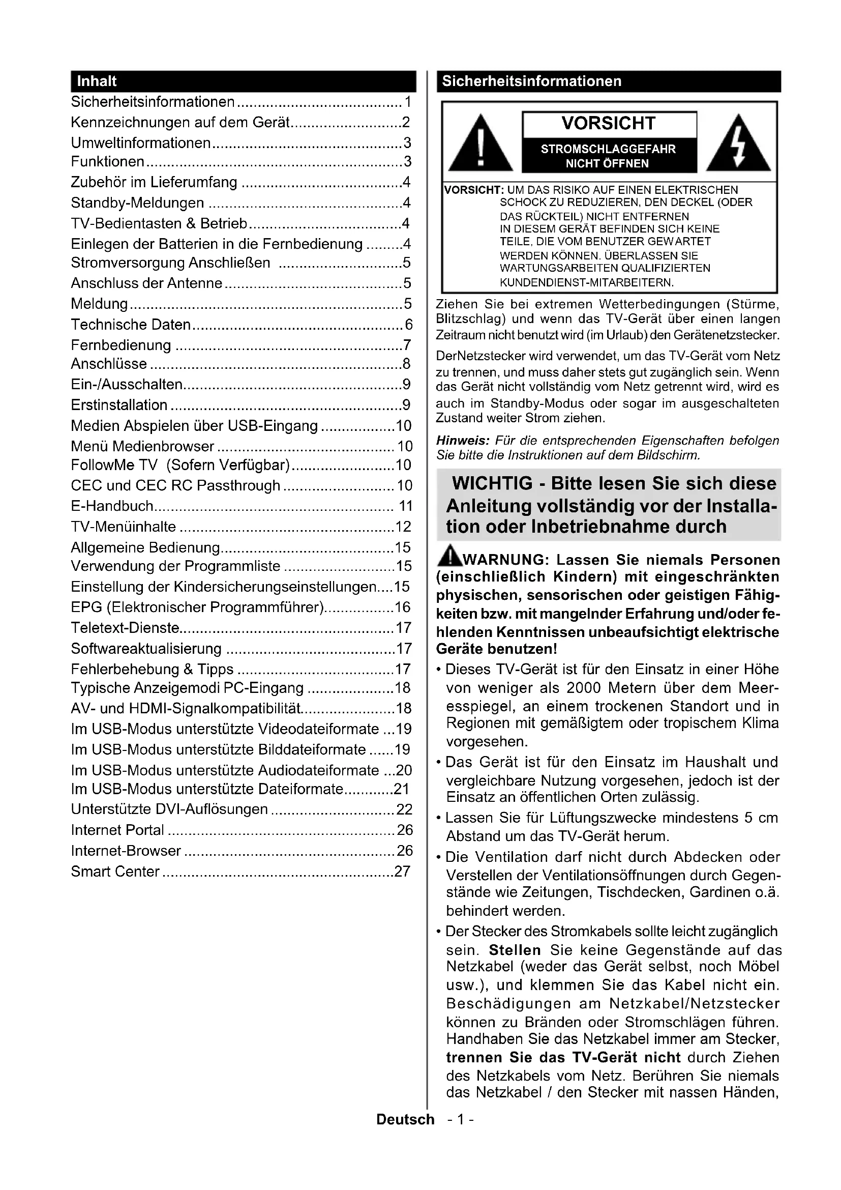- Dieses TV-Gerät ist für den Einsatz in einer Höhe von weniger als 2000 Metern über dem Meeresspiegel, an einem trockenen Standort und in Regionen mit gemäßigtem oder tropischen Klimavorgesehen.