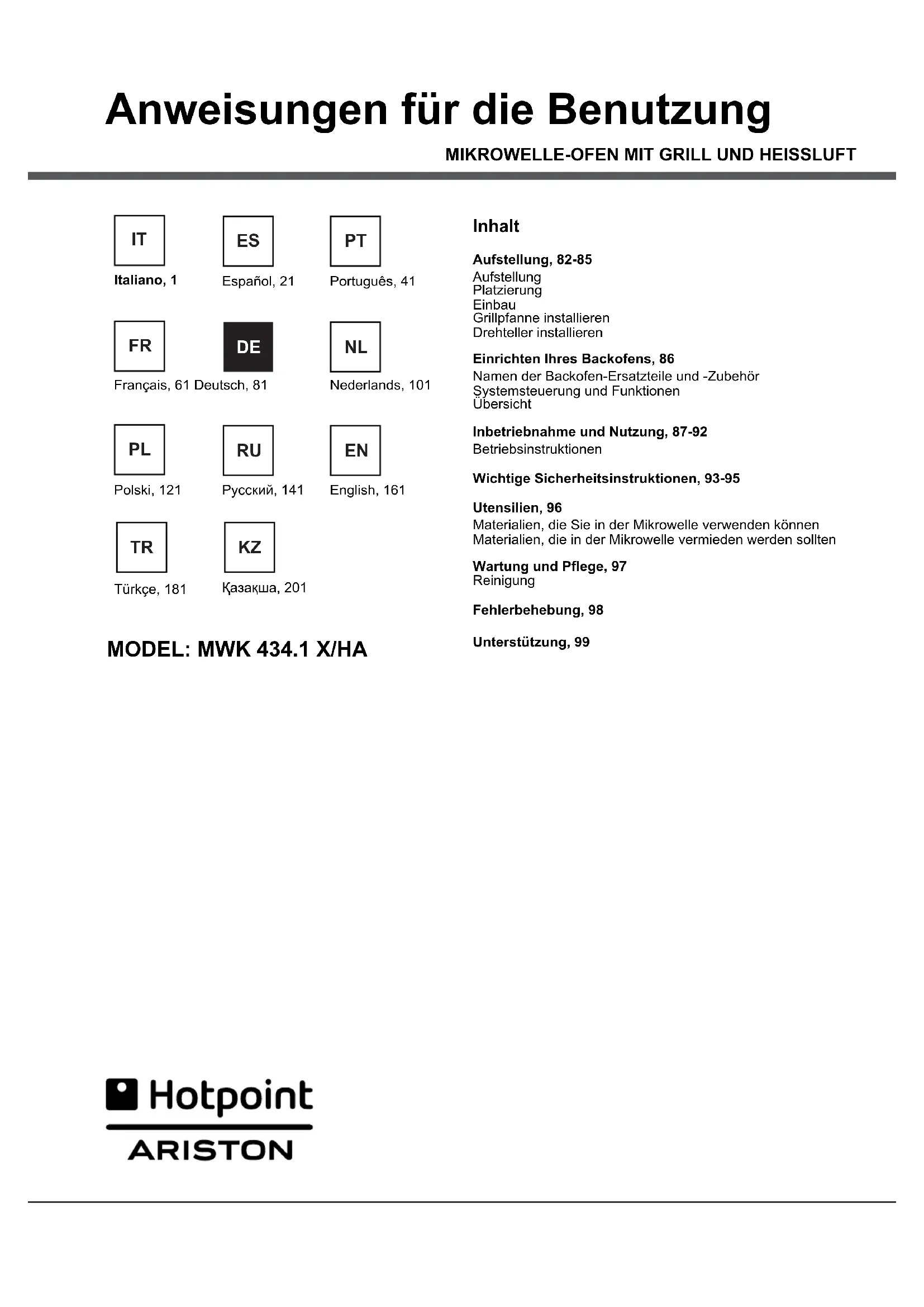 BEDIENUNGSANLEITUNG MWK 434.1 XHA HOTPOINT-ARISTON