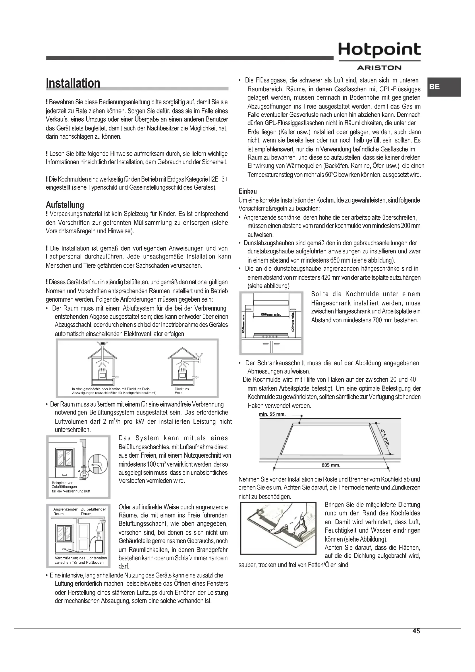 PTInstallation ! Bewahren Sie diese Bedienungsanleitung bitte sorgfältig auf, damit Sie sie jederzeit zu Rate ziehen können. Sorgen Sie dafür, dass sie im Falle eines Verkaufs, eines Umzugs oder einer Übergabe an einen anderen Benutzer das Gerät stets begleitet, damit auch der Nachbesitzer die Möglichkeit hat, darin nachschlagen zu können. ! Lesen Sie bitte folgende Hinweise aufmerksam durch, sie liefern wichtige Informationen hinsichtlich der Installation, dem Gebrauch und der Sicherheit. ! Die Kochmulden sind werkseitig für den Betrieb mit Erdgas Kategorie II2E+3+ eingestellt (siehe Typenschild und Gaseinstellungsschild des Gerätes). Aufstellung ! Verpackungsmaterial ist kein Spielzeug für Kinder. Es ist entsprechend den Vorschriften zur getrennten Müllsammlung zu entsorgen (siehe Vorsichtsmaßregeln und Hinweise). ! Die Installation ist gemäß den vorliegenden Anweisungen und von Fachpersonal durchzuführen. Jede unsachgemäße Installation kann Menschen und Tiere gefährden oder Sachschaden verursachen. ! Dieses Gerät darf nur in ständig belüfteten, und gemäß den national gültigen Normen und Vorschriften entsprechenden Räumen installiert und in Betrieb genommen werden. Folgende Anforderungen müssen gegeben sein: