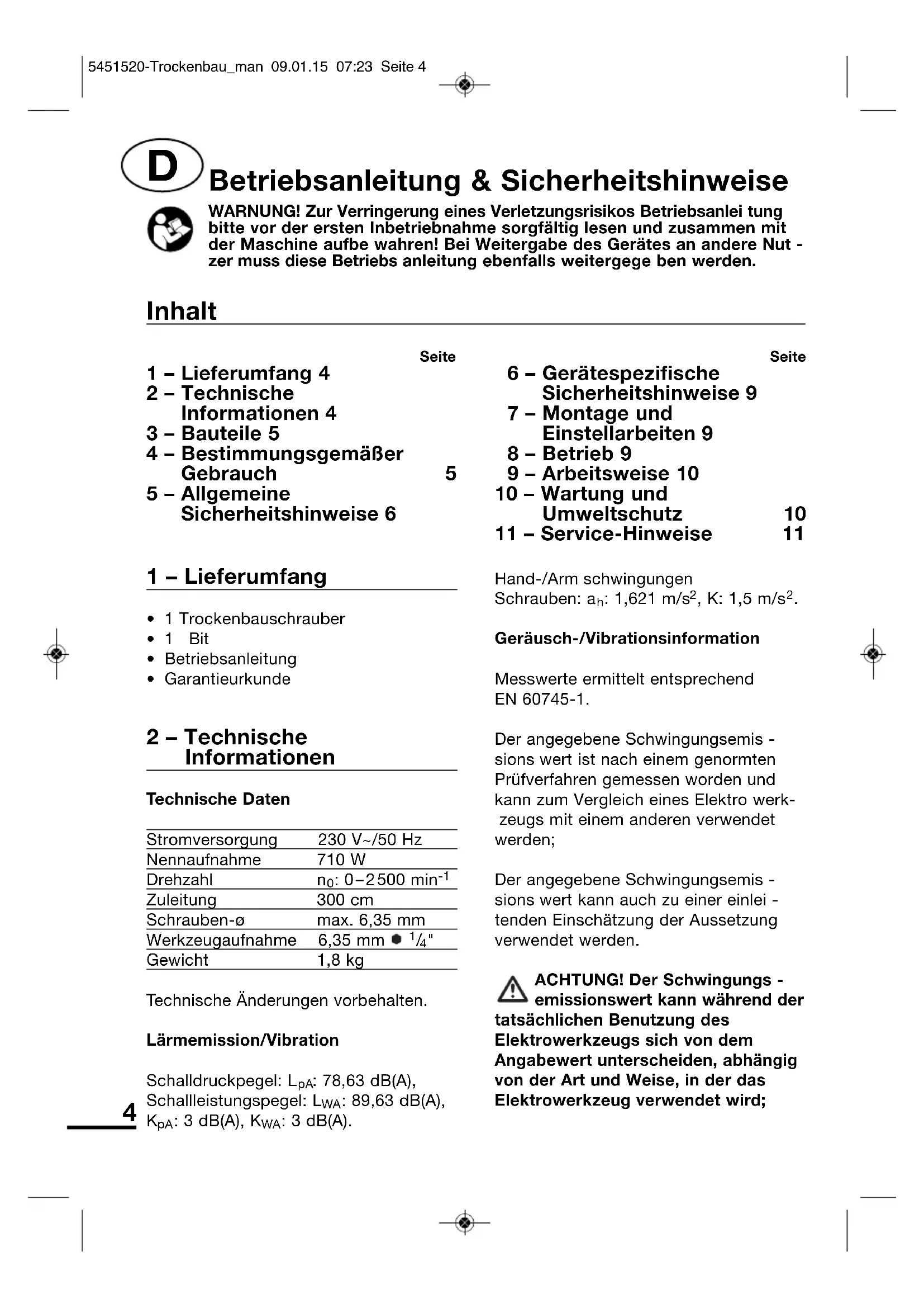 5451520-Trockenbau_man 09.01.15 07:23 Seite 3Betriebsanleitung & Sicher heits hinweise WARNUNG! Zur Verringerung eines Verletzungsrisikos Betriebsanlei tung bitte vor der ersten Inbe trieb nahme sorg fältig lesen und zusammen mit der Maschine aufbe wahren! Bei Weitergabe des Gerätes an andere Nut -zer muss diese Betriebs anleitung ebenfalls weitergege ben werden. Seite 1 – Lieferumfang 4 2 – Technische Informationen 4 3 – Bauteile 5 4 – Bestimmungsgemäßer Gebrauch 5 5 – Allgemeine Sicherheitshinweise 6 Seite 6 – Gerätespezifische Sicherheitshinweise 9 7 – Montage und Einstellarbeiten 9 8 – Betrieb 9 9 – Arbeitsweise 10 10 – Wartung und Umweltschutz 10 11 – Service-Hinweise 11 Inhalt