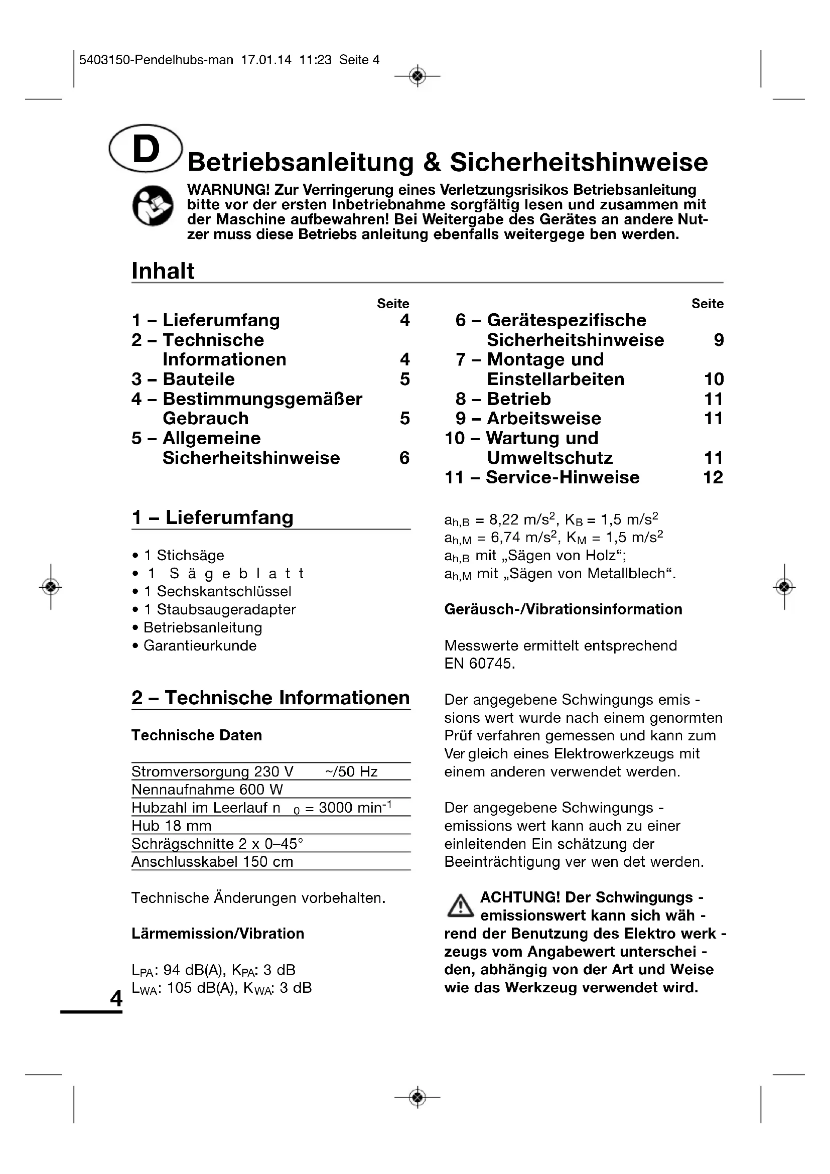 Betriebsanleitung & Sicher heits hinweise WARNUNG! Zur Verringerung eines Verletzungsrisikos Betriebsanlei tung bitte vor der ersten Inbe trieb nahme sorg fältig lesen und zusammen mit der Maschine aufbe wahren! Bei Weitergabe des Gerätes an andere Nut - zer muss diese Betriebs anleitung ebenfalls weitergege ben werden. Seite 1 – Lieferumfang 4 2 – Technische Informationen 4 3 – Bauteile 5 4 – Bestimmungsgemäßer Gebrauch 5 5 – Allgemeine Sicherheitshinweise 6 Seite 6 – Gerätespezifische Sicherheitshinweise 9 7 – Montage und Einstellarbeiten 10 8 – Betrieb 11 9 – Arbeitsweise 11 10 – Wartung und Umweltschutz 11 11 – Service-Hinweise 12 Inhalt 5403150-Pendelhubs-man 17.01.14 11:23 Seite 45 Informationen zur Vibrations - verminderung Warnung: Der tatsächliche vorhandene Vibrationsemissionswert während der Benutzung der Maschine kann von dem in der Bedienungsanleitung bzw. vom Hersteller angegebenen abweichen. Dies kann von folgenden Einfluss faktoren verursacht werden, die vor jedem bzw. während des Gebrauches beachtet werden sollen: