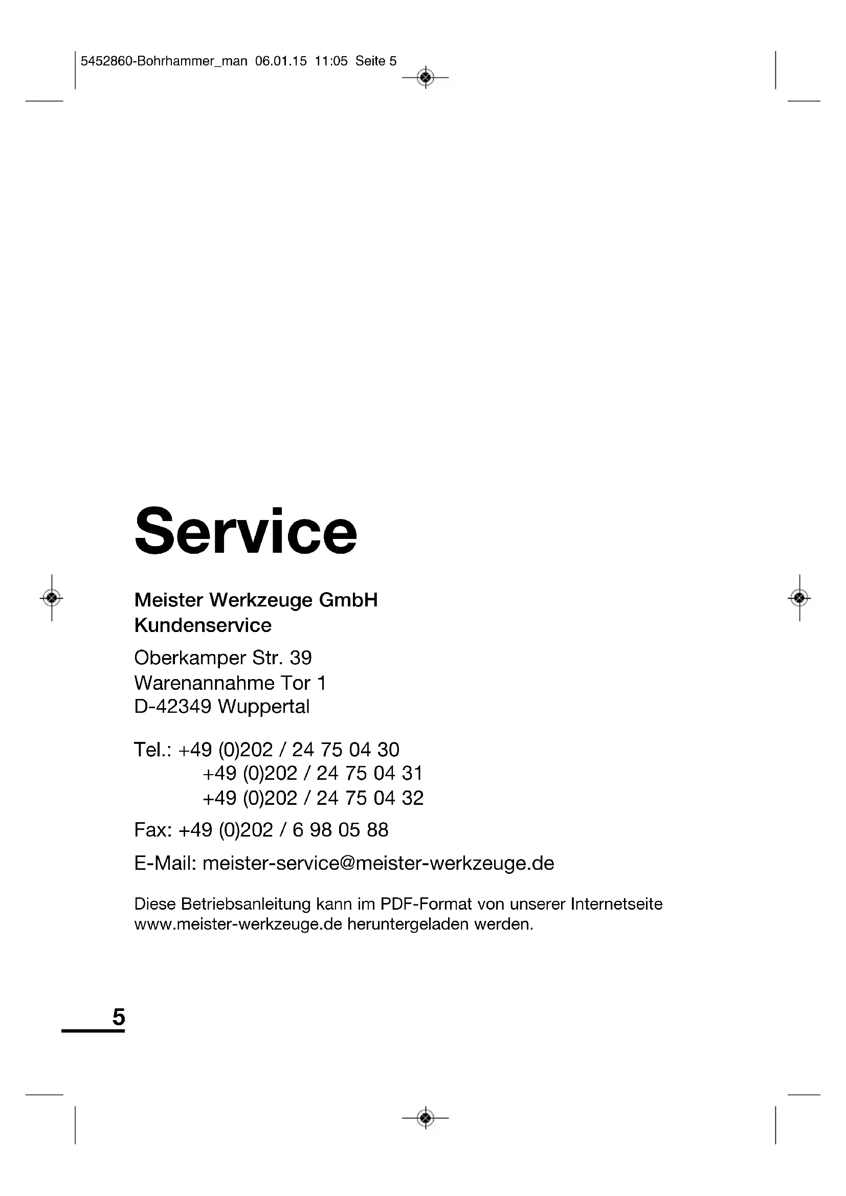 5452860-Bohrhammer_man 06.01.15 11:05 Seite 83© Copyright Nachdruck oder Vervielfältigung – auch aus - zugs weise – nur mit Genehmigung der Meister Werkzeuge GmbH Oberkamper Str. 37– 39 D-42349 Wuppertal Germany 2014/2015 Diese Druckschrift einschließlich aller ihrer Teile ist urheberrechtlich geschützt. Jede Verwertung außerhalb der engen Grenzen des Urheberrechtsgesetzes ist ohne Zustim mung der Meister Werkzeuge GmbH unzu lässig und strafbar. Das gilt insbesondere für Vervielfältigungen, Übersetzungen, Mikroverfilmungen und die Ein speisung und Verarbeitung in elektronischen Systemen. 5452860-Bohrhammer_man 06.01.15 11:05 Seite 84