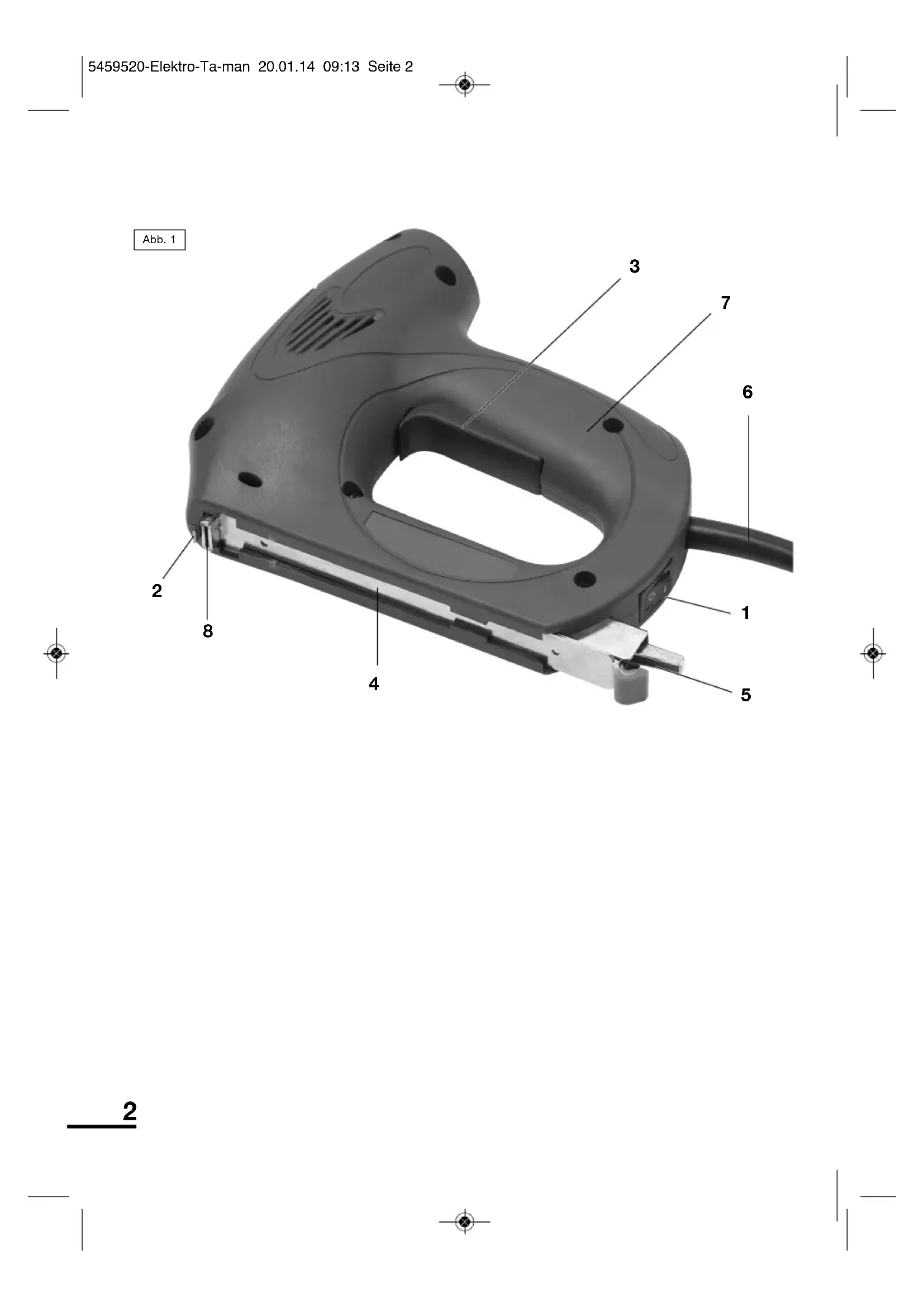 Seite 1 – Lieferumfang 4 2 – Technische Informationen 4 3 – Bauteile 5 4 – Bestimmungsgemäßer Gebrauch 5 5 – Allgemeine Sicherheitshinweise 6 Seite 6 – Gerätespezifische Sicherheitshinweise 9 7 – Montage und Einstellarbeiten 10 8 – Betrieb 10 9 – Arbeitsweise 10 10 – Wartung und Umweltschutz 10 11 – Service-Hinweise 11 Inhalt 5459520-Elektro-Ta-man 20.01.14 09:13 Seite 45 Der angegebene Schwingungs emissions - wert kann auch zu einer einleitenden Ein schätzung der Be einträchtigung ver - wen det werden. ACHTUNG! Der Schwingungs - emissionswert kann sich wäh rend der Benutzung des Elektro werk zeugs vom Angabewert unterschei den, ab - hängig von der Art und Weise wie das Elektro werkzeug verwendet wird. Es müssen Sicherheitsmaßnahmen zum Schutz des Bedieners festgelegt werden. Hierbei erfolgt die Einschät - zung der Be ein trächtigung unter Be - rücksichtigung der tatsächlichen Nut - zungsbedingungen. (Dabei sind alle Anteile des Betriebs zyklus zu berück - sichtigen, d. h. auch Zei ten, in welchen das Elektro werkzeug abgeschal tet ist und solche, in welchen es zwar ein ge - schal tet ist, aber ohne Belastung läuft.) ACHTUNG! Eine gewisse Lärmbelästigung durch dieses Gerät ist nicht vermeidbar. Verlegen Sie daher lärmintensive Arbeiten auf zugelassene und dafür bestimmte Zeiten. Halten Sie sich ggf. an Ruhe - zeiten und beschränken Sie die Arbeitsdauer auf das Notwendigste. ACHTUNG! Die Einwirkung von Lärm kann zu Schädigungen des Gehörs führen. Daher nur mit einem geeigneten Gehörschutz arbeiten. In der Nähe befindliche Personen sollten daher ebenfalls einen geeigneten Gehörschutz tragen. 3 – Bauteile 1 Ein-/Ausschalter 2 Kontaktschalter 3 Auslöser 4 Magazin 5 Magazinverriegelung 6 Anschlusskabel 7 Handgriff 8 Klammer-/Nagelauswurf 4 – Bestimmungsgemäßer Gebrauch Dieser Elektro-Tacker ist mit den ange - gebenen Klammern und Nägeln geeignet, Holzleisten, Maschendraht, Bitumen - pappe, Folien, Pappe, Dichtprofile, De - korations- und Bezugsstoffe usw. auf Holz und anderen geeigneten Unter grün - den zu befestigen. Alle anderen Anwen - dungen werden ausdrücklich ausge - schlossen. Dieses Gerät ist nicht dafür bestimmt, durch Personen (einschließlich Kin der) mit eingeschränkten physischen, sensorischen oder geistigen Fähig keiten oder mangels Erfahrung und/oder mangels Wissen benutzt zu wer den, es sei denn, sie werden durch eine für ihre Sicherheit zuständige Person beaufsichtigt oder erhielten von ihr Anweisungen, wie das Gerät zu benutzen ist. Kinder sollten beauf sichtigt werden, um sicherzustellen, dass sie nicht mit dem Gerät spielen. Dieses Gerät ist nur zum Einsatz im häuslichen Bereich bestimmt. Nicht bestimmungsgemäßer Gebrauch Alle Anwendungen mit dem Gerät die nicht im Kapitel „bestimmungsgemäße Ver - wendung“ genannt sind, gelten als eine nicht bestimmungsgemäße Verwendung. Verwendungen, für die das Elektro werk - zeug nicht vorgesehen ist, können Ge - fähr dungen und Verletzungen ver ursa - chen. Verwenden Sie kein Zubehör, nicht speziell für dieses Elektrowerkzeug vorgesehen ist. 5459520-Elektro-Ta-man 20.01.14 09:13 Seite 56 Nur weil Sie das Zubehör an Ihrem Elektrowerkzeug befestigen können, garantiert das keine sichere Verwen - dung. Die zulässige Hubzahl des Einsatz werk - zeugs muss mindestens so hoch sein wie die auf dem Elektrowerkzeug angegebene Höchstzahl. Zubehör, das sich schneller als zulässig dreht, kann zerbrechen und umherfliegen. Es besteht Verletzungsgefahr. Für alle daraus entstandenen Sachschäden sowie Personenschäden, die auf Grund einer Fehlanwendung entstanden sind, haftet der Benutzer des Gerätes. Bei Verwendung anderer bzw. nicht Original Bauteile an der Maschine erlischt herstellerseitig die Garantieleistung. Restrisiken: Die Betriebsanleitung zu diesem Elektro - werkzeug enthält ausführliche Hin weise zum sicheren Arbeiten mit Elektro werk - zeugen. Dennoch birgt jedes Elektro - werkzeug gewisse Rest risiken, die auch durch die vorhandenen Schutz vorrich - tungen nicht völlig auszuschließen sind. Bedienen Sie deshalb Elektro werk zeuge immer mit der notwendigen Vorsicht. Restrisiken können zum Beispiel sein: