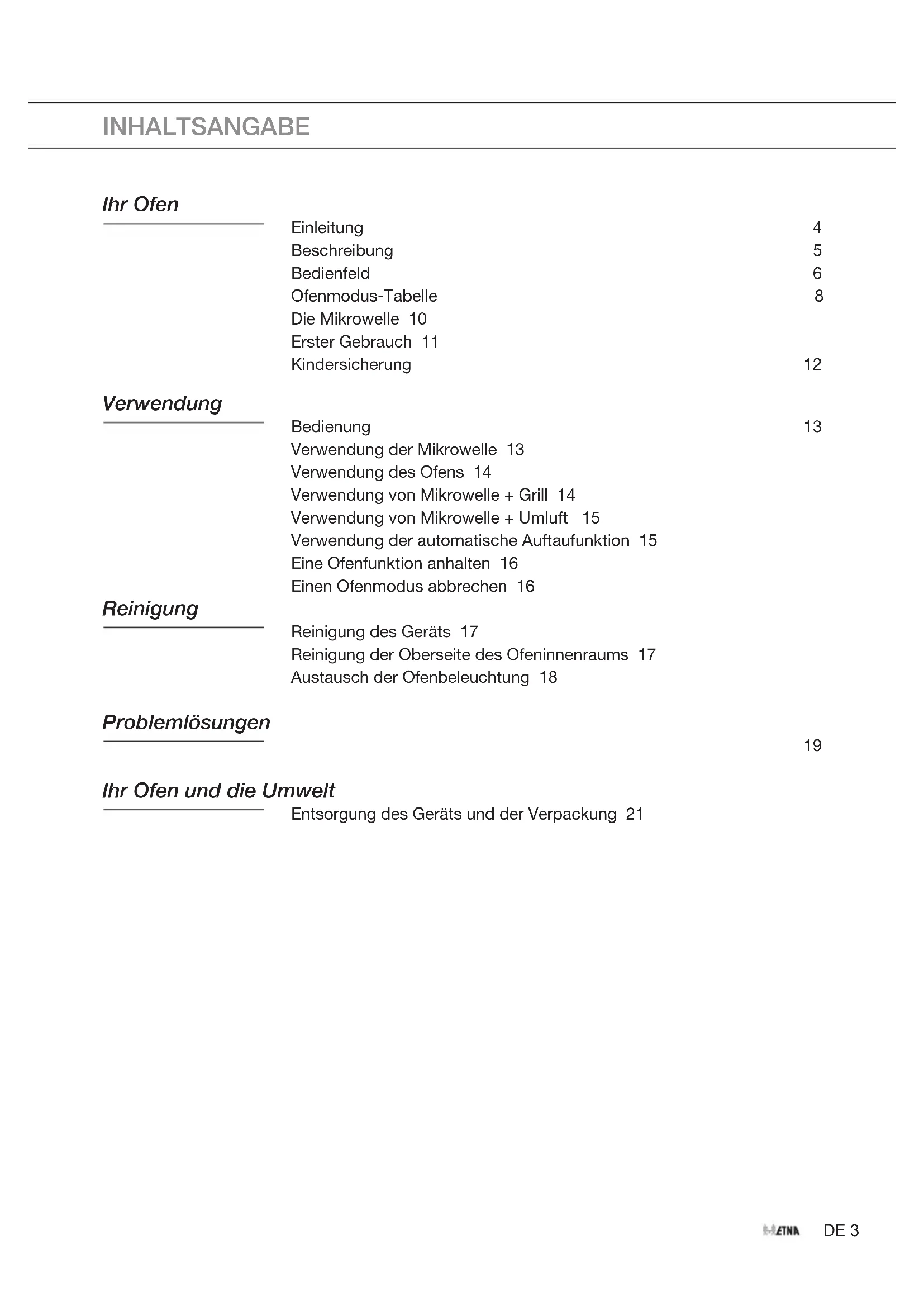 INHALTSANGABE Ihr Ofen Einleitung 4 Beschreibung 5 Bedienfeld 6 Ofenmodus-Tabelle 8 Die Mikrowelle 10 Erster Gebrauch 11 Kindersicherung 12 Verwendung Bedienung 13 Verwendung der Mikrowelle 13 Verwendung des Ofens 14 Verwendung von Mikrowelle + Grill 14 Verwendung von Mikrowelle + Umluft 15 Verwendung der automatische Auftaufunktion 15 Eine Ofenfunktion anhalten 16 Einen Ofenmodus abbrechen 16 Reinigung Reinigung des Geräts 17 Reinigung der Oberseite des Ofeninnenraums 17 Austausch der Ofenbeleuchtung 18 Problemlösungen