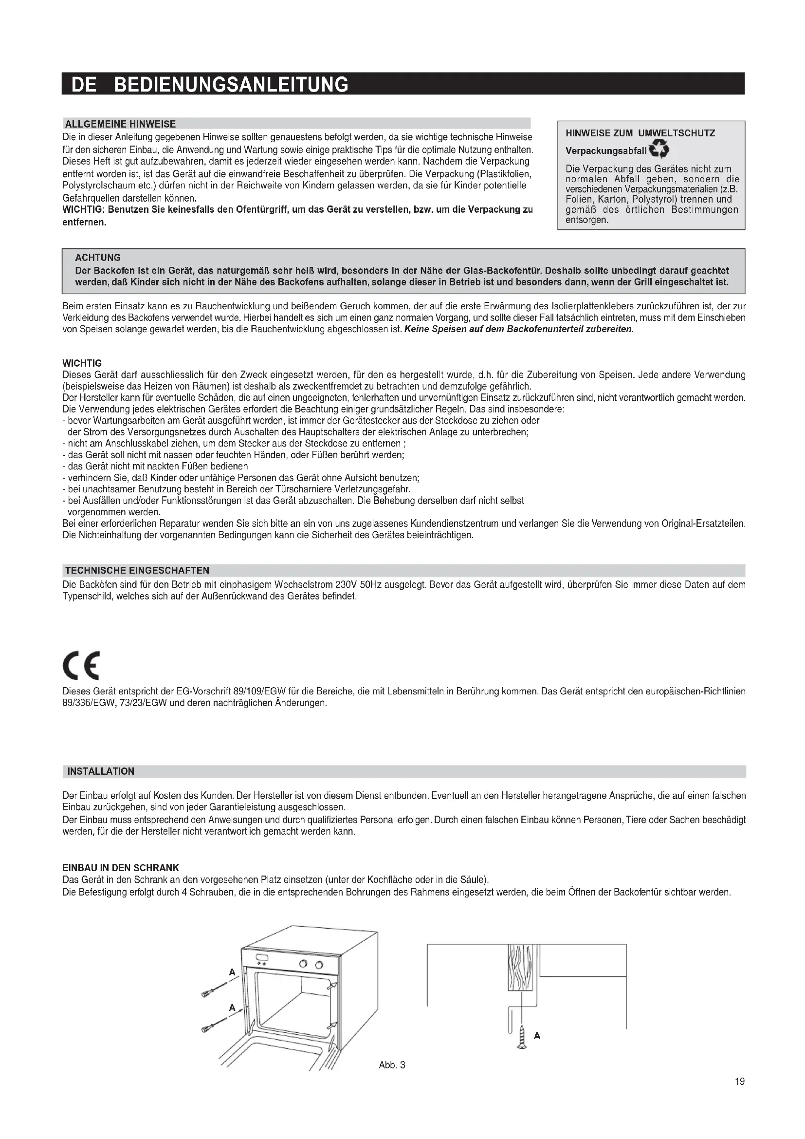 Verpackungsabfall Die Verpackung des Gerätes nicht zum normalen Abfall geben, sondern die verschiedenen Verpackungsmaterialien (z.B. Folien, Karton, Polystyrol) trennen und gemäß des örtlichen Bestimmungen entsorgen. DE BEDIENUNGSANLEITUNG ALLGEMEINE HINWEISE Die in dieser Anleitung gegebenen Hinweise sollten genauestens befolgt werden, da sie wichtige technische Hinweise für den sicheren Einbau, die Anwendung und Wartung sowie einige praktische Tips für die optimale Nutzung enthalten. Dieses Heft ist gut aufzubewahren, damit es jederzeit wieder eingesehen werden kann. Nachdem die Verpackung entfernt worden ist, ist das Gerät auf die einwandfreie Beschaffenheit zu überprüfen. Die Verpackung (Plastikfolien, Polystyrolschaum etc.) dürfen nicht in der Reichweite von Kindern gelassen werden, da sie für Kinder potentielle Gefahrquellen darstellen können. WICHTIG: Benutzen Sie keinesfalls den Ofentürgriff, um das Gerät zu verstellen, bzw. um die Verpackung zu entfernen. ACHTUNG Der Backofen ist ein Gerät, das naturgemäß sehr heiß wird, besonders in der Nähe der Glas-Backofentür. Deshalb sollte unbedingt darauf geachtet werden, daß Kinder sich nicht in der Nähe des Backofens aufhalten, solange dieser in Betrieb ist und besonders dann, wenn der Grill eingeschaltet ist. Beim ersten Einsatz kann es zu Rauchentwicklung und beißendem Geruch kommen, der auf die erste Erwärmung des Isolierplattenklebers zurückzuführen ist, der zur Verkleidung des Backofens verwendet wurde. Hierbei handelt es sich um einen ganz normalen Vorgang, und sollte dieser Fall tatsächlich eintreten, muss mit dem Einschieben von Speisen solange gewartet werden, bis die Rauchentwicklung abgeschlossen ist. Keine Speisen auf dem Backofenunterteil zubereiten. WICHTIG Dieses Gerät darf ausschliesslich für den Zweck eingesetzt werden, für den es hergestellt wurde, d.h. für die Zubereitung von Speisen. Jede andere Verwendung (beispielsweise das Heizen von Räumen) ist deshalb als zweckentfremdet zu betrachten und demzufolge gefährlich. Der Hersteller kann für eventuelle Schäden, die auf einen ungeeigneten, fehlerhaften und unvernünftigen Einsatz zurückzuführen sind, nicht verantwortlich gemacht werden. Die Verwendung jedes elektrischen Gerätes erfordert die Beachtung einiger grundsätzlicher Regeln. Das sind insbesondere: - bevor Wartungsarbeiten am Gerät ausgeführt werden, ist immer der Gerätestecker aus der Steckdose zu ziehen oder der Strom des Versorgungsnetzes durch Auschalten des Hauptschalters der elektrischen Anlage zu unterbrechen; - nicht am Anschlusskabel ziehen, um dem Stecker aus der Steckdose zu entfernen ; - das Gerät soll nicht mit nassen oder feuchten Händen, oder Füßen berührt werden; - das Gerät nicht mit nackten Füßen bedienen - verhindern Sie, daß Kinder oder unfähige Personen das Gerät ohne Aufsicht benutzen; - bei unachtsamer Benutzung besteht in Bereich der Türscharniere Verletzungsgefahr. - bei Ausfällen und/oder Funktionsstörungen ist das Gerät abzuschalten. Die Behebung derselben darf nicht selbst vorgenommen werden. Bei einer erforderlichen Reparatur wenden Sie sich bitte an ein von uns zugelassenes Kundendienstzentrum und verlangen Sie die Verwendung von Original-Ersatzteilen. Die Nichteinhaltung der vorgenannten Bedingungen kann die Sicherheit des Gerätes beieinträchtigen. TECHNISCHE EINGESCHAFTEN Die Backöfen sind für den Betrieb mit einphasigem Wechselstrom 230V 50Hz ausgelegt. Bevor das Gerät aufgestellt wird, überprüfen Sie immer diese Daten auf dem Typenschild, welches sich auf der Außenrückwand des Gerätes befindet. Dieses Gerät entspricht der EG-Vorschrift 89/109/EGW für die Bereiche, die mit Lebensmitteln in Berührung kommen. Das Gerät entspricht den europäischen-Richtlinien 89/336/EGW, 73/23/EGW und deren nachträglichen Änderungen. INSTALLATION Der Einbau erfolgt auf Kosten des Kunden. Der Hersteller ist von diesem Dienst entbunden. Eventuell an den Hersteller herangetragene Ansprüche, die auf einen falschen Einbau zurückgehen, sind von jeder Garantieleistung ausgeschlossen. Der Einbau muss entsprechend den Anweisungen und durch qualifiziertes Personal erfolgen. Durch einen falschen Einbau können Personen, Tiere oder Sachen beschädigt werden, für die der Hersteller nicht verantwortlich gemacht werden kann.