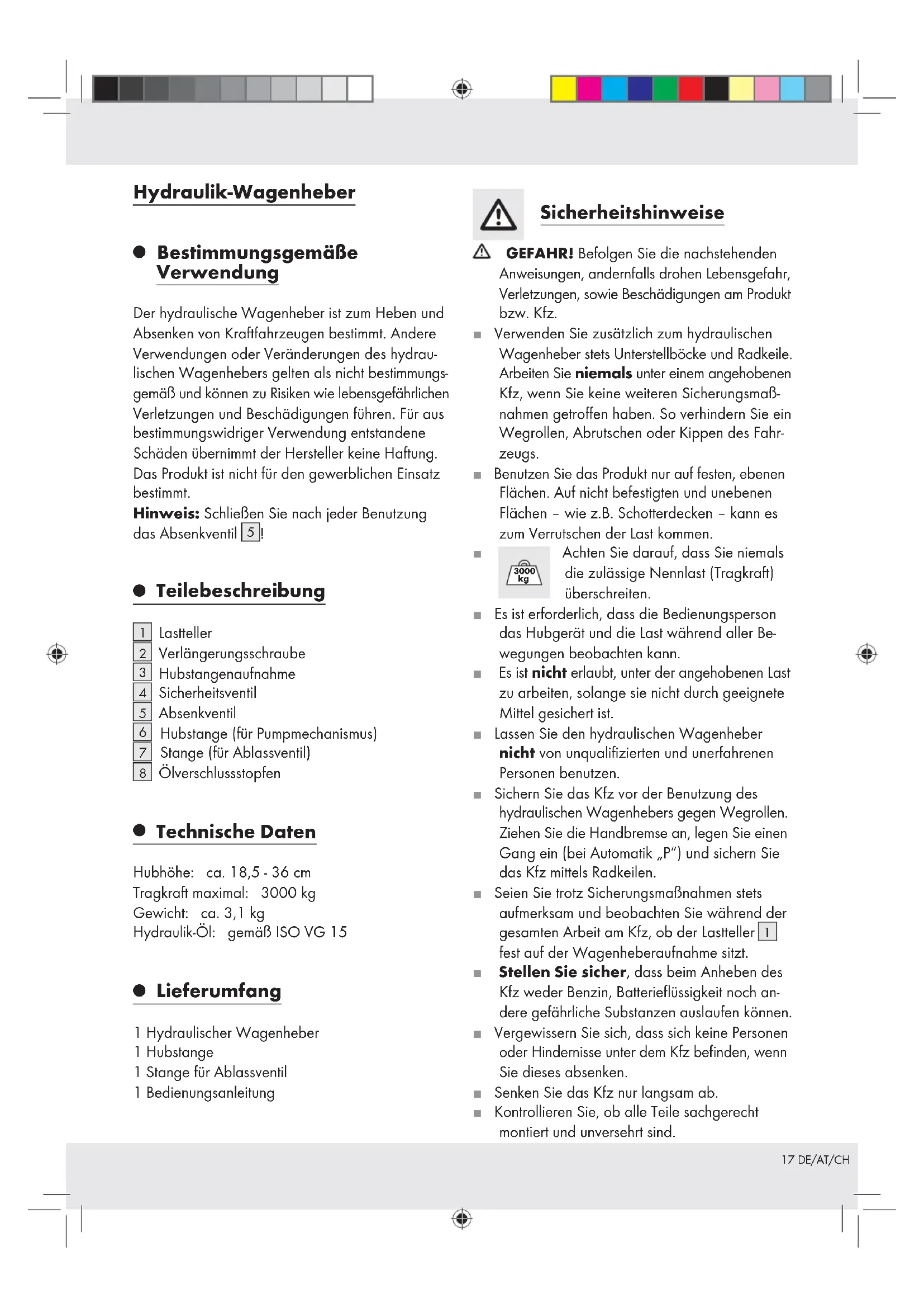 Technische Daten Hubhöhe: ca. 18,5 - 36 cm Tragkraft maximal: 3000 kg Gewicht: ca. 3,1 kg Hydraulik-Öl: gemäß ISO VG 15