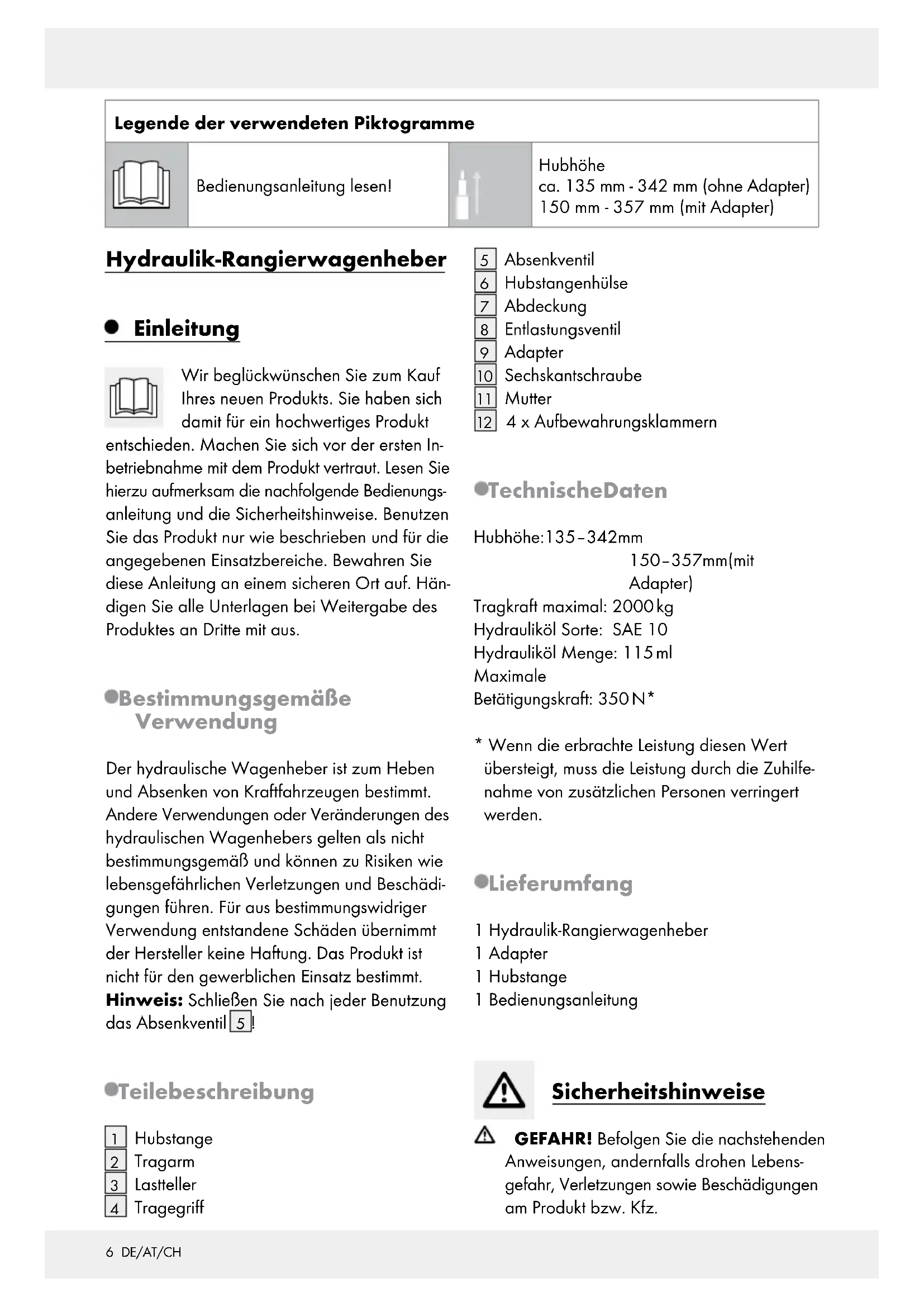 - Wenn die erbrachte Leistung diesen Wert übersteigt, muss die Leistung durch die Zuhilfe- nahme von zusätzlichen Personen verringert werden. Lieferumfang 1 Hydraulik-Rangierwagenheber 1 Adapter 1 Hubstange 1 Bedienungsanleitung Sicherheitshinweise GEFAHR! Befolgen Sie die nachstehenden Anweisungen, andernfalls drohen Lebens- gefahr, Verletzungen sowie Beschädigungen am Produkt bzw. Kfz.7 DE/AT/CH Verwenden Sie zusätzlich zum hydraulischen Wagenheber stets Unterstellböcke und Rad- keile. Arbeiten Sie niemals unter einem angehobenen Kfz, wenn Sie keine weiteren Sicherungsmaßnahmen getroffen haben. So verhindern Sie ein Wegrollen, Abrutschen oder Kippen des Fahrzeugs. Das Hubgerät ist nur zum Anheben geeignet. Benutzen Sie das Produkt nur auf festen, ebe- nen Flächen. Auf nicht befestigten und unebe- nen Flächen – wie z.B. Schotterde cken – kann es zum Verrutschen der Last kommen.