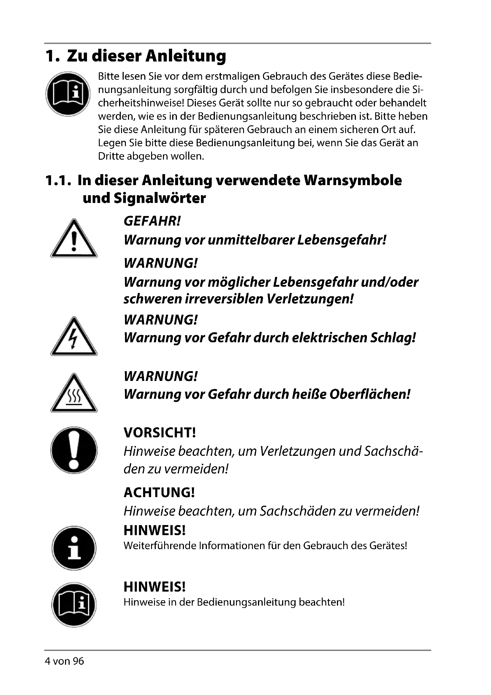 1.1. In dieser Anleitung verwendete Warnsymbole und Signalwörter ....... 4