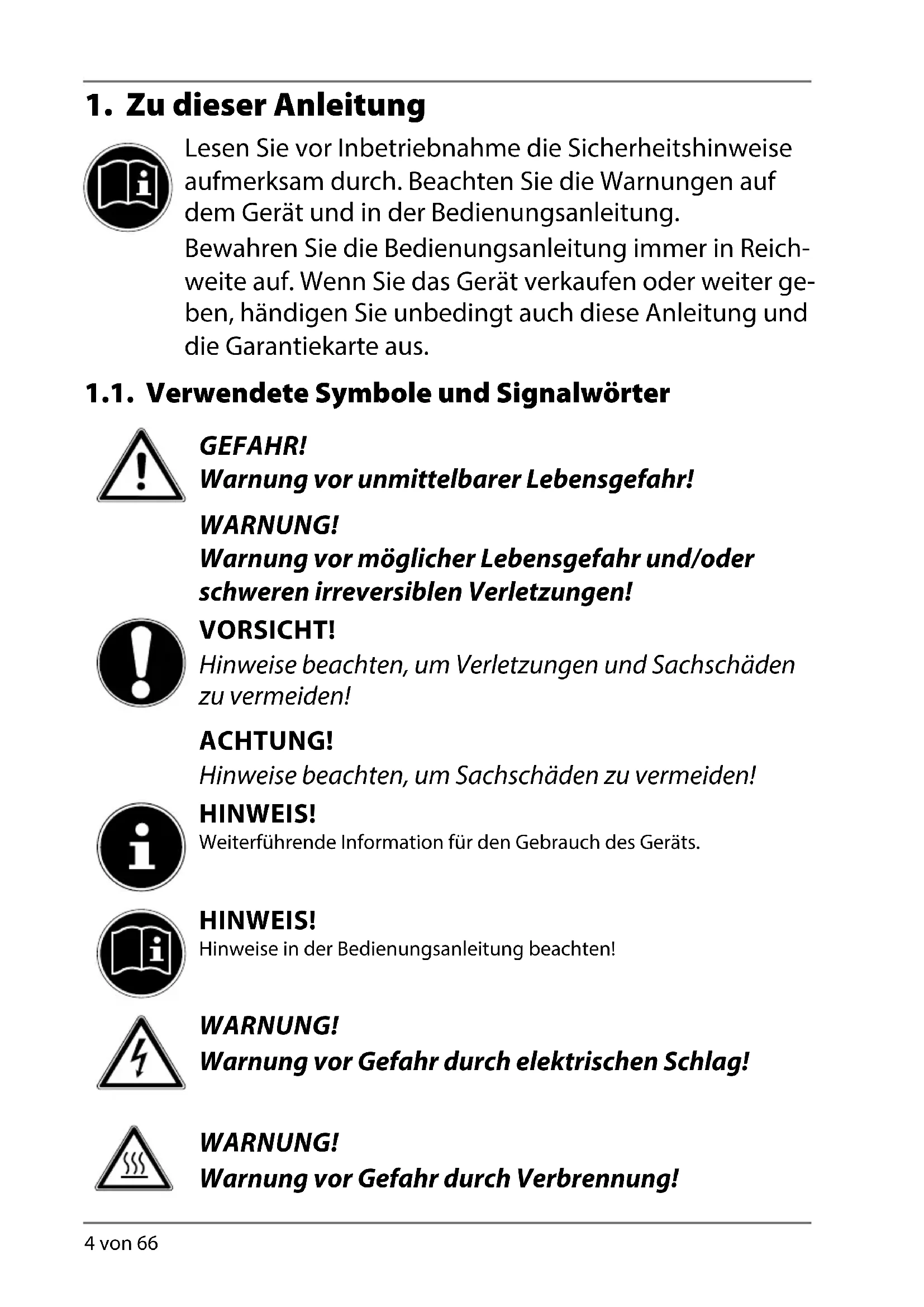 Lesen Sie vor Inbetriebnahme die Sicherheitshinweise aufmerksam durch. Beachten Sie die Warnungen auf dem Gerät und in der Bedienungsanleitung. Bewahren Sie die Bedienungsanleitung immer in Reich- weite auf. Wenn Sie das Gerät verkaufen oder weiter ge- ben, händigen Sie unbedingt auch diese Anleitung und die Garantiekarte aus. 1.1. Verwendete Symbole und Signalwörter GEFAHR! Warnung vor unmittelbarer Lebensgefahr! WARNUNG! Warnung vor möglicher Lebensgefahr und/oder schweren irreversiblen Verletzungen! VORSICHT! Hinweise beachten, um Verletzungen und Sachschäden zu vermeiden! ACHTUNG! Hinweise beachten, um Sachschäden zu vermeiden! HINWEIS! Weiterführende Information für den Gebrauch des Geräts. HINWEIS! Hinweise in der Bedienungsanleitung beachten! WARNUNG! Warnung vor Gefahr durch elektrischen Schlag! WARNUNG! Warnung vor Gefahr durch Verbrennung! 15717 MULI eCommerce Content RC2.indb 415717 MULI eCommerce Content RC2.indb 4 02.12.2014 08:48:0102.12.2014 08:48:01DE