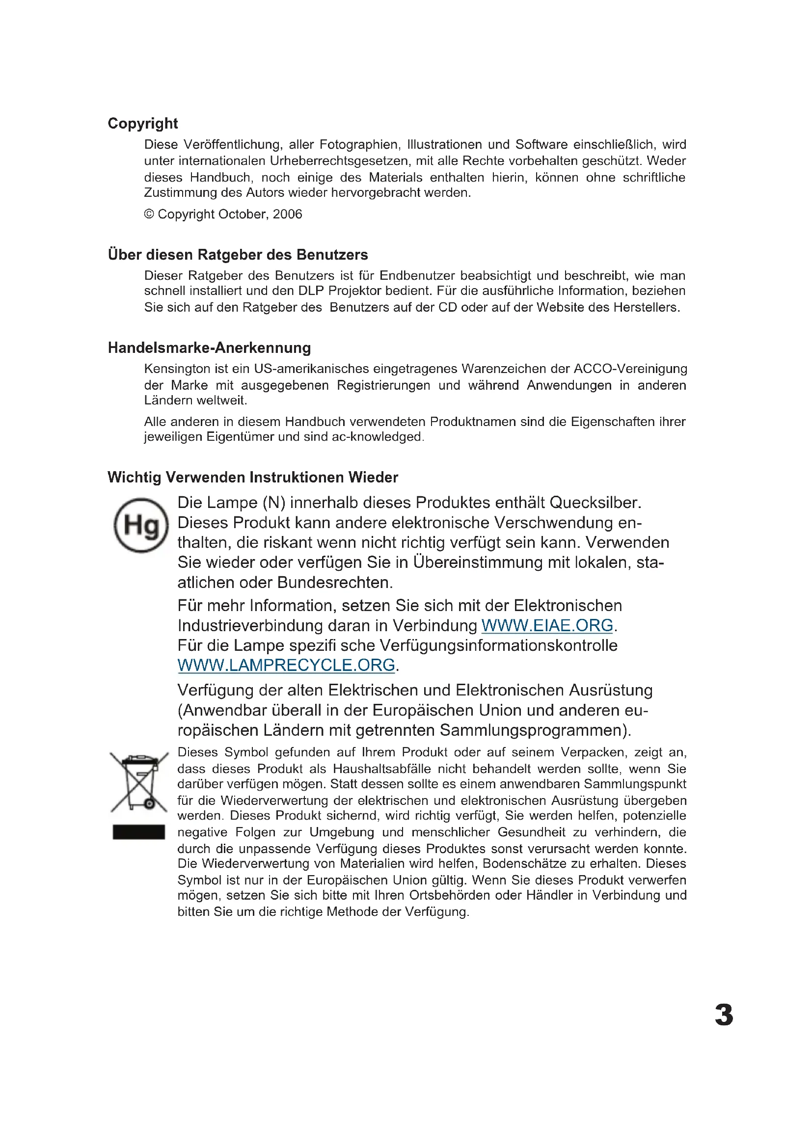 Planar Systems, Inc. Корпоративный Штаб 1195 NW Compton Drive, USA Beaverton, OR 97006-1992 Planar Поддержка Клиента Телефон: США: 1-866-PLANAR1 (866) 752-6271 Внутри США: +1 (503) 748-5799 E-mail: PlanarSupport@planar.com Онлайн Техническая Библиотека: http://www.planar.com/support Часы: M-F, 8am - 8pm ET, 12pm - 12am GMT3 Copyright Diese Veröffentlichung, aller Fotographien, Illustrationen und Software einschließlich, wird unter internationalen Urheberrechtsgesetzen, mit alle Rechte vorbehalten geschützt. Weder dieses Handbuch, noch einige des Materials enthalten hierin, können ohne schriftliche Zustimmung des Autors wieder hervorgebracht werden. © Copyright October, 2006 Über diesen Ratgeber des Benutzers Dieser Ratgeber des Benutzers ist für Endbenutzer beabsichtigt und beschreibt, wie man schnell installiert und den DLP Projektor bedient. Für die ausführliche Information, beziehen Sie sich auf den Ratgeber des Benutzers auf der CD oder auf der Website des Herstellers. Handelsmarke-Anerkennung Kensington ist ein US-amerikanisches eingetragenes Warenzeichen der ACCO-Vereinigung der Marke mit ausgegebenen Registrierungen und während Anwendungen in anderen Ländern weltweit. Alle anderen in diesem Handbuch verwendeten Produktnamen sind die Eigenschaften ihrer jeweiligen Eigentümer und sind ac-knowledged. Wichtig Verwenden Instruktionen Wieder Die Lampe (N) innerhalb dieses Produktes enthält Quecksilber. Dieses Produkt kann andere elektronische Verschwendung en- thalten, die riskant wenn nicht richtig verfügt sein kann. Verwenden Sie wieder oder verfügen Sie in Übereinstimmung mit lokalen, sta- atlichen oder Bundesrechten. Für mehr Information, setzen Sie sich mit der Elektronischen Industrieverbindung daran in Verbindung WWW.EIAE.ORG. Für die Lampe spezifi sche Verfügungsinformationskontrolle WWW.LAMPRECYCLE.ORG. Verfügung der alten Elektrischen und Elektronischen Ausrüstung (Anwendbar überall in der Europäischen Union und anderen eu- ropäischen Ländern mit getrennten Sammlungsprogrammen). Dieses Symbol gefunden auf Ihrem Produkt oder auf seinem Verpacken, zeigt an, dass dieses Produkt als Haushaltsabfälle nicht behandelt werden sollte, wenn Sie darüber verfügen mögen. Statt dessen sollte es einem anwendbaren Sammlungspunkt für die Wiederverwertung der elektrischen und elektronischen Ausrüstung übergeben werden. Dieses Produkt sichernd, wird richtig verfügt, Sie werden helfen, potenzielle negative Folgen zur Umgebung und menschlicher Gesundheit zu verhindern, die durch die unpassende Verfügung dieses Produktes sonst verursacht werden konnte. Die Wiederverwertung von Materialien wird helfen, Bodenschätze zu erhalten. Dieses Symbol ist nur in der Europäischen Union gültig. Wenn Sie dieses Produkt verwerfen mögen, setzen Sie sich bitte mit Ihren Ortsbehörden oder Händler in Verbindung und bitten Sie um die richtige Methode der Verfügung.4 Durchführungswarnungen Vor der Installation und dem Verwenden des Projektors, lesen Sie die Durchführungsbenach richtigungen im “Durchführungsgehorsam” Abteilung auf der Seite 45. Schreiben Sie Ihr Planares Produkt Heute Ein Dankt Ihnen, um Planar zu wählen. Um zu versichern, erhalten Sie alle Vorteile Ihres Planaren Produktes und Dienstleistungen, schreiben Ihr Planares Produkt heute ein. Besuchen Sie unsere Website: http://www.planar.com/support/product_registation.html Kabel, Ersatz-Lampen und Zusätze Kabel, Ersatz-Lampen und Zusätze für Ihren Planaren Projektor, Flüssigkristallanzeige- Monitor, Berührung - Schirm, oder andere Planare Produkte zu fi nden, besuchen unser On-Line-Lager: http://www.PlanarOnlone.com oder fi nden andere Lager dass Lager Planare Produkte daran http://www.planar.com/howtobuy.5