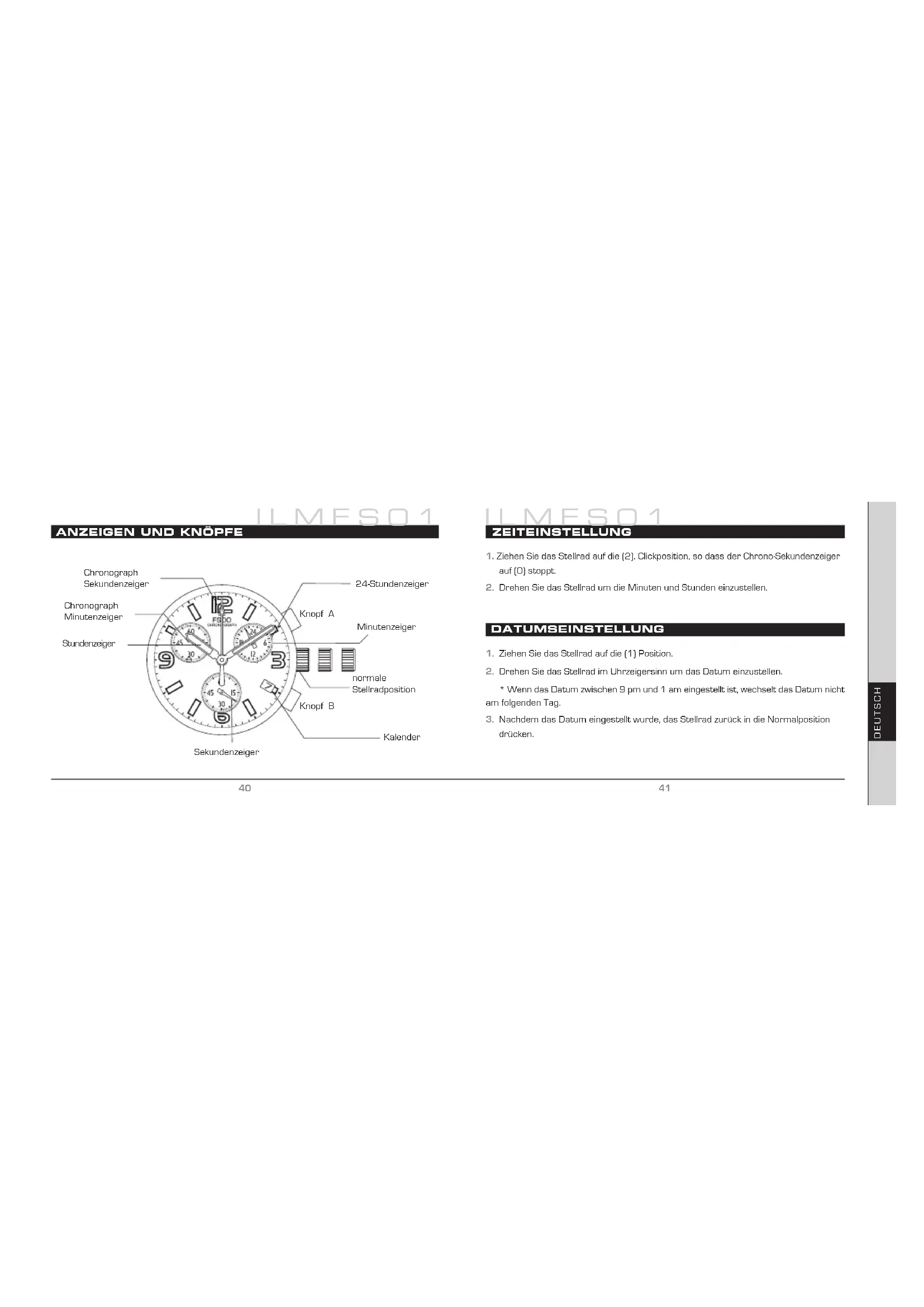 ILMFS01 BETRIEBSANLEITUNG Anzeigen und knöpfe Zeiteinstellung Datumseinstellung Gebrauch des chronographen Tachymeter Basisspezifikationen