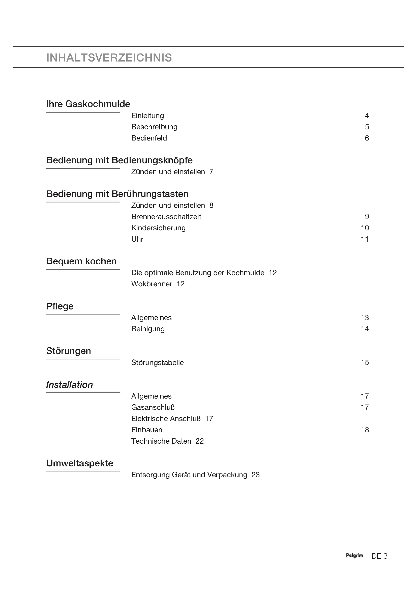 - Setzen Sie die Brennerteile zusammen. Achten Sie dabei auf die Aussparungen für die Zündkerze und das Thermoelement. Sorgen Sie dafür, dass die Brennerteile flach liegen. PFLEGEDE 14 Reinigung Reinigen der Topfrost Reinigen Sie die Topfroste nicht im Geschirrspüler. Die Emaille auf den Topfrost kann im Geschirrspüler gereinigt werden, aber die Verbindung mit den Gummifüßen ist dazu jedoch nicht geeignet. Darüber hinaus kann bei Reinigung im Geschirrspüler eine leichte Verfärbung der Topfroste auftreten. Wenn die Gummifüße verloren gehen, kann der Topfrost die Glasplatte beschädigen. Hartnäckige Flecken auf Email (Topfroste, Brennerdeckel) Hartnäckige Flecken mit flüssigem Scheuerpulver entfernen. Verwenden Sie keine Scheuermittel, Scheuerkissen, spitze Gegenstände oder ätzende Reinigungsmittel. Reinigung entfernbaren Brennerteilen Brennerteile dürfen nicht im Geschirrspüler gereinigt werden. Die Teile können durch das Geschirrspülmittel angegriffen werden! Die entfernbaren Brennerteile (einschließlich Wok) können am besten mit einem milden Spülmittel und einem weichen Tuch gereinigt werden. Bei hartnäckigen Flecken können Sie die Teile in Wasser mit Spülmittel weichen lassen. Keine Scheuermittel, Scheuerschwämme, scharfe Gegenstände oder aggressiven Reinigungsmittel verwenden. Hartnäckige Flecken auf der Glasplatte Reinigen Sie die Glasplatte mit einem Spezialreinigungsmittel für Glaskeramik-Kochfelder. Wasserflecken oder Kalkreste reinigt man am besten mit Haushaltsessig. PFLEGEDE 15 Störungstabelle Wenn das Gerät nicht ordnungsgemäß funktioniert, bedeutet das nicht unbedingt, dass es defekt ist. Versuchen Sie eventuell, das Problem selbst zu lösen mit Hilfe der nachfolgenden Tabelle, oder suchen Sie nach weiteren Informationen auf der Website ‘www.pelgrimservice.nl’. Störung Ursache Abhilfe Es riecht nach Gas im Geräteumfeld. Der Anschluss des Geräts leckt. Schließen Sie den Haupt gashahn. Wenden Sie sich an Ihren Installateur. Ein Brenner zündet nicht. Stecker nicht in der Steckdose. Stecken Sie den Stecker in die Steckdose. Sicherung defekt/Sicherung im Zählerschrank ausgeschaltet. Montieren Sie eine neue Sicherung oder schalten Sie die automatische Sicherung wieder ein. Zündkerze verschmutzt/feucht. Reinigen/trocknen Sie die Zündkerze. Brennerteile nicht richtig aufgesetzt. Setzen Sie die Brennerteile über die Zentriernocken zusammen. Brennerteile verschmutzt/feucht. Reinigen/trocknen Sie die Brennerteile. Achten Sie dabei darauf, dass die Aus ström- öffnungen offen sind. Hauptgashahn geschlossen. Öffnen Sie den Hauptgashahn. Störung am Gasnetz. Fragen Sie bei Ihrem Gaslieferanten nach. Gasflasche oder -tank ist leer. Schließen Sie eine neue Gasflasche an oder lassen Sie den Tank füllen. Falsche Gasart verwendet. Kontrollieren Sie, ob das verwendete Gas für das Gerät geeignet ist. Wenn dies nicht der Fall ist, wenden Sie sich an Ihren Installateur. Bedienungsknopf nicht tief genug eingedrückt. Halten Sie den Knopf zwischen Groß- und Kleinstellung tief genug eingedrückt. Bei der ersten Inbetriebnahme kann dies im Zusammenhang mit der Gaszufuhr länger dauern. STÖRUNGENDE 16 STÖRUNGEN Störung Ursache Abhilfe Der Brenner brennt nicht egal. Brennerteile nicht richtig aufgesetzt. Setzen Sie die Brennerteile über die Zentrierzapfen zusammen. Brennerteile verschmutzt/feucht. Reinigen/trocknen Sie die Brennerteile. Achten Sie dabei darauf, dass die Aus- strömöffnungen offen sind. Falsche Gasart verwendet. Kontrollieren Sie, ob das verwendete Gas für das Gerät geeignet ist. Wenn dies nicht der Fall ist, wenden Sie sich an Ihren Installateur. Der Brenner erlischt nach dem Zünden. Bedienungsknopf nicht lange genug eingedrückt. Halten Sie den Knopf mindestens 5 Sekunden eingedrückt. Fehlercode ‘b’. Ein einzelner Brenner ist gesperrt. Geben Sie den Brenner frei (siehe Seite 10). Fehlercode ‘Flt06’. Die Höchstgrenze von 5 Freigaben innerhalb von 15 Minuten wurde überschritten. Das Gerät akzeptiert in den nächsten 15 Minuten keine weiteren Freigabeversuche mehr. Fehlercode ‘Flt09’. Elektronische Störung. Geben Sie den Brenner frei (siehe Seite 10). Nehmen Sie Bitte Kontakt auf mit der Serviceabteilung. Weitere Fehlercodes. Nehmen Sie Bitte Kontakt auf mit der Serviceabteilung.DE 17 Allgemeines Dieses Gerät darf nur von einem anerkannten Installateur angeschlossen werden! Der Gasanschluß und elektrische Anschluß muß den nationalen und lokalen Vorschriften entsprechen. Achtung! Gasart und Land, wofür sich das Gerät eignet, sind auf dem Typenschild angegeben. Dies ist ein Klasse-3 Gerät. Gasanschluß
