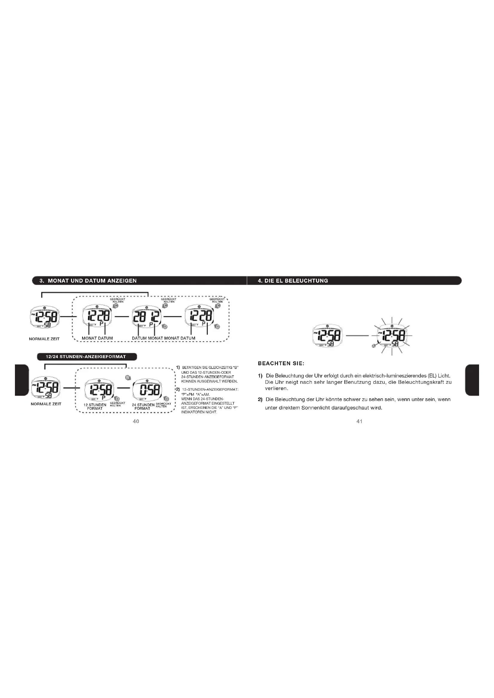 - Monat, Datum AM/PM und Elektro- Lumineszenz-Anzeigebeleuchtung.