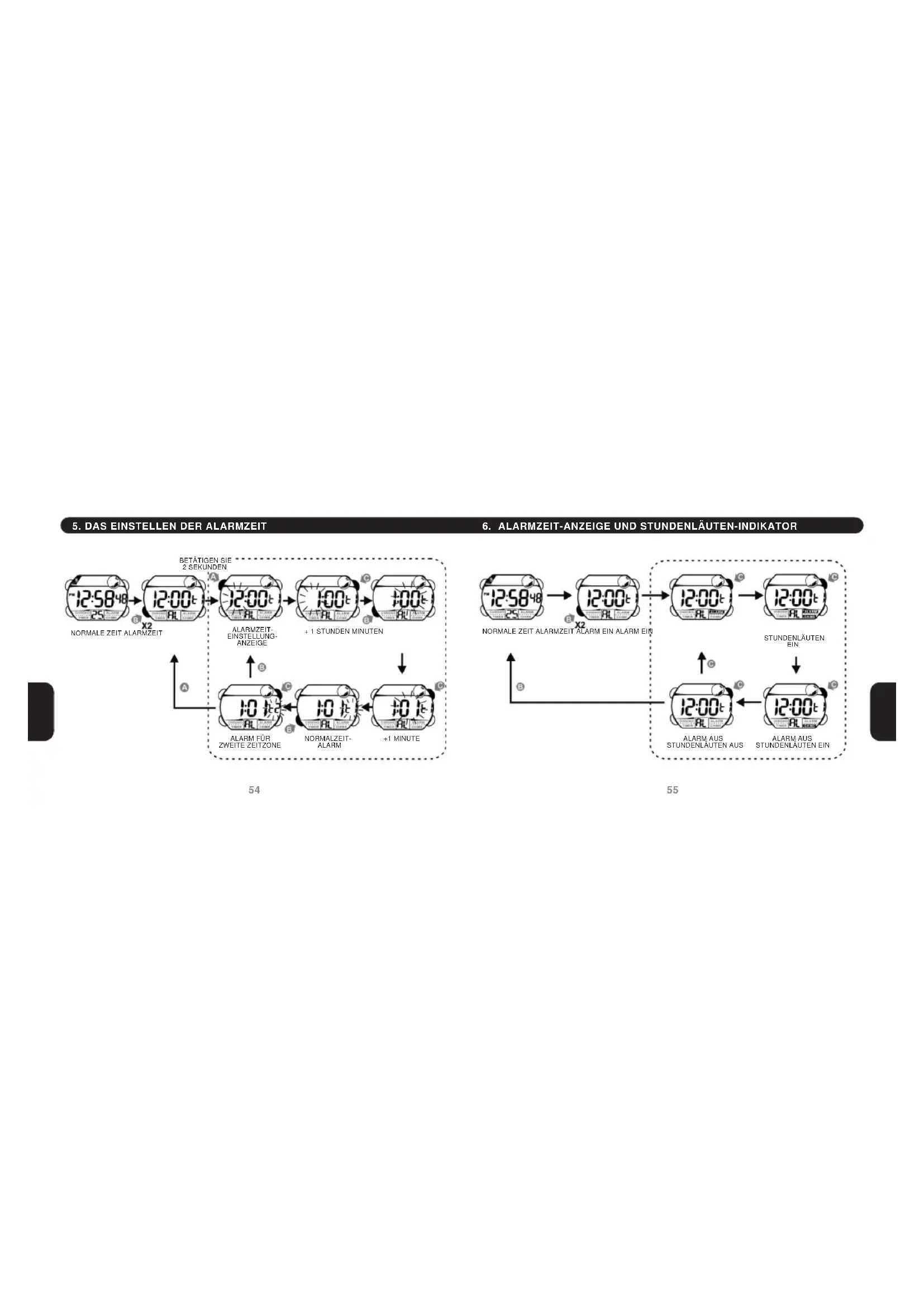 ZWEITE ZEITZONE NORMALZEIT- ALARM +1 MINUTE NORMALE ZEIT ALARMZEIT ALARM EIN ALARM EIN STUNDENLÄUTEN EIN ALARM AUS