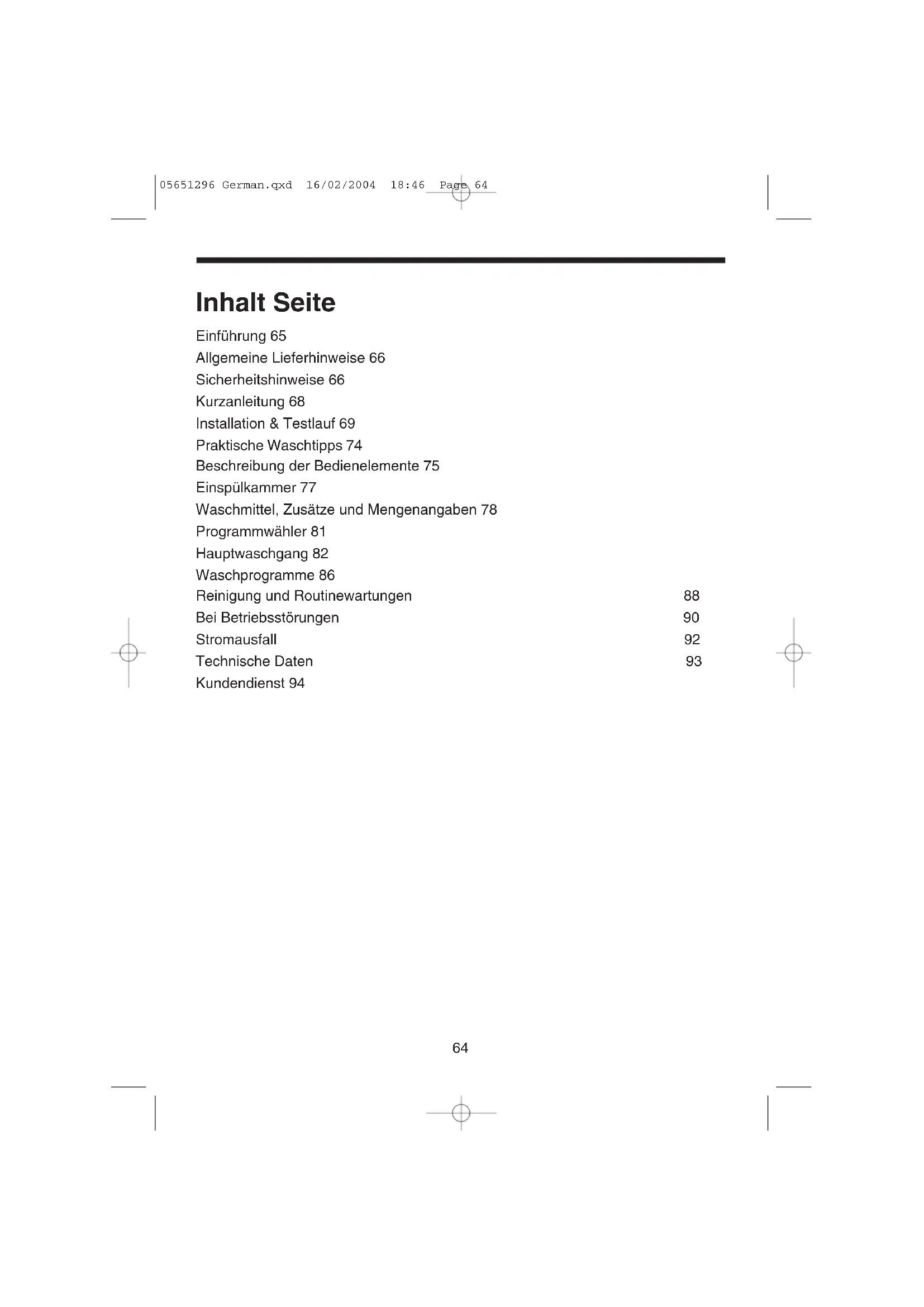 der Waschmaschine fest. Drücken Sie den -Knopf und nehmen Sie die Wäsche heraus. Ungefähr zwei Minuten nach einem Stromausfall kann die Tür einfach durch Drücken des -Knopfes geöffnet werden. Tür nicht mit Gewalt öffnen. Wichtig: Wasser und Wäsche können sehr heiß sein! 05651296 German.qxd 16/02/2004 18:47 Page 9293 Technische Daten