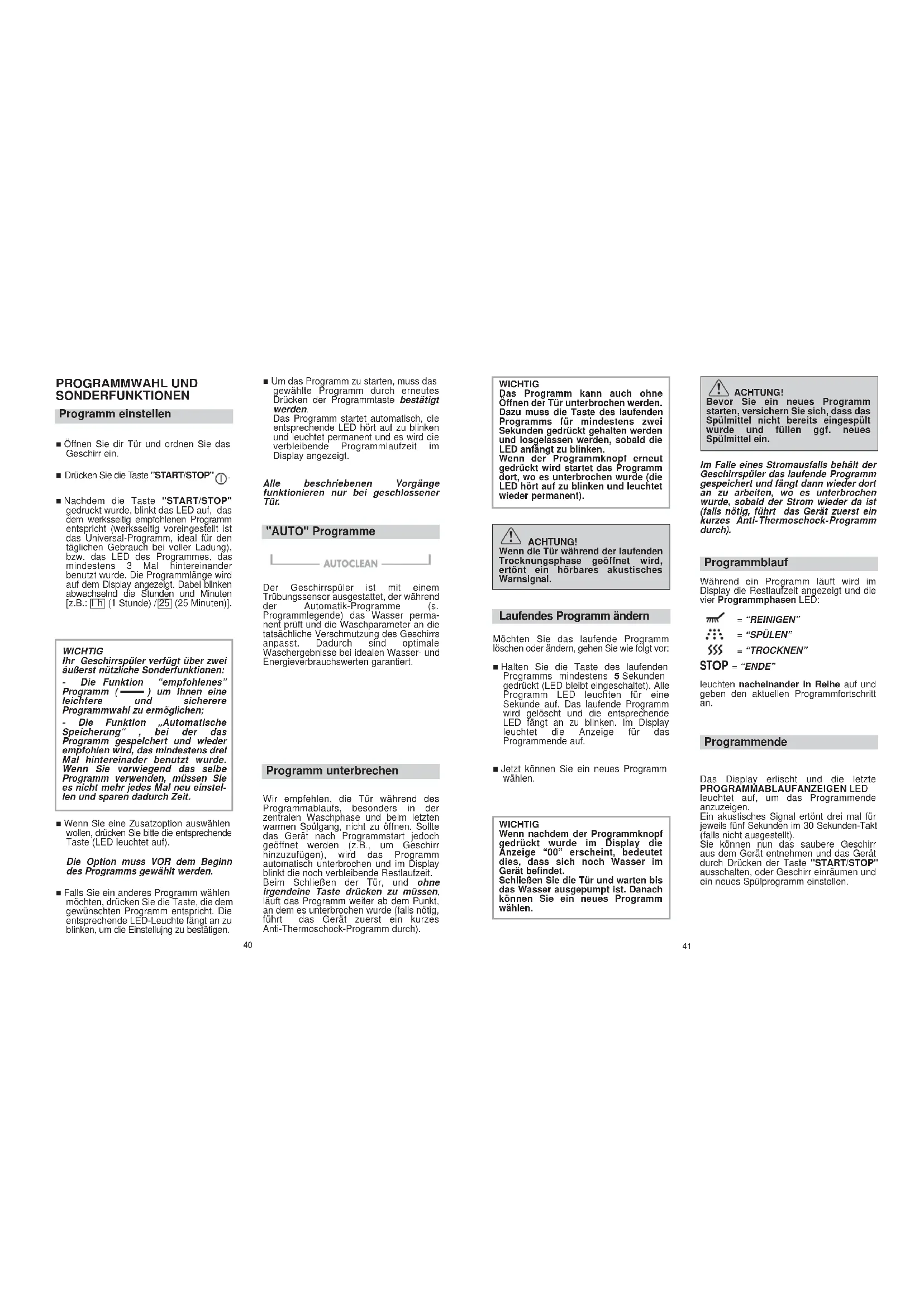 M40 PROGRAMMWAHL UND SONDERFUNKTIONEN Programm einstellen ■ Öffnen Sie dir Tür und ordnen Sie das Geschirr ein. ■ Drücken Sie die Taste "START/STOP" . ■ Nachdem die Taste "START/STOP" gedruckt wurde, blinkt das LED auf, das dem werksseitig empfohlenen Programm entspricht (werksseitig voreingestellt ist das Universal-Programm, ideal für den täglichen Gebrauch bei voller Ladung), bzw. das LED des Programmes, das mindestens 3 Mal hintereinander benutzt wurde. Die Programmlänge wird auf dem Display angezeigt. Dabei blinken abwechselnd die Stunden und Minuten [z.B.: 1 h (1 Stunde) / 25 (25 Minuten)]. WICHTIG Ihr Geschirrspüler verfügt über zwei äußerst nützliche Sonderfunktionen: - Die Funktion “empfohlenes” Programm ( ) um Ihnen eine leichtere und sicherere Programmwahl zu ermöglichen; - Die Funktion „Automatische Speicherung“ , bei der das Programm gespeichert und wieder empfohlen wird, das mindestens drei Mal hintereinader benutzt wurde. Wenn Sie vorwiegend das selbe Programm verwenden, müssen Sie es nicht mehr jedes Mal neu einstel- len und sparen dadurch Zeit. ■ Wenn Sie eine Zusatzoption auswählen wollen, drücken Sie bitte die entsprechende Taste (LED leuchtet auf). Die Option muss VOR dem Beginn des Programms gewählt werden. ■ Falls Sie ein anderes Programm wählen möchten, drücken Sie die Taste, die dem gewünschten Programm entspricht. Die entsprechende LED-Leuchte fängt an zu blinken, um die Einstellujng zu bestätigen. ■ Um das Programm zu starten, muss das gewählte Programm durch erneutes Drücken der Programmtaste bestätigt werden. Das Programm startet automatisch, die entsprechende LED hört auf zu blinken und leuchtet permanent und es wird die verbleibende Programmlaufzeit im Display angezeigt. Alle beschriebenen Vorgänge funktionieren nur bei geschlossener Tür. "AUTO" Programme Der Geschirrspüler ist mit einem Trübungssensor ausgestattet, der während der Automatik-Programme (s. Programmlegende) das Wasser perma- nent prüft und die Waschparameter an die tatsächliche Verschmutzung des Geschirrs anpasst. Dadurch sind optimale Waschergebnisse bei idealen Wasser- und Energieverbrauchswerten garantiert. Programm unterbrechen Wir empfehlen, die Tür während des Programmablaufs, besonders in der zentralen Waschphase und beim letzten warmen Spülgang, nicht zu öffnen. Sollte das Gerät nach Programmstart jedoch geöffnet werden (z.B., um Geschirr hinzuzufügen), wird das Programm automatisch unterbrochen und im Display blinkt die noch verbleibende Restlaufzeit. Beim Schließen der Tür, und ohne irgendeine Taste drücken zu müssen, läuft das Programm weiter ab dem Punkt, an dem es unterbrochen wurde (falls nötig, führt das Gerät zuerst ein kurzes Anti-Thermoschock-Programm durch).