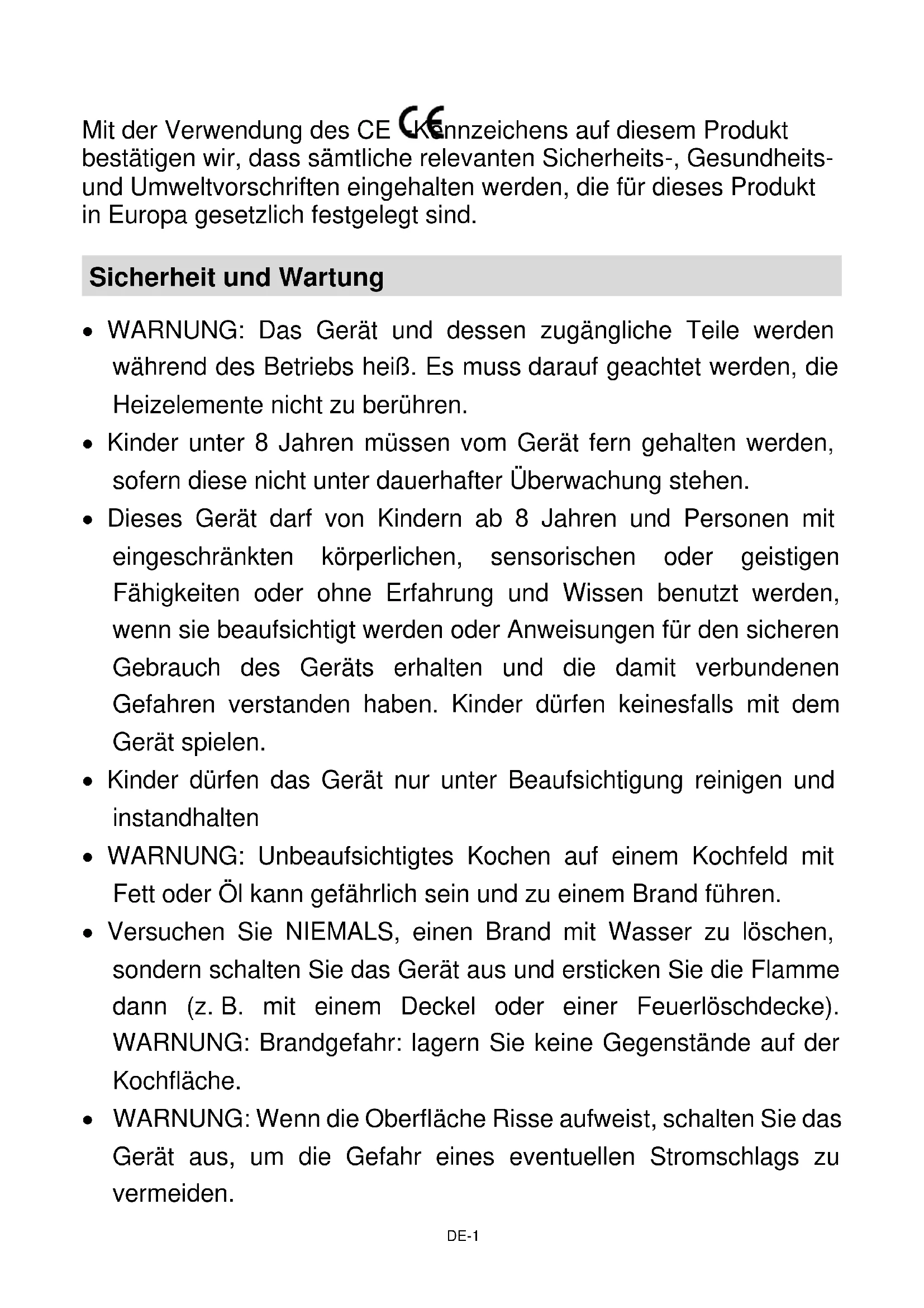 - VORSICHT: Um eine Gefährdung durch das versehentliches Zurücksetzen des Überhitzungsschutzes zu vermeiden, darf dieses Gerät nicht durch eine externes Schaltgerät, z. B. einen Timer betrieben werden oder an einen Schaltkreis angeschlossen werden, der regelmäßig durch ein Dienstprogramm ein- und ausgeschaltet wird.DE-3 Sehr geehrter Kunde! Vielen Dank für den Kauf dieses Induktions-Kochfelds. Lesen Sie dieses Handbuch vor der Benutzung des Kochfelds aufmerksam durch und bewahren Sie es für zukünftige Zwecke sicher auf. Produktinformationen Das Induktions-Kochfeld eignet sich mit seinen elektromagnetischen Kochzonen, mikro- computergesteuerten Bedienelementen und vielfältigen Funktionen für alle Arten von Gerichten und ist die ideale Wahl für die Familie von heute. Das Induktions-Kochfeld wird aus speziellen Materialien hergestellt und ist extrem benutzerfreundlich, langlebig und sicher.
