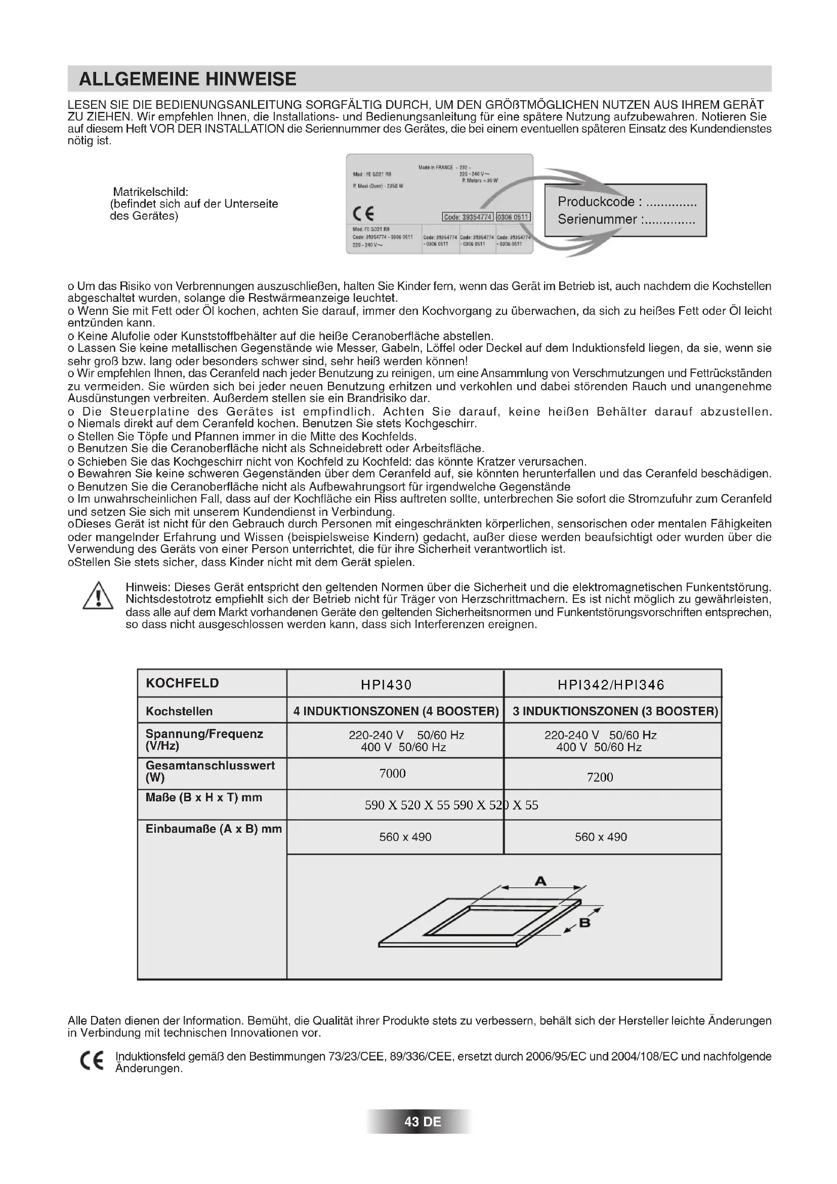 - Los ciclos de on/off varían según el nivel de calor deseado: - nivel bajo: período de funcionamiento breve, - nivel elevado: período de funcionamiento largo 30° Maxi Este electrodoméstico tiene la marca de cumplimiento de la Directiva Europea 2002/96/EC sobre Residuos de Aparatos Eléctricos y Electrónicos (RAEE). Asegurando un desguace correcto del aparato, usted puede ayudar a prevenir las consecuencias potenciales negativas para el medio ambiente y la salud de las personas. El símbolo en el aparato, o en los documentos que lo acompañan, indica que el electrodoméstico no debe tratarse como residuo doméstico. El aparato ha de depositarse en un centro de recogida para el reciclaje del equipo eléctrico y electrónico. Deshágase del electrodoméstico cumpliendo las normativas locales sobre eliminación de residuos. Para más información sobre el tratamiento, recuperación y el reciclaje del electrodoméstico, póngase en contacto con la oficina local competente, el servicio de recogida de residuos domésticos o la tienda donde lo compró.43 DE LESEN SIE DIE BEDIENUNGSANLEITUNG SORGFÄLTIG DURCH, UM DEN GRÖßTMÖGLICHEN NUTZEN AUS IHREM GERÄT ZU ZIEHEN. Wir empfehlen Ihnen, die Installations- und Bedienungsanleitung für eine spätere Nutzung aufzubewahren. Notieren Sie auf diesem Heft VOR DER INSTALLATION die Seriennummer des Gerätes, die bei einem eventuellen späteren Einsatz des Kundendienstes nötig ist. Alle Daten dienen der Information. Bemüht, die Qualität ihrer Produkte stets zu verbessern, behält sich der Hersteller leichte Änderungen in Verbindung mit technischen Innovationen vor. Induktionsfeld gemäß den Bestimmungen 73/23/CEE, 89/336/CEE, ersetzt durch 2006/95/EC und 2004/108/EC und nachfolgende Änderungen. o Um das Risiko von Verbrennungen auszuschließen, halten Sie Kinder fern, wenn das Gerät im Betrieb ist, auch nachdem die Kochstellen abgeschaltet wurden, solange die Restwärmeanzeige leuchtet. o Wenn Sie mit Fett oder Öl kochen, achten Sie darauf, immer den Kochvorgang zu überwachen, da sich zu heißes Fett oder Öl leicht entzünden kann. o Keine Alufolie oder Kunststoffbehälter auf die heiße Ceranoberfläche abstellen. o Lassen Sie keine metallischen Gegenstände wie Messer, Gabeln, Löffel oder Deckel auf dem Induktionsfeld liegen, da sie, wenn sie sehr groß bzw. lang oder besonders schwer sind, sehr heiß werden können! o Wir empfehlen Ihnen, das Ceranfeld nach jeder Benutzung zu reinigen, um eine Ansammlung von Verschmutzungen und Fettrückständen zu vermeiden. Sie würden sich bei jeder neuen Benutzung erhitzen und verkohlen und dabei störenden Rauch und unangenehme Ausdünstungen verbreiten. Außerdem stellen sie ein Brandrisiko dar. o Die Steuerplatine des Gerätes ist empfindlich. Achten Sie darauf, keine heißen Behälter darauf abzustellen. o Niemals direkt auf dem Ceranfeld kochen. Benutzen Sie stets Kochgeschirr. o Stellen Sie Töpfe und Pfannen immer in die Mitte des Kochfelds. o Benutzen Sie die Ceranoberfläche nicht als Schneidebrett oder Arbeitsfläche. o Schieben Sie das Kochgeschirr nicht von Kochfeld zu Kochfeld: das könnte Kratzer verursachen. o Bewahren Sie keine schweren Gegenständen über dem Ceranfeld auf, sie könnten herunterfallen und das Ceranfeld beschädigen. o Benutzen Sie die Ceranoberfläche nicht als Aufbewahrungsort für irgendwelche Gegenstände o Im unwahrscheinlichen Fall, dass auf der Kochfläche ein Riss auftreten sollte, unterbrechen Sie sofort die Stromzufuhr zum Ceranfeld und setzen Sie sich mit unserem Kundendienst in Verbindung. oDieses Gerät ist nicht für den Gebrauch durch Personen mit eingeschränkten körperlichen, sensorischen oder mentalen Fähigkeiten oder mangelnder Erfahrung und Wissen (beispielsweise Kindern) gedacht, außer diese werden beaufsichtigt oder wurden über die Verwendung des Geräts von einer Person unterrichtet, die für ihre Sicherheit verantwortlich ist. oStellen Sie stets sicher, dass Kinder nicht mit dem Gerät spielen. Hinweis: Dieses Gerät entspricht den geltenden Normen über die Sicherheit und die elektromagnetischen Funkentstörung. Nichtsdestotrotz empfiehlt sich der Betrieb nicht für Träger von Herzschrittmachern. Es ist nicht möglich zu gewährleisten, dass alle auf dem Markt vorhandenen Geräte den geltenden Sicherheitsnormen und Funkentstörungsvorschriften entsprechen, so dass nicht ausgeschlossen werden kann, dass sich Interferenzen ereignen. ALLGEMEINE HINWEISE Matrikelschild: (befindet sich auf der Unterseite des Gerätes) KOCHFELD Kochstellen Spannung/Frequenz (V/Hz) Gesamtanschlusswert (W) Maße (B x H x T) mm Einbaumaße (A x B) mm 4 INDUKTIONSZONEN (4 BOOSTER) 220-240 V~ 50/60 Hz 400 V 50/60 Hz 560 x 490 3 INDUKTIONSZONEN (3 BOOSTER) 220-240 V~ 50/60 Hz 400 V 50/60 Hz 560 x 490 Produckcode : .............. Serienummer :..............