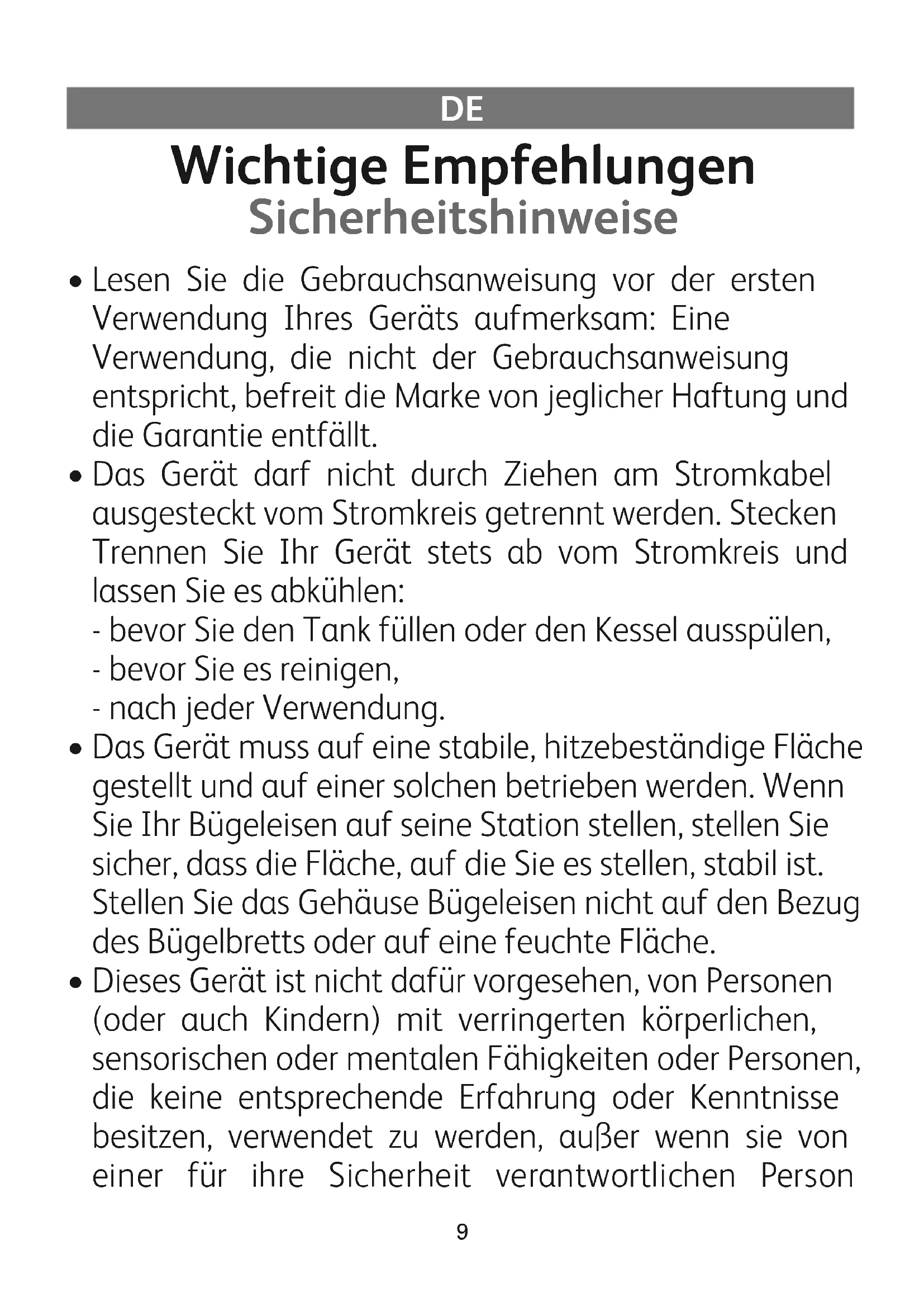 - Ihr Gerät erzeugt Dampf, der Verbrennungen verursachen kann. Gehen Sie vorsichtig mit dem Bügeleisenum, vor allem beim vertikalen Bügeln Dampfen. Richten Sie den Dampf niemals gegen Personen oder iere.