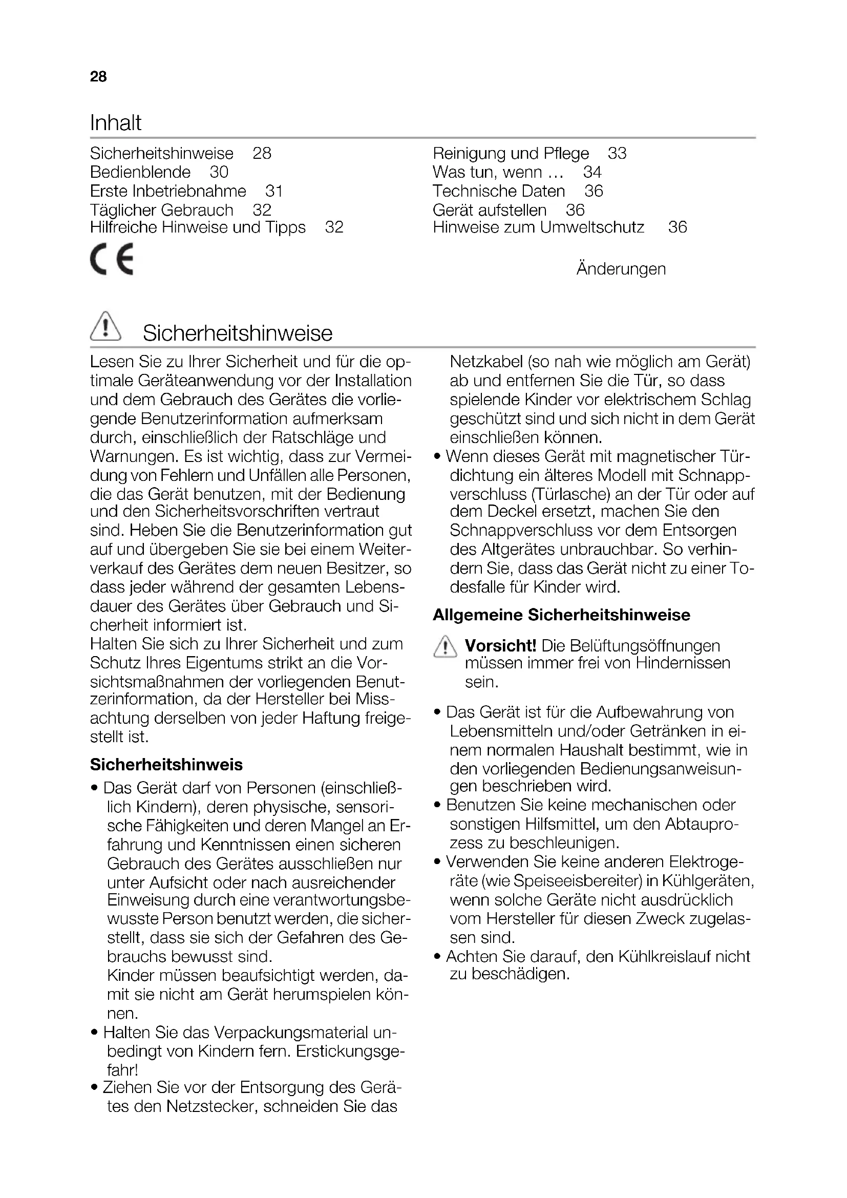 - Wenn dieses Gerät mit magnetischer Tür- dichtung ein älteres Modell mit Schnapp- verschluss (Türlasche) an der Tür oder auf dem Deckel ersetzt, machen Sie den Schnappverschluss vor dem Entsorgen des Altgerätes unbrauchbar. So verhin- dern Sie, dass das Gerät nicht zu einer To- desfalle für Kinder wird. Allgemeine Sicherheitshinweise Vorsicht! Die Belüftungsöffnungen müssen immer frei von Hindernissen sein.