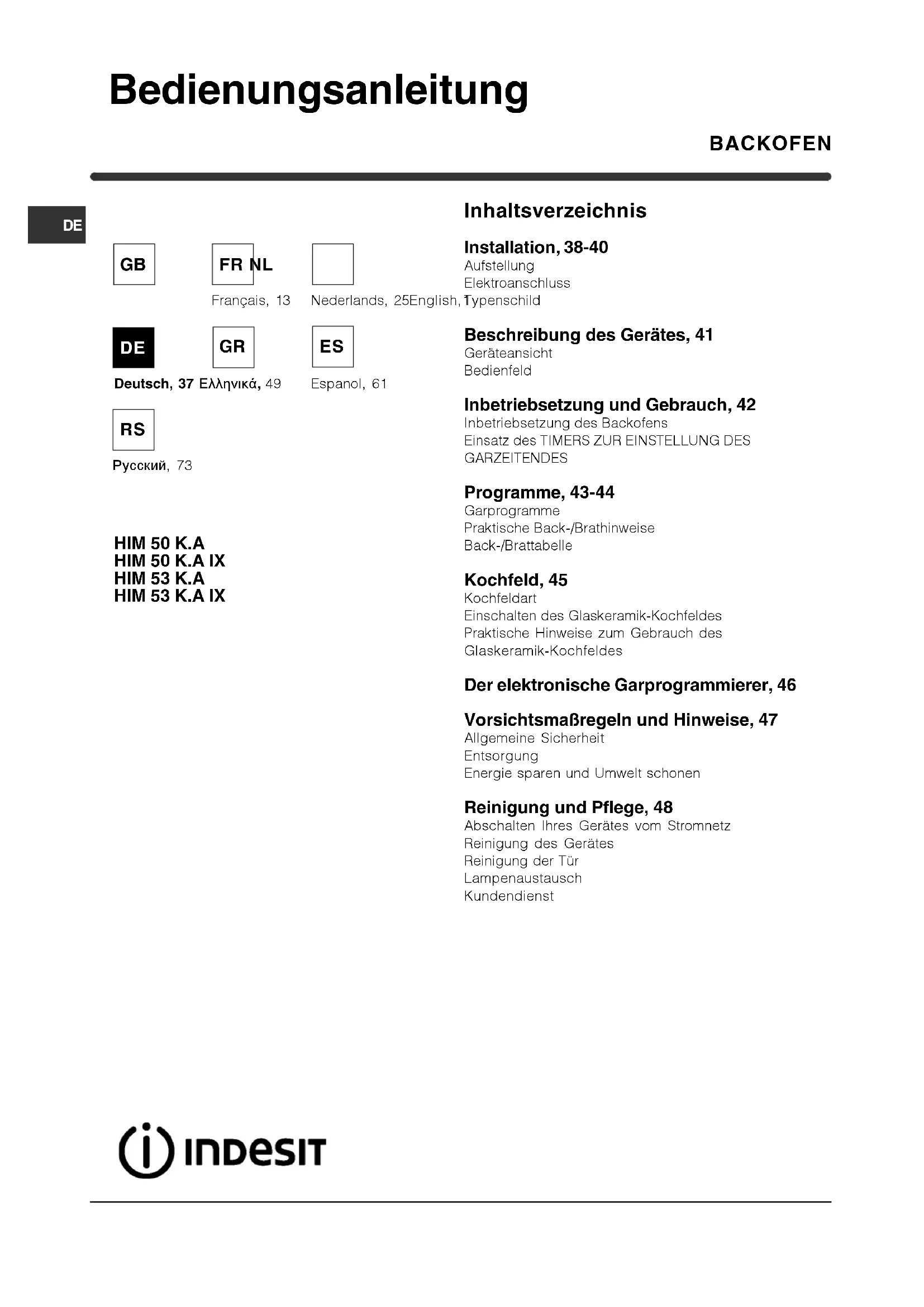 Onderhoud en verzorgingBACKOFEN Inhaltsverzeichnis Installation, 38-40 Aufstellung Elektroanschluss Typenschild Beschreibung des Gerätes, 41 Geräteansicht Bedienfeld Inbetriebsetzung und Gebrauch, 42 Inbetriebsetzung des Backofens Einsatz des TIMERS ZUR EINSTELLUNG DES GARZEITENDES Programme, 43-44 Garprogramme Praktische Back-/Brathinweise Back-/Brattabelle Kochfeld, 45 Kochfeldart Einschalten des Glaskeramik-Kochfeldes Praktische Hinweise zum Gebrauch des Glaskeramik-Kochfeldes Der elektronische Garprogrammierer, 46 Vorsichtsmaßregeln und Hinweise, 47 Allgemeine Sicherheit Entsorgung Energie sparen und Umwelt schonen Reinigung und Pflege, 48 Abschalten Ihres Gerätes vom Stromnetz Reinigung des Gerätes Reinigung der Tür Lampenaustausch Kundendienst Bedienungsanleitung