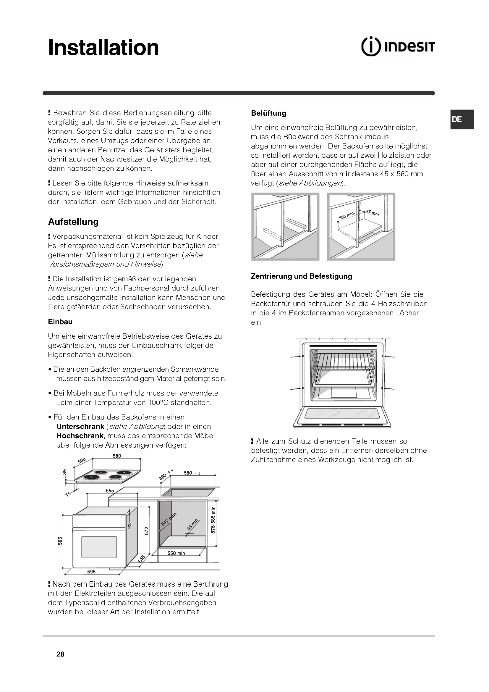 - Für den Einbau des Backofens in einen Unterschrank (siehe Abbildung) oder in einen Hochschrank, muss das entsprechende Möbel über folgende Abmessungen verfügen: ! Nach dem Einbau des Gerätes muss eine Berührung mit den Elektroteilen ausgeschlossen sein. Die auf dem Typenschild enthaltenen Verbrauchsangaben wurden bei dieser Art der Installation ermittelt. Belüftung Um eine einwandfreie Belüftung zu gewährleisten, muss die Rückwand des Schrankumbaus abgenommen werden. Der Backofen sollte möglichst so installiert werden, dass er auf zwei Holzleisten oder aber auf einer durchgehenden Fläche aufliegt, die über einen Ausschnitt von mindestens 45 x 560 mm verfügt (siehe Abbildungen). Zentrierung und Befestigung Befestigung des Gerätes am Möbel: Öffnen Sie die Backofentür und schrauben Sie die 4 Holzschrauben in die 4 im Backofenrahmen vorgesehenen Löcher ein. ! Alle zum Schutz dienenden Teile müssen so befestigt werden, dass ein Entfernen derselben ohne Zuhilfenahme eines Werkzeugs nicht möglich ist.