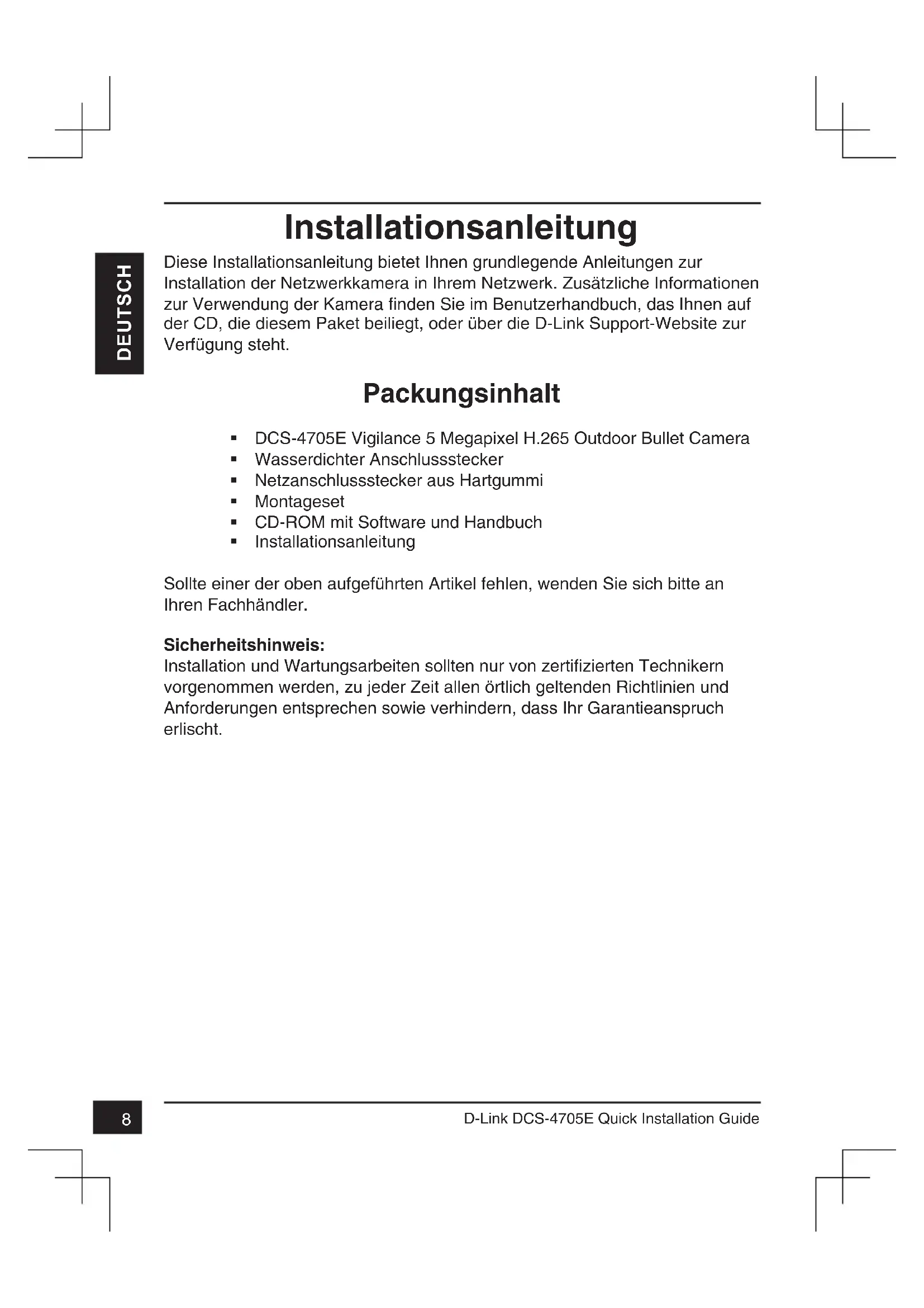 D-Link DCS-4705E Quick Installation Guide DEUTSCH Installationsanleitung Diese Installationsanleitung bietet Ihnen grundlegende Anleitungen zur Installation der Netzwerkkamera in Ihrem Netzwerk. Zusätzliche Informationen zur Verwendung der Kamera finden Sie im Benutzerhandbuch, das Ihnen auf der CD, die diesem Paket beiliegt, oder über die D-Link Support-Website zur Verfügung steht. Packungsinhalt DCS-4705E Vigilance 5 Megapixel H.265 Outdoor Bullet Camera Wasserdichter Anschlussstecker Netzanschlussstecker aus Hartgummi Montageset CD-ROM mit Software und Handbuch Installationsanleitung Sollte einer der oben aufgeführten Artikel fehlen, wenden Sie sich bitte an Ihren Fachhändler. Sicherheitshinweis: Installation und Wartungsarbeiten sollten nur von zertifizierten Technikern vorgenommen werden, zu jeder Zeit allen örtlich geltenden Richtlinien und Anforderungen entsprechen sowie verhindern, dass Ihr Garantieanspruch erlischt.9