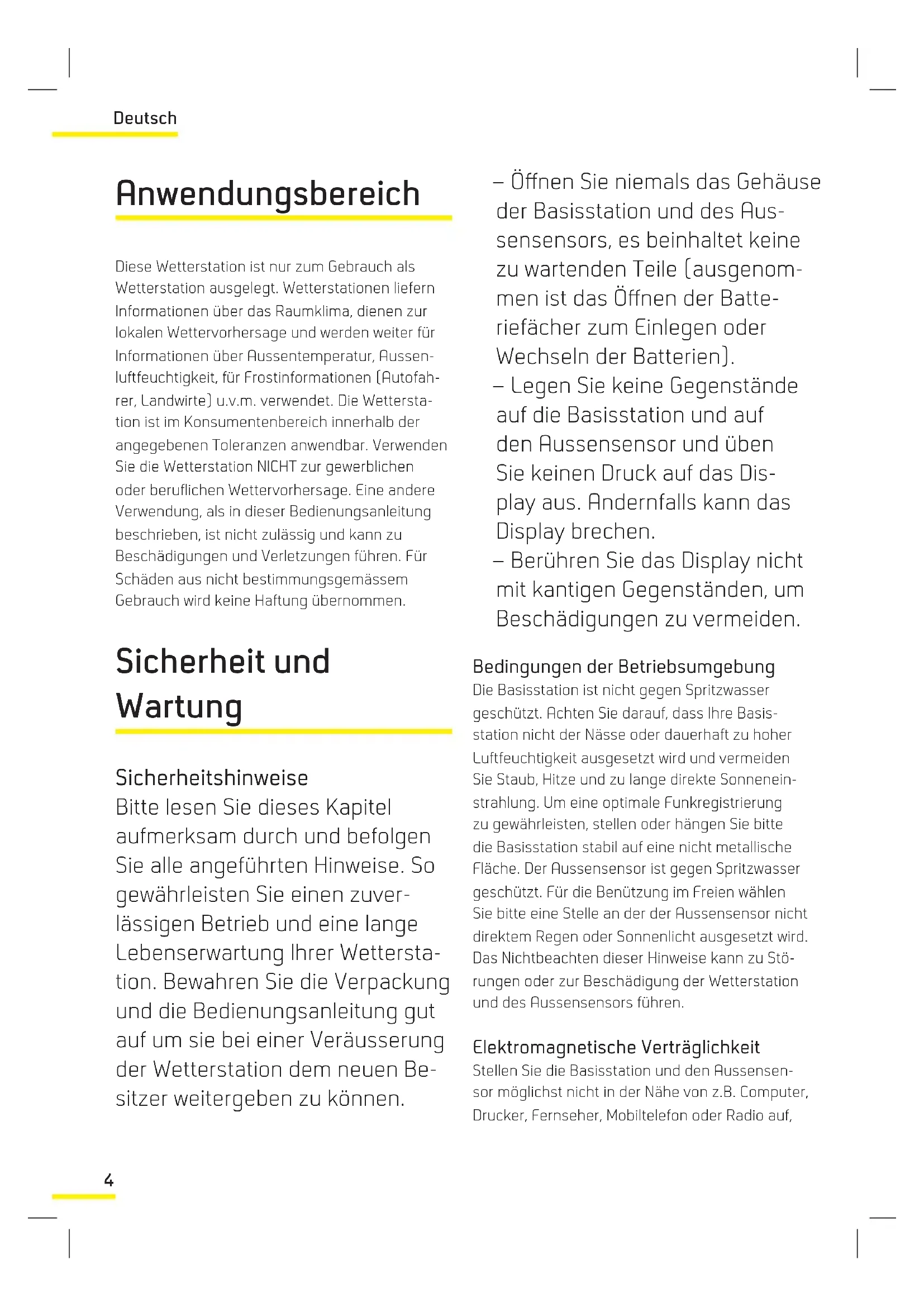 Gratulation! Mit diesem Gerät haben Sie ein Qualitätsprodukt erworben, welches mit grösster Sorgfalt herge- stellt wurde. Es wird Ihnen bei richtiger Pflege während Jahren gute Dienste erweisen. Vor der ersten Inbetriebnahme bitten wir Sie jedoch, die vorliegende Bedienungsanleitung gut durchzule- sen und vor allem die Sicherheitshinweise genau zu beachten. Gratulation! En achetant cet appareil, vous venez d’acquérir un produit de qualité fabriqué avec soin. Bien entretenu, cet appareil vous rendra de grands services pendant de nombreuses années. Veuillez lire attentivement ce mode d’emploi avant la pre- mière utilisation et bien respecter les consignes de sécurité. Congratulazioni! Acquistando questo apparecchio vi siete garantiti un prodotto di qualità, fabbricato con estrema cura. Con una manutenzione adeguata, l’apparec- chio garantirà per anni delle ottime prestazioni. Prima della messa in funzione iniziale vi preghia- mo di leggere attentamente le presenti istruzioni d’uso e di osservare attentamente le avvertenze di sicurezza.3 Sommaire Domaine d'application 14 Sécurité et entretien 14 Mise en service 15 Capteur externe 15 Base 16 Réception radio 17 Montage 17 Description des fonctions 18 Suppression des défauts 21 Caractéristiques techniques 22 Elimination 22 Conformité 23 Garantie 23 Inhaltsverzeichnis Anwendungsbereich 4 Sicherheit und Wartung 4 Inbetriebnahme 5 Aussensensor 6 Basisstation 6 Funkempfang 7 Montage 8 Funktionsbeschreibung 8 Fehlerbehebung 11 Technische Daten 12 Entsorgung 12 Konformität 13 Garantie 13 Indice Campo di applicazione 24 Sicurezza e manutenzione 24 Messa in funzione 25 Sensore esterno 26 Stazione base 26 Ricezione del segnale radio 27 Montaggio 28 Descrizione delle funzioni 28 Riparazione dei guasti 31 Dati technici 32 Smaltimento 32 Conformità 33 Garanzia 334 Deutsch Anwendungsbereich Diese Wetterstation ist nur zum Gebrauch als Wetterstation ausgelegt. Wetterstationen liefern Informationen über das Raumklima, dienen zur lokalen Wettervorhersage und werden weiter für Informationen über Aussentemperatur, Aussen- luftfeuchtigkeit, für Frostinformationen (Autofah- rer, Landwirte) u.v.m. verwendet. Die Wettersta- tion ist im Konsumentenbereich innerhalb der angegebenen Toleranzen anwendbar. Verwenden Sie die Wetterstation NICHT zur gewerblichen oder beruflichen Wettervorhersage. Eine andere Verwendung, als in dieser Bedienungsanleitung beschrieben, ist nicht zulässig und kann zu Beschädigungen und Verletzungen führen. Für Schäden aus nicht bestimmungsgemässem Gebrauch wird keine Haftung übernommen. Sicherheit und Wartung Sicherheitshinweise Bitte lesen Sie dieses Kapitel aufmerksam durch und befolgen Sie alle angeführten Hinweise. So gewährleisten Sie einen zuver- lässigen Betrieb und eine lange Lebenserwartung Ihrer Wettersta- tion. Bewahren Sie die Verpackung und die Bedienungsanleitung gut auf um sie bei einer Veräusserung der Wetterstation dem neuen Be- sitzer weitergeben zu können. – Öffnen Sie niemals das Gehäuse der Basisstation und des Aus- sensensors, es beinhaltet keine zu wartenden Teile (ausgenom- men ist das Öffnen der Batte- riefächer zum Einlegen oder Wechseln der Batterien). – Legen Sie keine Gegenstände auf die Basisstation und auf den Aussensensor und üben Sie keinen Druck auf das Dis- play aus. Andernfalls kann das Display brechen. – Berühren Sie das Display nicht mit kantigen Gegenständen, um Beschädigungen zu vermeiden. Bedingungen der Betriebsumgebung Die Basisstation ist nicht gegen Spritzwasser geschützt. Achten Sie darauf, dass Ihre Basis- station nicht der Nässe oder dauerhaft zu hoher Luftfeuchtigkeit ausgesetzt wird und vermeiden Sie Staub, Hitze und zu lange direkte Sonnenein- strahlung. Um eine optimale Funkregistrierung zu gewährleisten, stellen oder hängen Sie bitte die Basisstation stabil auf eine nicht metallische Fläche. Der Aussensensor ist gegen Spritzwasser geschützt. Für die Benützung im Freien wählen Sie bitte eine Stelle an der der Aussensensor nicht direktem Regen oder Sonnenlicht ausgesetzt wird. Das Nichtbeachten dieser Hinweise kann zu Stö- rungen oder zur Beschädigung der Wetterstation und des Aussensensors führen. Elektromagnetische Verträglichkeit Stellen Sie die Basisstation und den Aussensen- sor möglichst nicht in der Nähe von z.B. Computer, Drucker, Fernseher, Mobiltelefon oder Radio auf,5 Deutsch da Geräte mit starker EMC-Strahlung sowie andere Funkstationen den Funkempfang stören oder behindern können. Batterien (im Lieferumfang enthalten) Ihre Basisstation und der Aussensensor wird mit jeweils zwei 1,5V AA Batterien betrieben. Nach-stehend finden Sie einige Hinweise zum Umgang mit den Batterien: Ersetzen Sie die Batterien nur durch einen gleichwertigen Batterietyp. Batterien dürfen nicht geladen oder mit anderen Mitteln reaktiviert, nicht auseinander genommen, ins Feuer geworfen oder kurzgeschlossen werden. Bewahren Sie die Batterien immer ausserhalb der Reichweite von Kindern auf. Batterien können bei Verschlucken lebensgefährlich sein. Bewahren Sie die Batterien und die Wetterstation deshalb für Kleinkinder unerreichbar auf. Wurde eine Batterie verschluckt, muss sofort medizinische Hilfe in Anspruch genommen werden. Batterien vertragen keine Hitze. Vermeiden Sie, dass sich die Basisstation bzw. der Aussensensor und somit die eingelegten Batterien zu stark erhitzen. Die Missachtung dieser Hinweise kann zur Beschädi- gung und unter Umständen gar zur Explosion der Batterien führen. Temperaturen unter 0°C können sich negativ auf die Lebensdauer der Batterien auswirken. Hinweis Bitte platzieren Sie den Aussensensor so, dass er nicht extremer Hitze oder Kälte ausgesetzt wird. Bei extremer Kälte werden die Batterien und somit das Sendesignal geschwächt. Wir empfehlen, die Wetterstation nicht mit Akkus sondern mit Batterien zu betreiben. Inbetriebnahme Wir empfehlen Ihnen, die Bedienungsanleitung aufmerksam durchzules