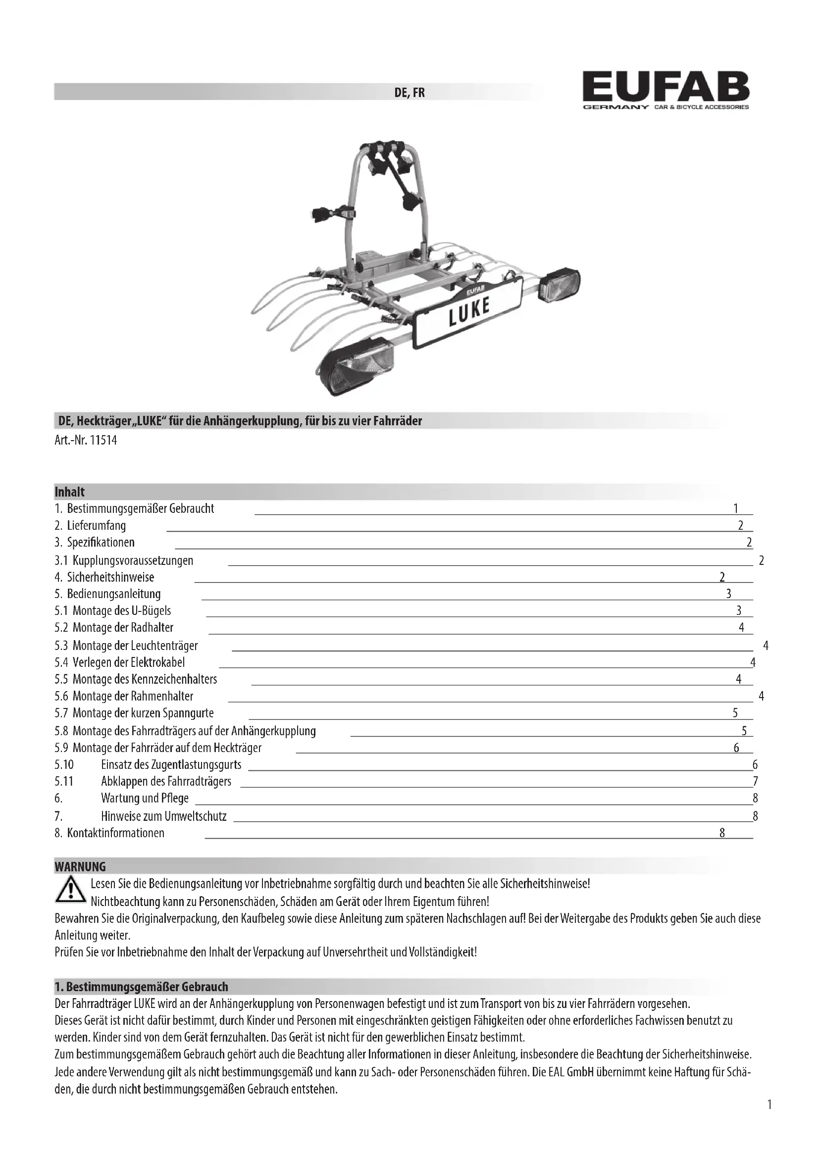 Der Fahrradträger LUKE wird an der Anhängerkupplung von Personenwagen befestigt und ist zum Transport von bis zu vier Fahrrädern vorgesehen. Dieses Gerät ist nicht dafür bestimmt, durch Kinder und Personen mit eingeschränkten geistigen Fähigkeiten oder ohne erforderliches Fachwissen benutzt zu werden. Kinder sind von dem Gerät fernzuhalten. Das Gerät ist nicht für den gewerblichen Einsatz bestimmt. Zum bestimmungsgemäßem Gebrauch gehört auch die Beachtung aller Informationen in dieser Anleitung, insbesondere die Beachtung der Sicherheitshinweise. Jede andere Verwendung gilt als nicht bestimmungsgemäß und kann zu Sach- oder Personenschäden führen. Die EAL GmbH übernimmt keine Haftung für Schä- den, die durch nicht bestimmungsgemäßen Gebrauch entstehen. DE, FR DE, Heckträger „LUKE“ für die Anhängerkupplung, für bis zu vier Fahrräder2