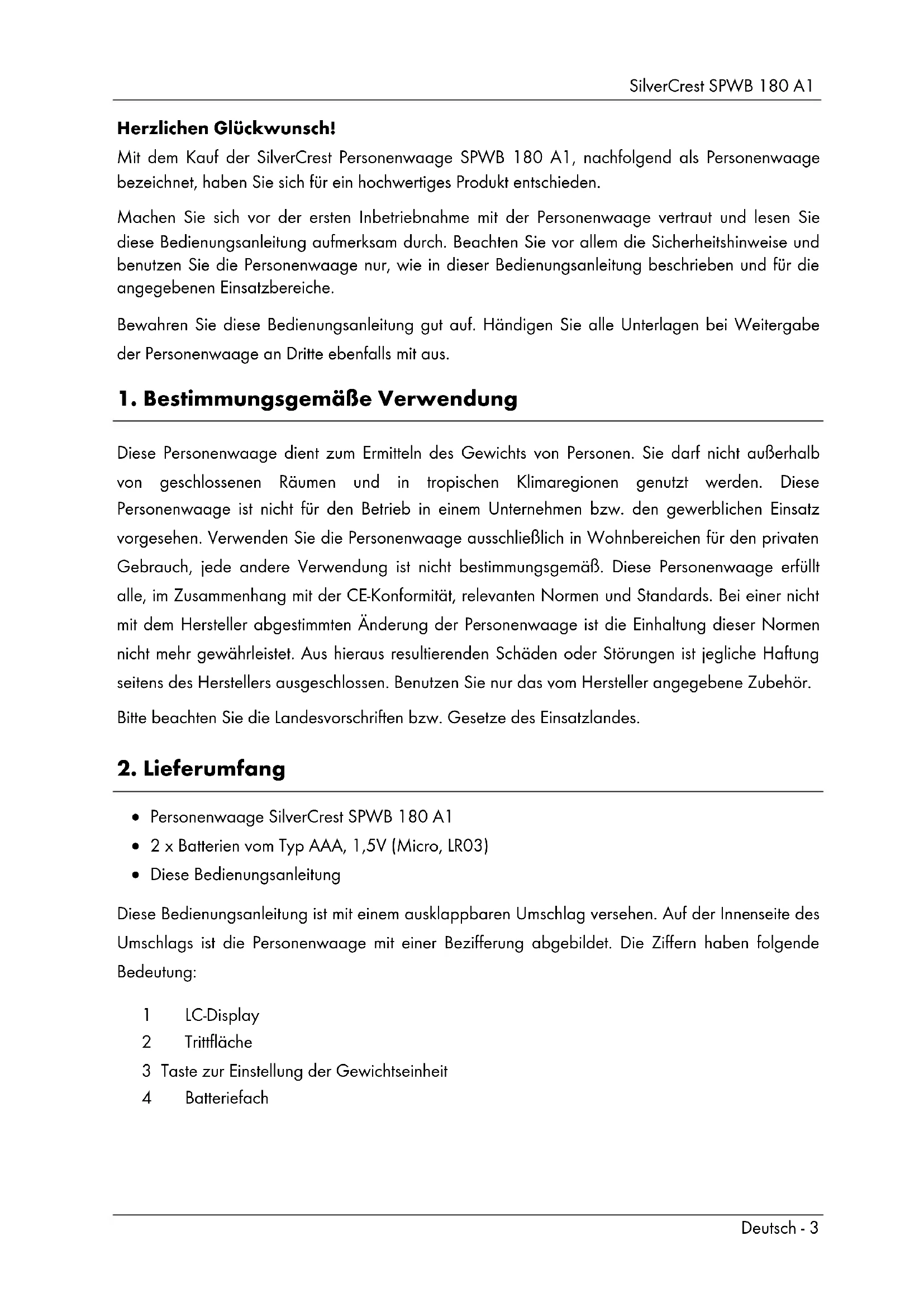Personenwaage SilverCrest SPWB 180 A1 2 x Batterien vom Typ AAA, 1,5V (Micro, LR03) Diese Bedienungsanleitung Diese Bedienungsanleitung ist mit einem ausklappbaren Umschlag versehen. Auf der Innenseite des Umschlags ist die Personenwaage mit einer Bezifferung abgebildet. Die Ziffern haben folgende Bedeutung: 1 LC-Display 2 Trittfläche 3 Taste zur Einstellung der Gewichtseinheit 4 BatteriefachSilverCrest SPWB 180 A1