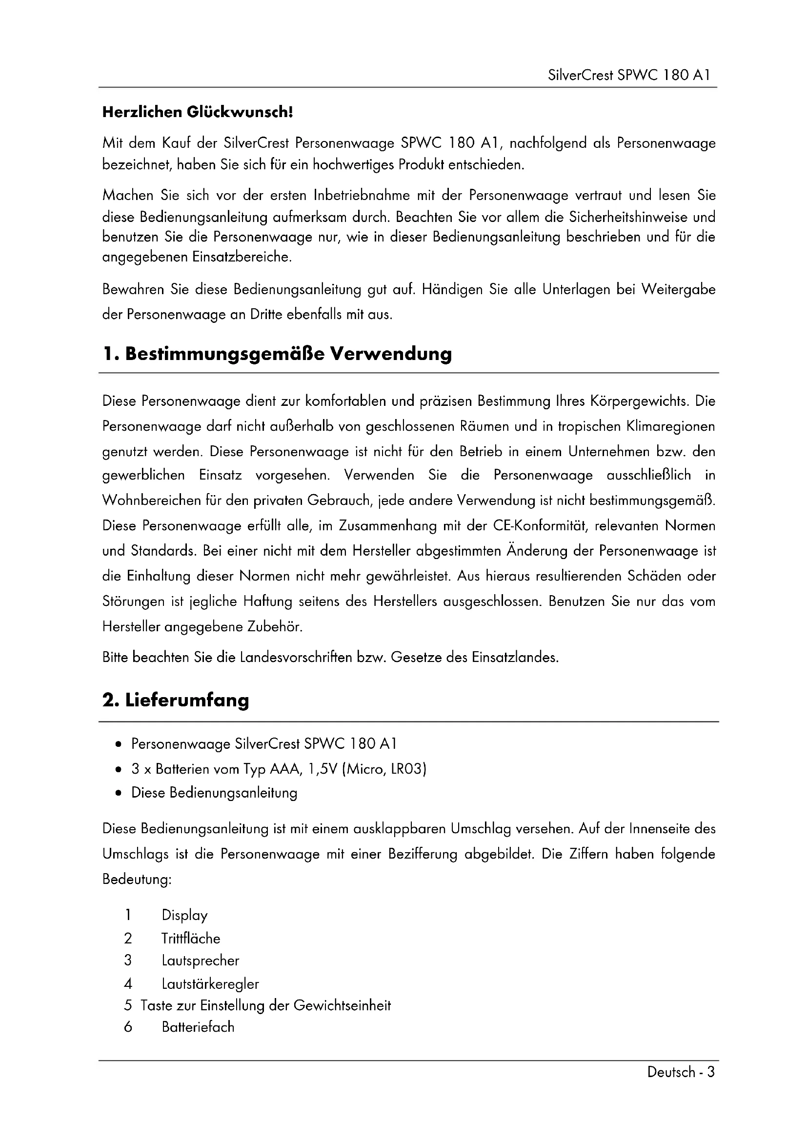 Personenwaage SilverCrest SPWC 180 A1 3 x Batterien vom Typ AAA, 1,5V (Micro, LR03) Diese Bedienungsanleitung Diese Bedienungsanleitung ist mit einem ausklappbaren Umschlag versehen. Auf der Innenseite des Umschlags ist die Personenwaage mit einer Bezifferung abgebildet. Die Ziffern haben folgende Bedeutung: 1 Display 2 Trittfläche 3 Lautsprecher 4 Lautstärkeregler 5 Taste zur Einstellung der Gewichtseinheit 6 BatteriefachSilverCrest SPWC 180 A1