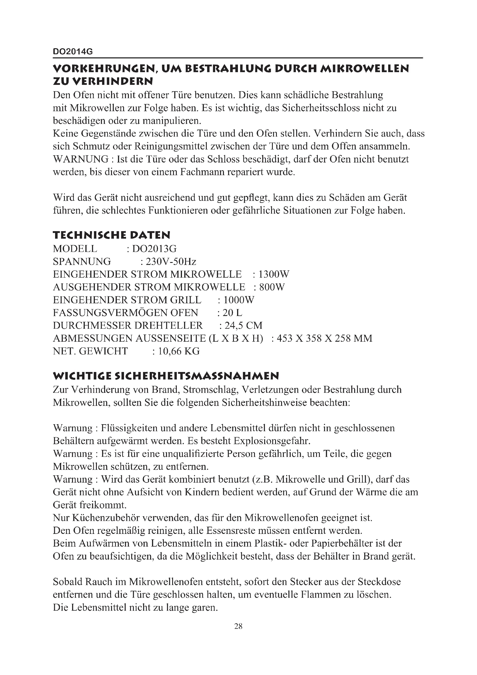 WICHTIGE SICHERHEITSMASSNAHMEN Zur Verhinderung von Brand, Stromschlag, Verletzungen oder Bestrahlung durch Mikrowellen, sollten Sie die folgenden Sicherheitshinweise beachten: Warnung : Flüssigkeiten und andere Lebensmittel dürfen nicht in geschlossenen Behältern aufgewärmt werden. Es besteht Explosionsgefahr. Warnung : Es ist für eine unqualizierte Person gefährlich, um Teile, die gegen Mikrowellen schützen, zu entfernen. Warnung : Wird das Gerät kombiniert benutzt (z.B. Mikrowelle und Grill), darf das Gerät nicht ohne Aufsicht von Kindern bedient werden, auf Grund der Wärme die am Gerät freikommt. Nur Küchenzubehör verwenden, das für den Mikrowellenofen geeignet ist. Den Ofen regelmäßig reinigen, alle Essensreste müssen entfernt werden. Beim Aufwärmen von Lebensmitteln in einem Plastik- oder Papierbehälter ist der Ofen zu beaufsichtigen, da die Möglichkeit besteht, dass der Behälter in Brand gerät. Sobald Rauch im Mikrowellenofen entsteht, sofort den Stecker aus der Steckdose entfernen und die Türe geschlossen halten, um eventuelle Flammen zu löschen. Die Lebensmittel nicht zu lange garen. 28DO2014G Den Ofen nicht verwenden, um Dinge darin aufzubewahren. Kein Brot, Kekse usw. im Ofen aufbewahren. Drahtverschlüsse und Metallhandgriffe von der Verpackung entfernen, bevor diese in den Ofen gestellt wird. Den Ofen nur gemäß Installationsanweisungen installieren. Eier mit Schale oder ganze hart gekochte Eier dürfen nicht im Mikrowellenofen aufgewärmt werden. Diese könnten explodieren, selbst nachdem der Ofen ausgeschaltet ist. Das Gerät nur, wie in der Betriebsanleitung beschrieben steht, verwenden. Keine schädlichen Chemikalien oder Dämpfe in diesem Gerät verwenden. Dieser Ofen ist nur zum Erhitzen gedacht. Das Gerät ist nicht für industrielle oder Laborzwecke geeignet. Ist das elektrische Kabel beschädigt, muss es vom Hersteller, dem Kundendienst des Herstellers oder einem Fachmann ausgetauscht werden, um Unfälle oder Schäden zu verhindern. Das Gerät nicht außer Hause verwenden oder verwahren. Den Ofen nicht in der Nähe von Wasser, in feuchten Räumen oder in der Nähe eines Schwimmbads verwenden. Der Ofen kann während des Gebrauchs warm werden. Das elektrische Kabel von heißen Teilen entfernt halten und den Ofen nicht abdecken. Das Kabel nicht über den Tisch- oder Büffetrand hängen lassen. Wird der Ofen nicht gut gepegt, kann dies Schäden am Gerät oder eventuell gefährliche Situationen verursachen. Der Inhalt von Babyäschchen und Babynahrung muss immer geschüttelt oder gerührt werden. Die Temperatur muss kontrolliert werden, bevor die Nahrungsmittel konsumiert werden, um Brandwunden zu verhindern. Das Aufwärmen von Flüssigkeiten im Ofen kann zu einer nachträglichen Kochreaktion der Flüssigkeit führen. Es ist deshalb immer Vorsicht geboten, wenn der Behälter aus dem Ofen genommen wird. Das Gerät darf nicht von Personen (einschließlich Kindern) mit eingeschränkten körperlichen, sensorischen oder mentalen Fähigkeiten bedient werden. Außer wenn diese Personen das Gerät unter Aufsicht bedienen oder von einer Person, die für ihre Sicherheit verantwortlich ist, ausreichende Anweisungen erhalten haben, wie sie das Gerät bedienen sollten. Sorgen Sie dafür, dass Kinder nicht mit dem Gerät spielen können. Das Gerät darf nicht in einen Schrank gestellt werden. Das Gerät darf nicht mit einem externen Timer oder einer extra Fernbedienung bedient werden. Keinen Dampfreiniger zum Reinigen des Geräts verwenden. Keine aggressiven Reinigungsmittel oder scharfe Gegenstände verwenden, um das Glas der Türe zu reinigen, dies könnte das Glas beschädigen und Sprünge im Glas verursachen. 29DO2014G Die Türe des Geräts kann während des Gebrauchs warm werden. Dieses Gerät ist für den Einsatz im Haushalt oder in einem ähnlichen Umfeld geeignet wie zum Beispiel: - Küchenecke für Personal von Geschäften, Büros und ähnlichen beruichen Umgebungen - Bauernhöfe - Hotel- und Motelzimmer und andere Umgebungen mit einem residenzartigen Charakter - Gästezimmer oder ähnliche Zimmer DIESE WARNUNGEN AUFBEWAHREN,