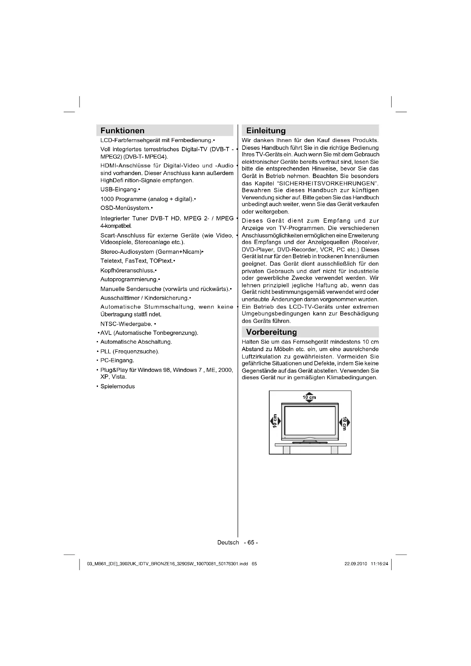 - Digitaler Empfang (DVB-T) 03_MB61_[DE]_3902UK_IDTV_BRONZE16_32905W_10070081_50176301.indd 6403_MB61_[DE]_3902UK_IDTV_BRONZE16_32905W_10070081_50176301.indd 64 22.09.2010 11:16:2422.09.2010 11:16:24Deutsch - 65 - Funktionen LCD-Farbfernsehgerät mit Fernbedienung.• Voll integriertes terrestrisches Digital-TV (DVB-T - • MPEG2) (DVB-T- MPEG4). HDMI-Anschlüsse für Digital-Video und -Audio • sind vorhanden. Dieser Anschluss kann außerdem HighDefi nition-Signale empfangen. USB-Eingang.• 1000 Programme (analog + digital).• OSD-Menüsystem.• Integrierter Tuner DVB-T HD, MPEG 2- / MPEG • 4-kompatibel. Scart-Anschluss für externe Geräte (wie Video, • Videospiele, Stereoanlage etc.). Stereo-Audiosystem (German+Nicam)• Teletext, FasText, TOPtext.• Kopfhöreranschluss.• Autoprogrammierung.• Manuelle Sendersuche (vorwärts und rückwärts).• Ausschalttimer / Kindersicherung.• Automatische Stummschaltung, wenn keine • Übertragung stattfi ndet. NTSC-Wiedergabe. • AVL (Automatische Tonbegrenzung).• Automatische Abschaltung.• PLL (Frequenzsuche).• PC-Eingang. • Plug&Play für Windows 98, Windows 7 , ME, 2000, • XP, Vista. Spielemodus • Einleitung Wir danken Ihnen für den Kauf dieses Produkts. Dieses Handbuch führt Sie in die richtige Bedienung Ihres TV-Geräts ein. Auch wenn Sie mit dem Gebrauch elektronischer Geräte bereits vertraut sind, lesen Sie bitte die entsprechenden Hinweise, bevor Sie das Gerät in Betrieb nehmen. Beachten Sie besonders das Kapitel “SICHERHEITSVORKEHRUNGEN”. Bewahren Sie dieses Handbuch zur künftigen Verwendung sicher auf. Bitte geben Sie das Handbuch unbedingt auch weiter, wenn Sie das Gerät verkaufen oder weitergeben. Dieses Gerät dient zum Empfang und zur Anzeige von TV-Programmen. Die verschiedenen Anschlussmöglichkeiten ermöglichen eine Erweiterung des Empfangs und der Anzeigequellen (Receiver, DVD-Player, DVD-Recorder, VCR, PC etc.) Dieses Gerät ist nur für den Betrieb in trockenen Innenräumen geeignet. Das Gerät dient ausschließlich für den privaten Gebrauch und darf nicht für industrielle oder gewerbliche Zwecke verwendet werden. Wir lehnen prinzipiell jegliche Haftung ab, wenn das Gerät nicht bestimmungsgemäß verwendet wird oder unerlaubte Änderungen daran vorgenommen wurden. Ein Betrieb des LCD-TV-Geräts unter extremen Umgebungsbedingungen kann zur Beschädigung des Geräts führen. Vorbereitung Halten Sie um das Fernsehgerät mindestens 10 cm Abstand zu Möbeln etc. ein, um eine ausreichende Luftzirkulation zu gewährleisten. Vermeiden Sie gefährliche Situationen und Defekte, indem Sie keine Gegenstände auf das Gerät abstellen. Verwenden Sie dieses Gerät nur in gemäßigten Klimabedingungen. 10 cm 10 cm 10 cm 03_MB61_[DE]_3902UK_IDTV_BRONZE16_32905W_10070081_50176301.indd 6503_MB61_[DE]_3902UK_IDTV_BRONZE16_32905W_10070081_50176301.indd 65 22.09.2010 11:16:2422.09.2010 11:16:24Deutsch - 66 - Sicherheitsvorkehrungen Lesen Sie bitte zu Ihrer eigenen Sicherheit die folgenden Sicherheitshinweise sorgfältig durch. Stromquelle Das Gerät darf nur an einer Netzsteckdose mit 220- 240 V Wechselspannung und einer Frequenz von 50 Hz betrieben werden. Stellen Sie sicher, dass Sie die richtige Spannung auswählen. Netzkabel Stellen Sie keine Gegenstände auf das Netzkabel (weder das Gerät selbst, noch Möbel usw.) und klemmen Sie das Kabel nicht ein. Der Netzstecker und die Steckdose, an der das Netzkabel angesteckt ist, muss jederzeit zugänglich sein. Das Netzkabel darf nur am Stecker gehandhabt werden Stecken Sie das Gerät niemals durch Ziehen am Kabel aus und berühren Sie das Netzkabel niemals mit nassen Händen, da dies zu einem Kurzschluss oder zu einem Stromschlag führen kann. Machen Sie niemals Knoten in das Kabel, und binden Sie es nie mit anderen Kabeln zusammen. Das Netzkabel muss so verlegt werden, dass niemand auf das Kabel treten kann. Beschädigungen am Netzkabel können zu Bränden oder Stromschlägen führen. Wenn das Netzkabel beschädigt ist und ausgetauscht werden muss, darf dies nur durch qualifi zierte Personen erfolgen. Feuchtigkeit und Wasser Verwenden Sie dieses Gerät nicht in feuchter oder dunstiger Umgebung (vermeiden Sie das Badezimmer, die Spüle in der Küche oder die Umgebung der Waschmaschine). Achten Sie darauf, dass dieses Gerät niemals Regen oder Wasser ausgesetzt ist und stellen Sie keine mit Flüssigkeit gefüllten Gefäße, wie zum Beispiel Blumenvasen auf dem Gerät ab. Meiden Sie Tropf- und Spritzwasser. Sollte ein Gegenstand oder Flüssigkeit in das Gerät eindringen, müssen Sie das Gerät vom Stromnetz trennen und durch eine qualifizierte Fachkraft überprüfen lassen, bevor es wieder betrieben werden kann. Reinigung Ziehen Sie vor der Reinigung des Geräts den Netzstecker aus der Steckdose. Verwenden Sie keine Flüssig-oder Sprühreiniger. Benutzen Sie ein weiches und trockenes Tuch. Belüftung Die Schlitze und Öffnungen des Geräts dienen der Belüftung und sollen einen reibungslosen Betrieb gewährleisten. Um eine Überhitzung zu vermeiden, sollten diese Öffnungen niemals blockiert oder abgedeckt werden. Hitze und offenes Feuer Das Gerät darf weder offenem Feuer noch anderen Quellen intensiver Hitzestrahlung, wie elektrischen Radiatoren, ausgesetzt werden. Stellen Sie sicher, dass keine offenen Flammen, wie z. B. brennende Kerzen, auf das Gerät gestellt werden. Batterien dürfen niemals zu großer Hitze wie direkter Sonneneinstrahlung, Feuer od. dgl. ausgesetzt werden. Gewitter Trennen Sie das Netzkabel von der Steckdose, falls es Sturm oder Gewitter gibt oder das Gerät längere Zeit nicht benutzt wird (z. B., wenn Sie in den Urlaub fahren). Ersatzteile Falls Ihr Gerät ein Ersatzteil benötigt, stellen Sie sicher, dass die Person, die die Reparatur vornimmt, Teile verwendet, die vom Hersteller genehmigt wurden oder die gleichen Eigenschaften besitzen wie das Originalteil. Nicht zugelassene Ersatzteile könnten Brände, elektrische Schläge oder 