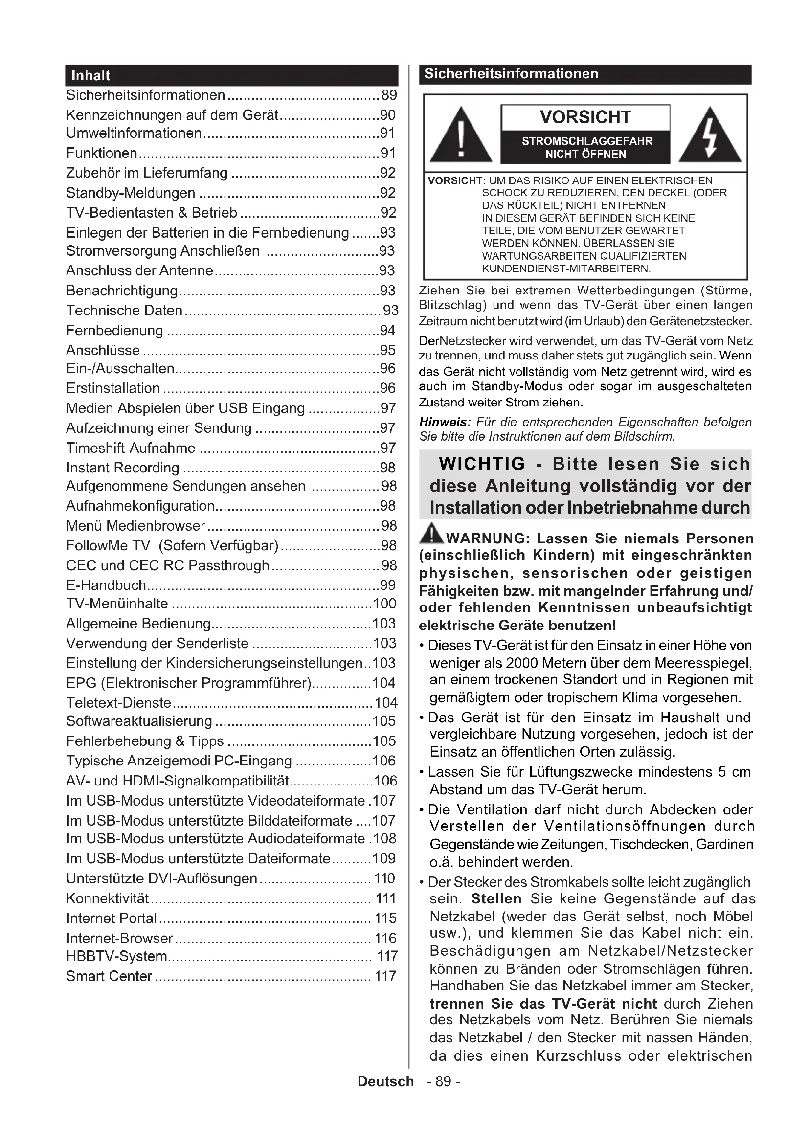 - Smart Center Sicherheitsinformationen VORSICHT STROMSCHLAGGEFAHR NICHT ÖFFNEN VORSICHT: UM DAS RISIKO AUF EINEN ELEKTRISCHEN SCHOCK ZU REDUZIEREN, DEN DECKEL (ODER DAS RÜCKTEIL) NICHT ENTFERNEN IN DIESEM GERÄT BEFINDEN SICH KEINE TEILE, DIE VOM BENUTZER GEWARTET WERDEN KÖNNEN. ÜBERLASSEN SIE WARTUNGSARBEITEN QUALIFIZIERTEN KUNDENDIENST-MITARBEITERN. Hinweis: Für die entsprechenden Eigenschaften befolgen Sie bitte die Instruktionen auf dem Bildschirm. Ziehen Sie bei extremen Wetterbedingungen (Stürme, Blitzschlag) und wenn das TV-Gerät über einen langen Zeitraum nicht benutzt wird (im Urlaub) den Gerätenetzstecker. DerNetzstecker wird verwendet, um das TV-Gerät vom Netz zu trennen, und muss daher stets gut zugänglich sein. Wenn das Gerät nicht vollständig vom Netz getrennt wird, wird es auch im Standby-Modus oder sogar im ausgeschalteten Zustand weiter Strom ziehen. WICHTIG - Bitte lesen Sie sich diese Anleitung vollständig vor der Installation oder Inbetriebnahme durch WARNUNG: Lassen Sie niemals Personen (einschließlich Kindern) mit eingeschränkten physischen, sensorischen oder geistigen Fähigkeiten bzw. mit mangelnder Erfahrung und/ oder fehlenden Kenntnissen unbeaufsichtigt elektrische Geräte benutzen! p. 117