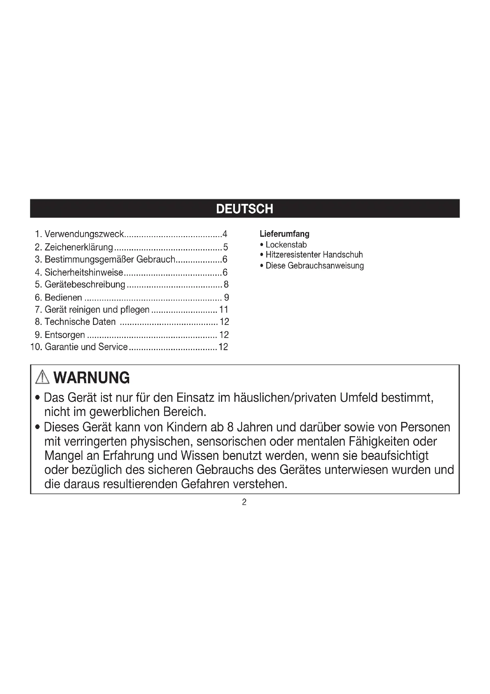Der Lockenstab darf ausschließlich zum Formen von Locken/Wellen der menschlichen Kopfhaare in Eigenanwendung für den Privatgebrauch verwendet werden! Warnung Verwenden Sie das Gerät ausschließlich: