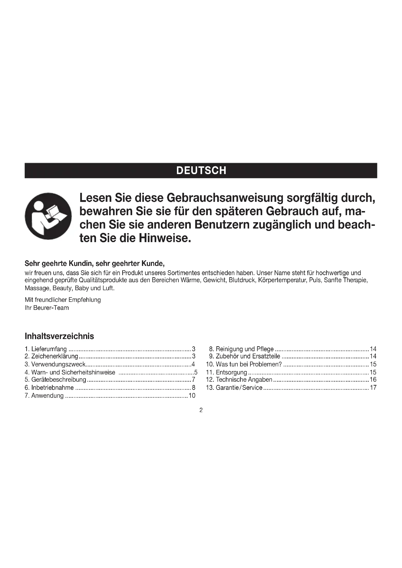 chen Sie sie anderen Benutzern zugänglich und beach- ten Sie die Hinweise. Sehr geehrte Kundin, sehr geehrter Kunde, wir freuen uns, dass Sie sich für ein Produkt unseres Sortimentes entschieden haben. Unser Name steht für hochwertige und eingehend geprüfte Qualitätsprodukte aus den Bereichen Wärme, Gewicht, Blutdruck, Körpertemperatur, Puls, Sanfte Therapie, Massage, Beauty, Baby und Luft. Mit freundlicher Empfehlung Ihr Beurer-Team Inhaltsverzeichnis